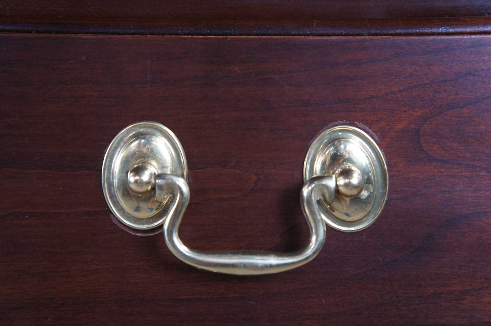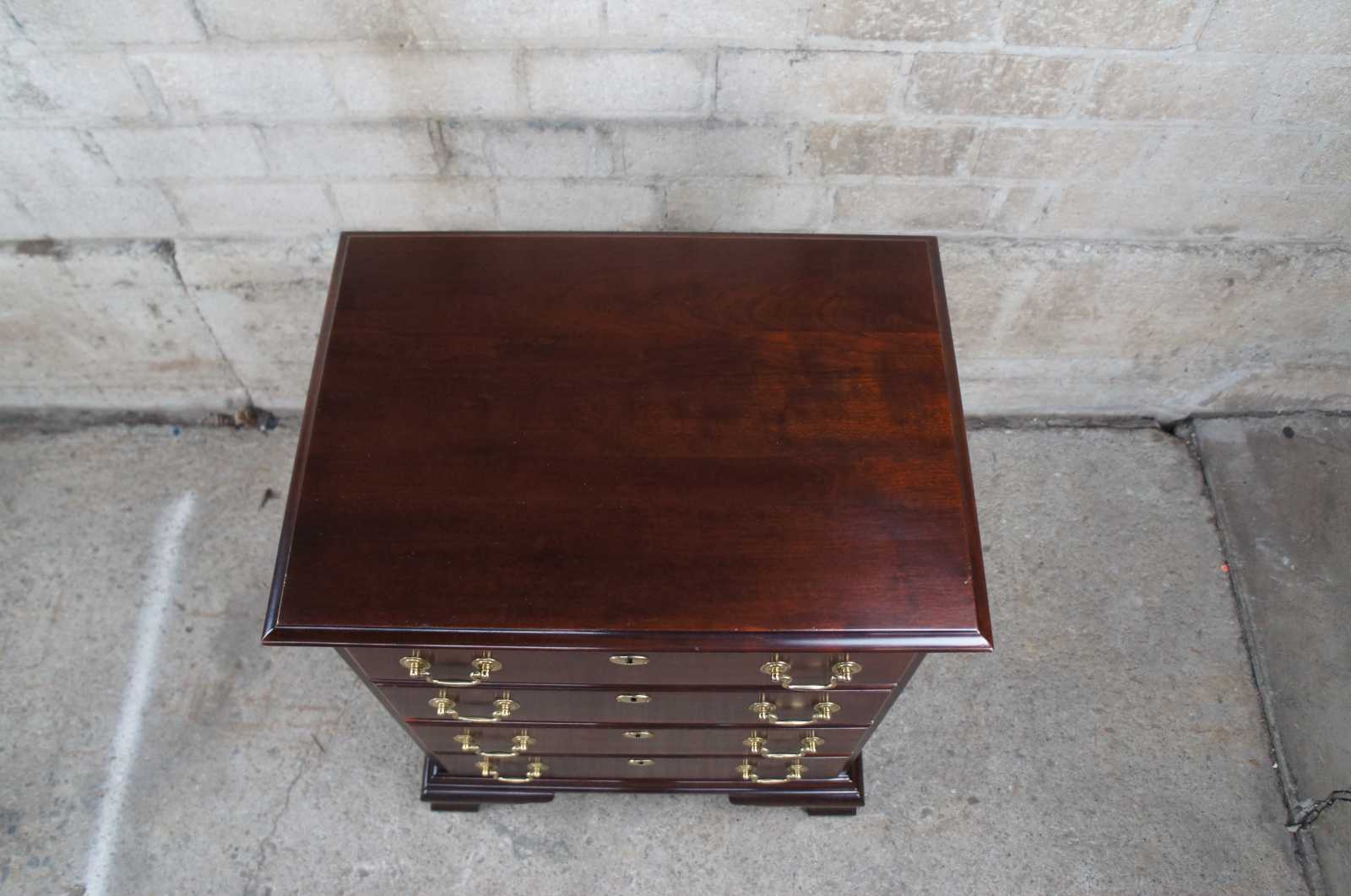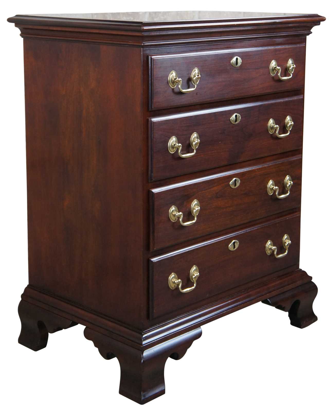 Two Vintage Statton Trutype Americana Old Towne nightstands or bedside tables, circa last quarter 20th century. Made of solid cherry featuring four drawers with brass hardware and bracket feet.