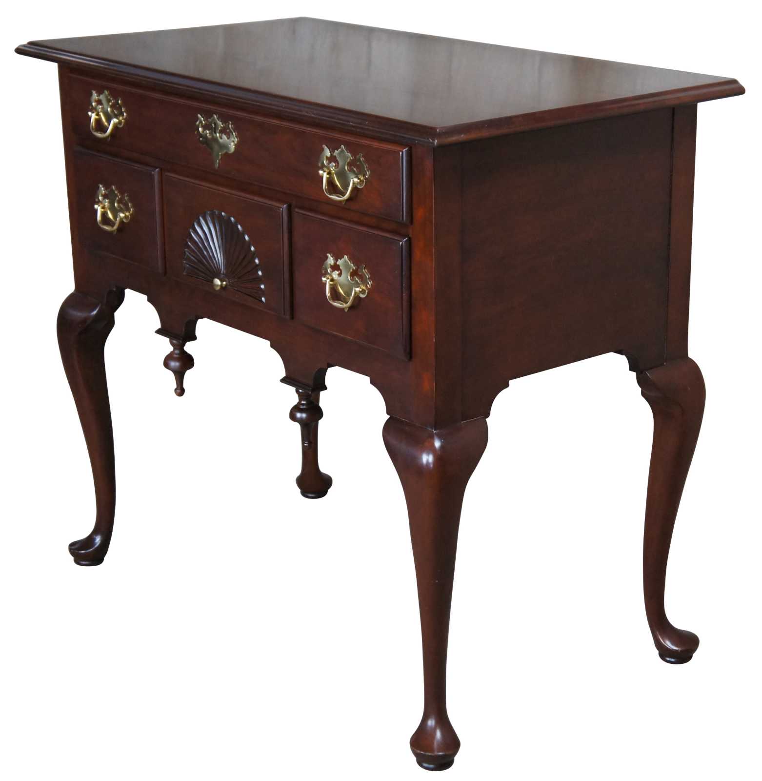 Vintage cherry lowboy from Statton's Private Collection, featuring Queen Anne and Federal styling with a rectangular top over four drawers with brass hardware, serpentine legs, pad feet, carved fan and drop pendants.