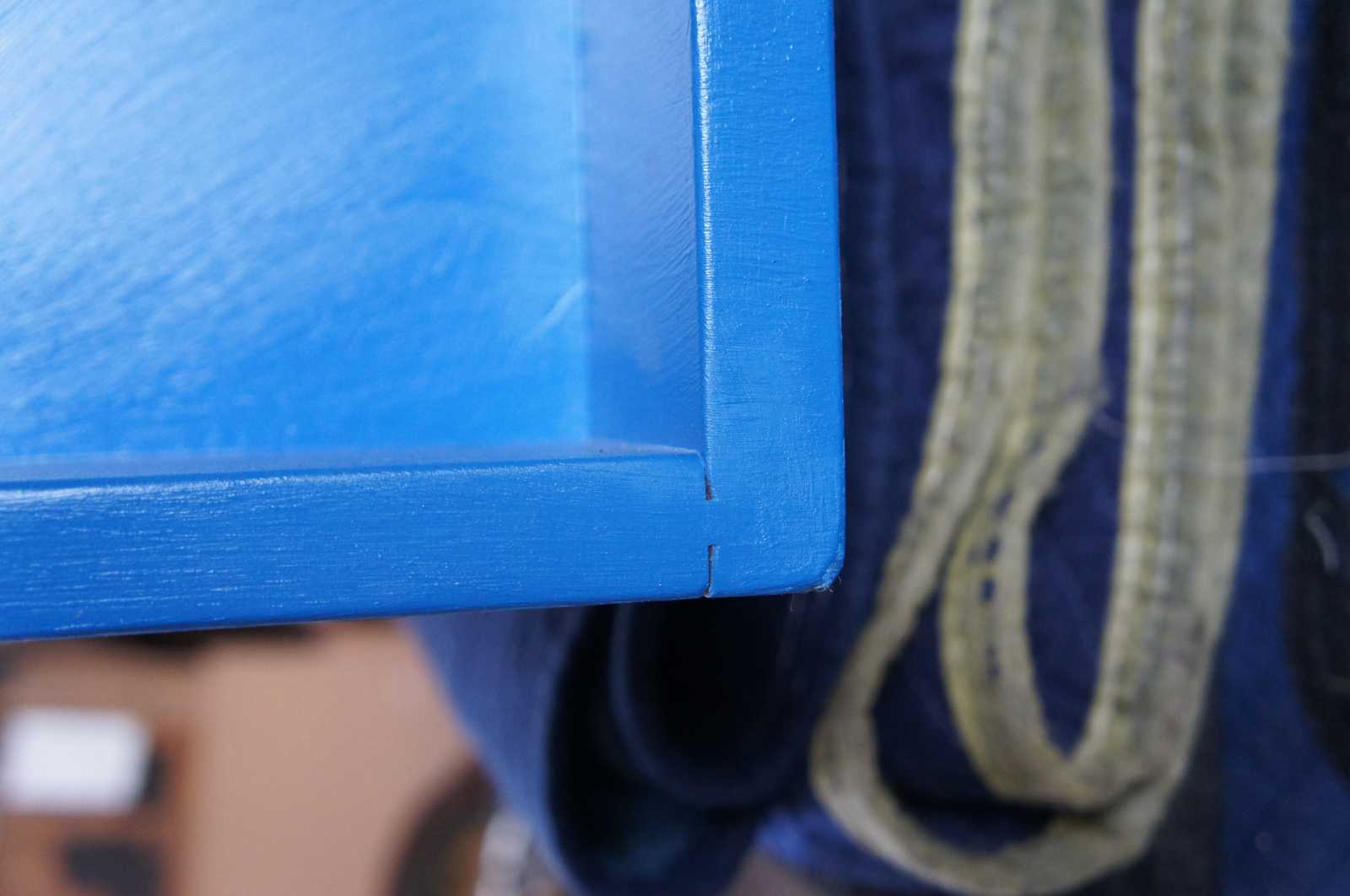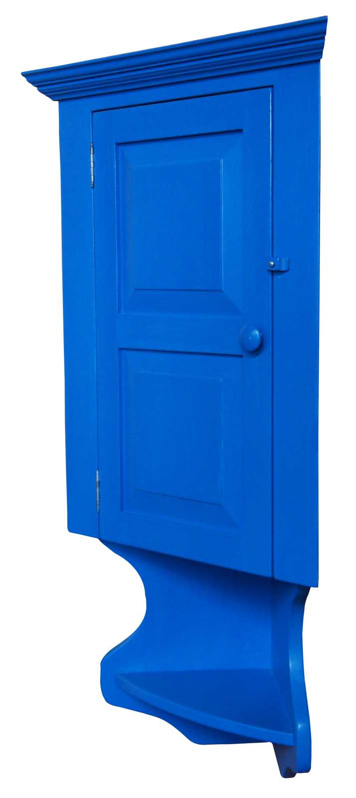 Vintage Roscoe Village Early American style wall hanging corner cabinet featuring a paneled door with tiered shelving and painted in an electric blue finish.