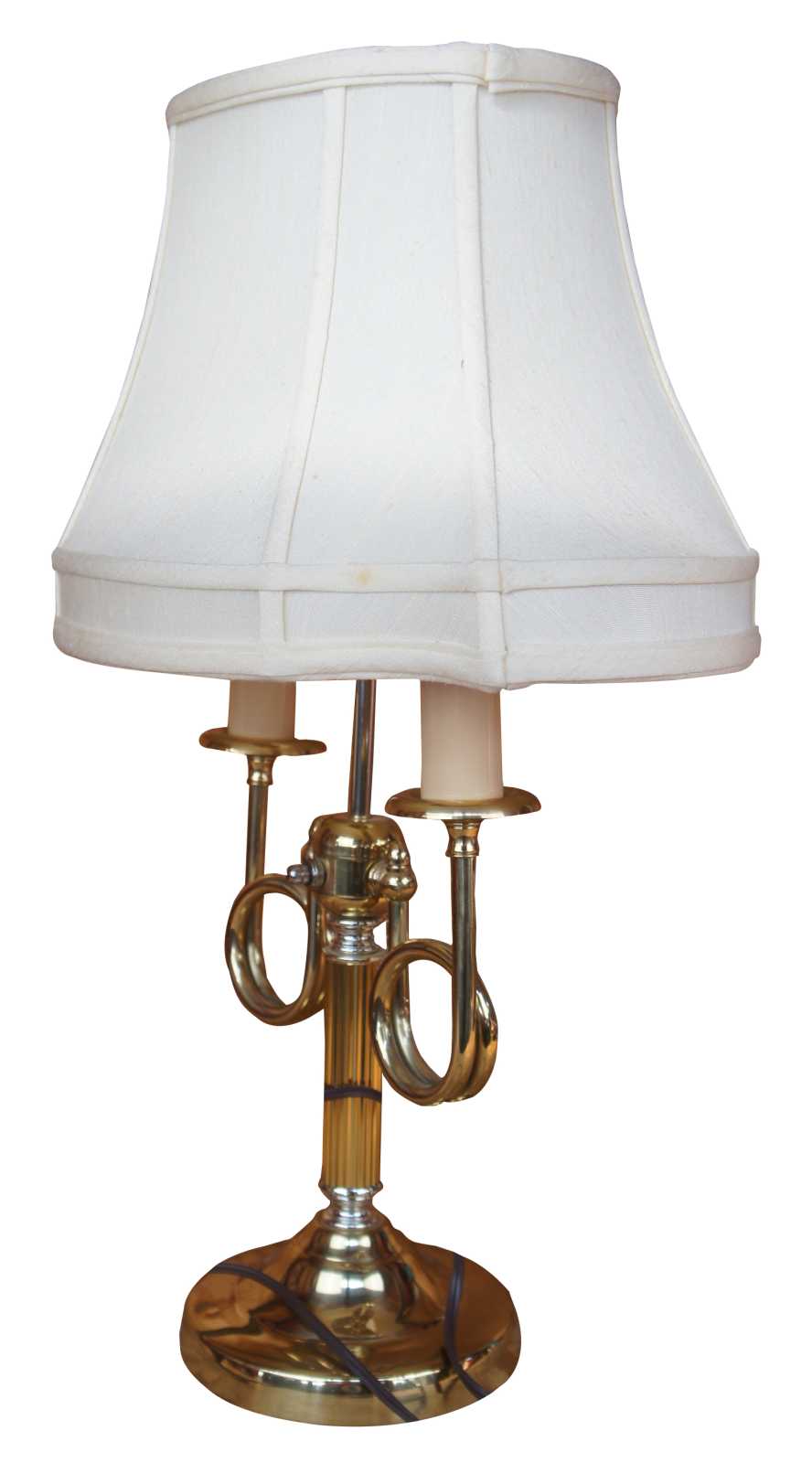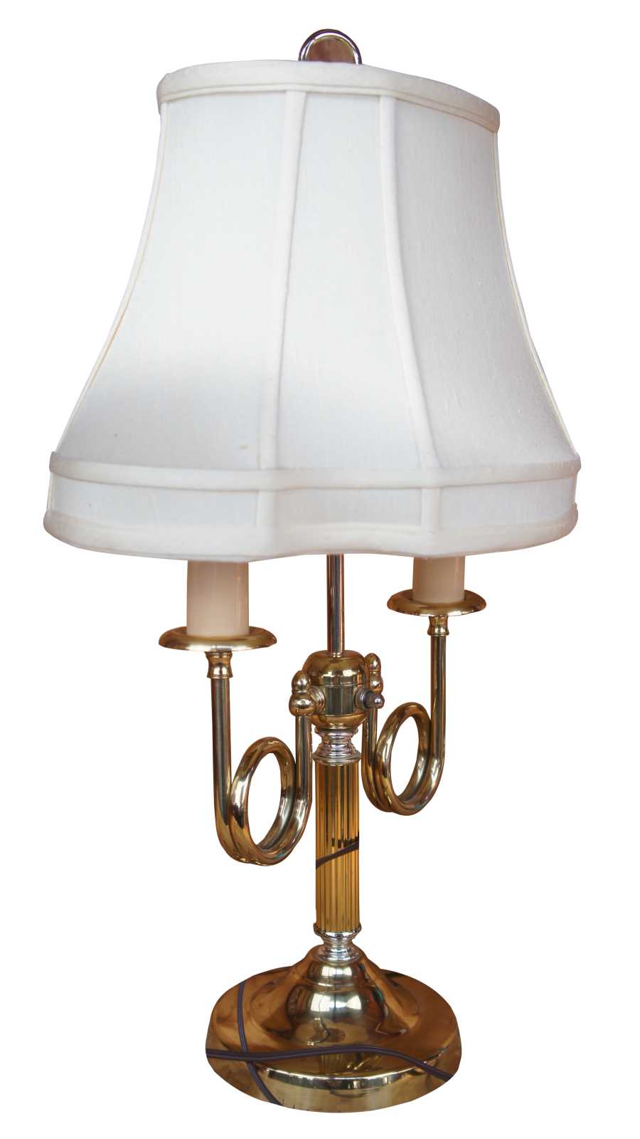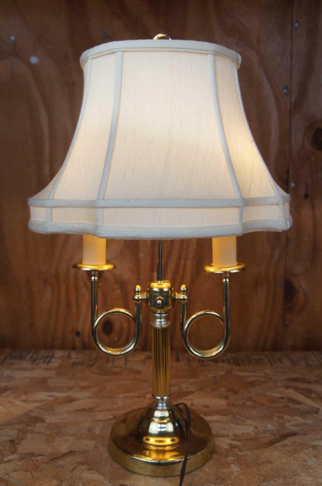 French Empire style Boiullotte table Lamp. Made from brass with trumpet turnings leading to candlesticks. Features a scalloped shade.