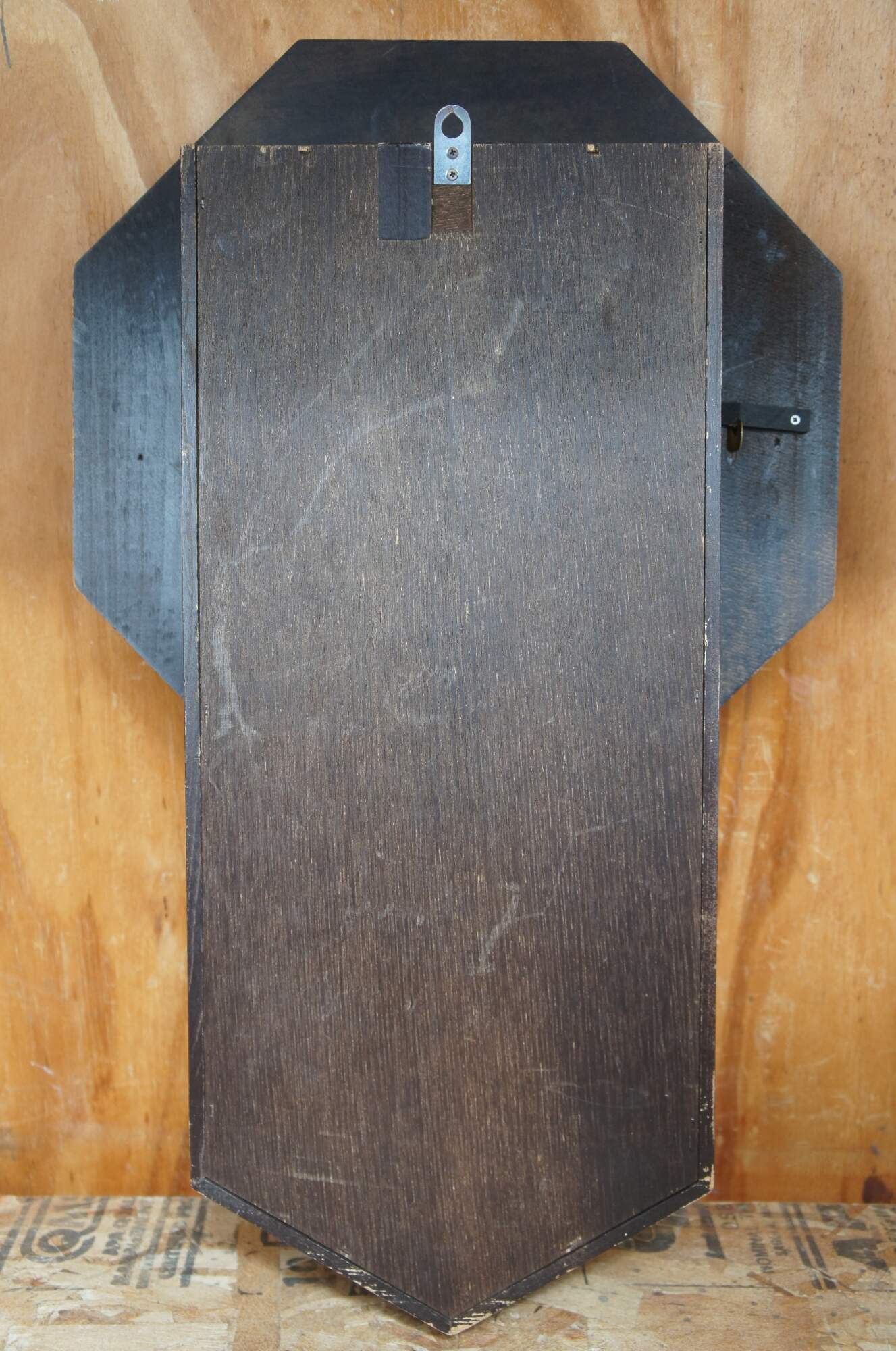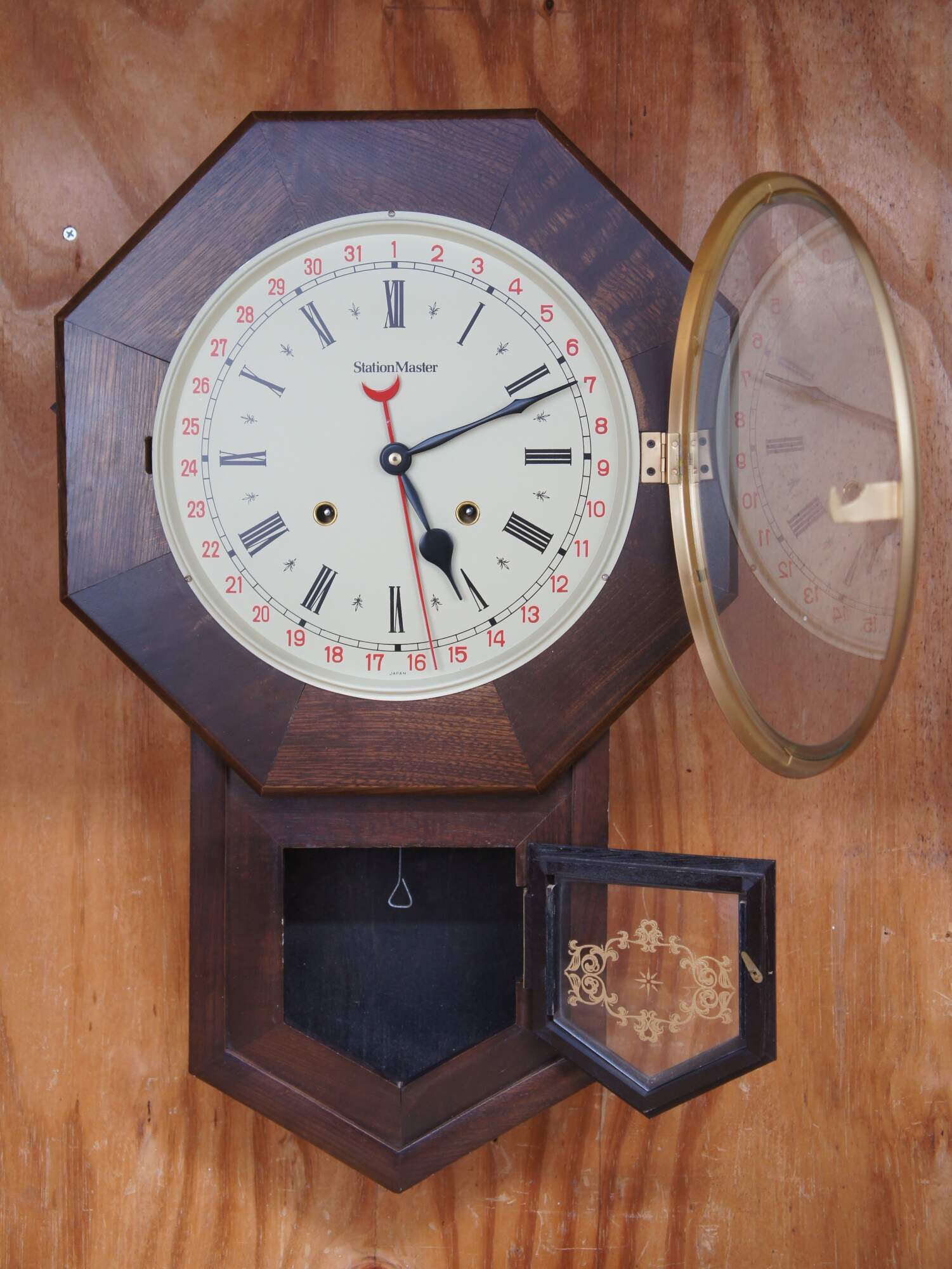 Wall hanging clock by StationMaster with tin face in decorative wood setting.