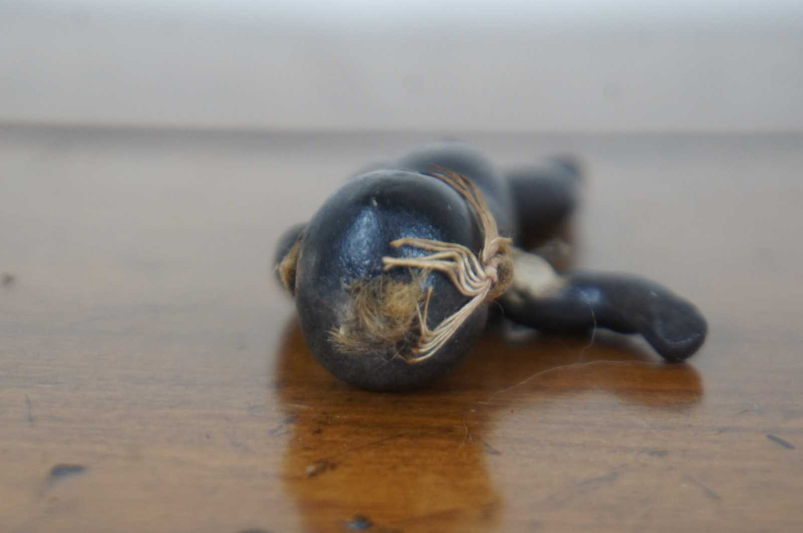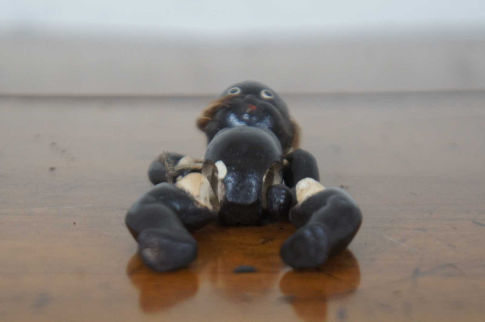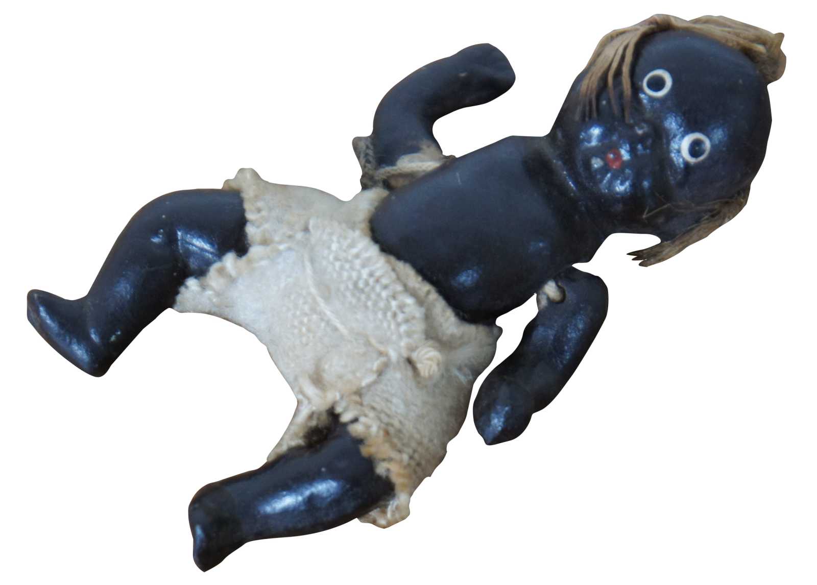 Antique African American / Black Americana bisque porcelain miniature baby doll with string jointed limbs, cloth diaper, painted features and remnants of hair.