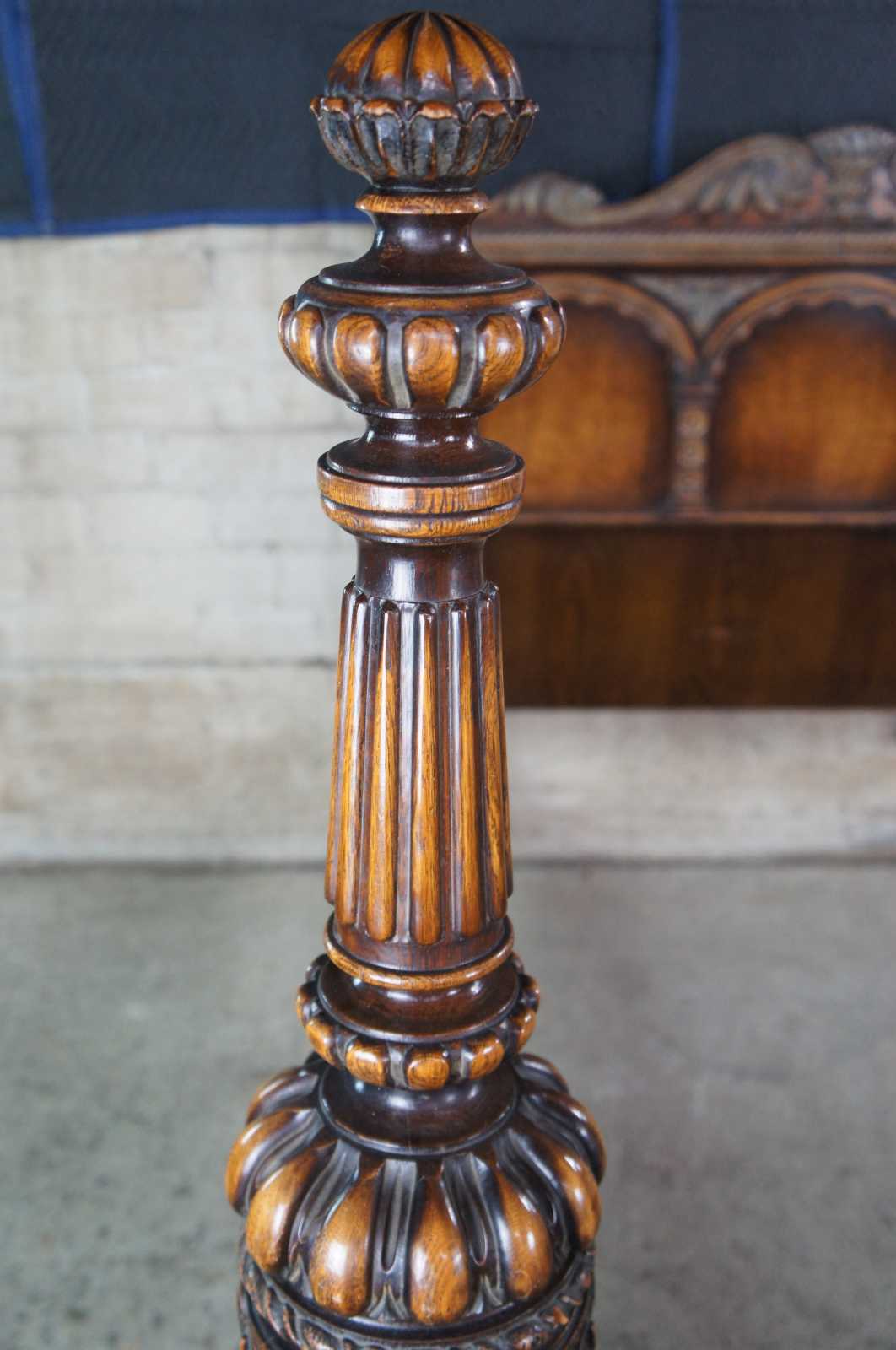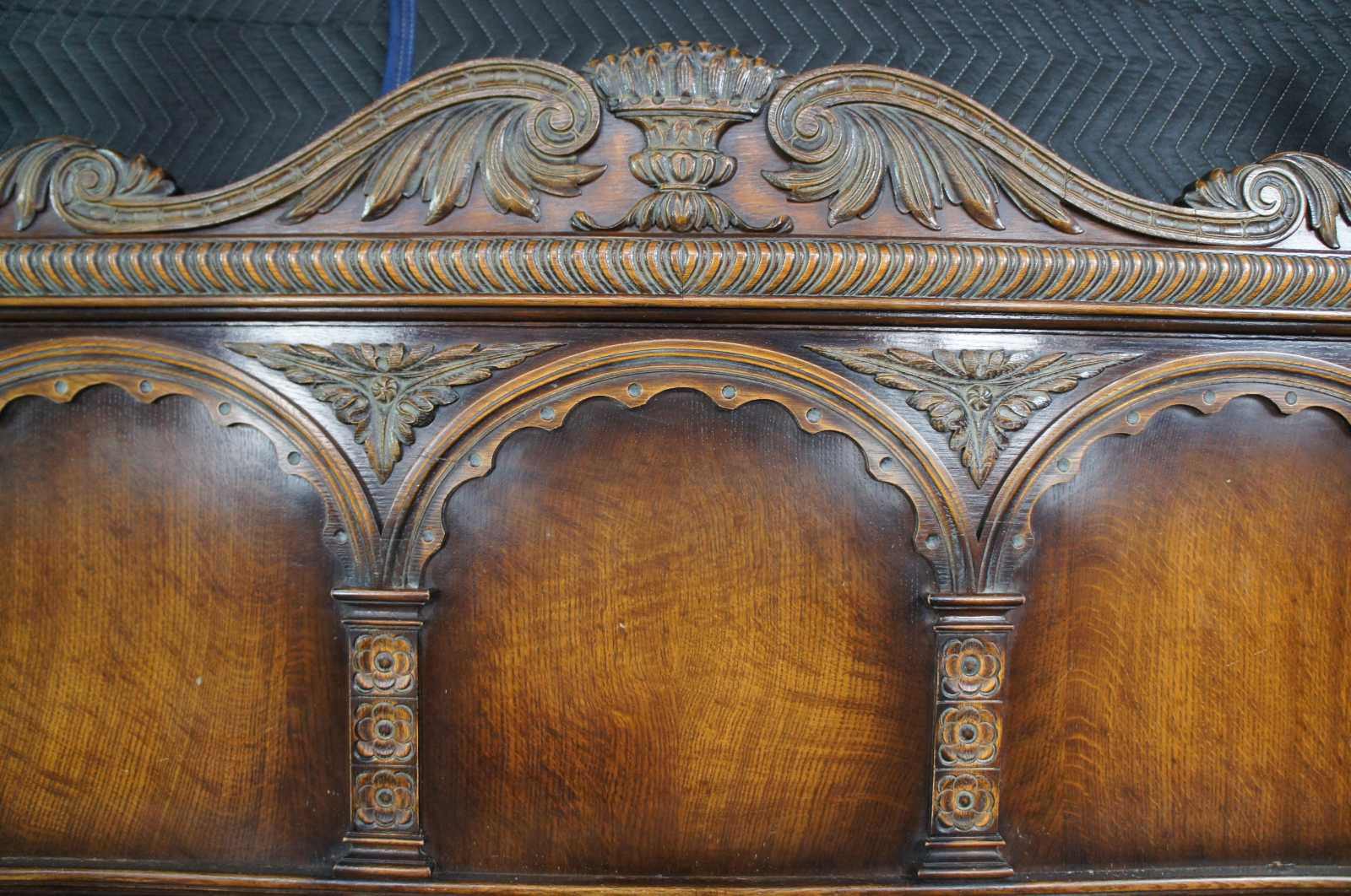 American Furniture Company Elizabethan or Jacobean Revival bed full size bed. Operating out of Batesville Indiana since 1899, they worked closely and collaborated in part with Romweber. Specializing in high grade bedroom suites and furniture. Made from American oak with low relief carvings, Gothic arches, fluted, reeded and robust baluster posts. Includes heavy gadroonnig, florets and elegant floral carving. Circa 1930s.