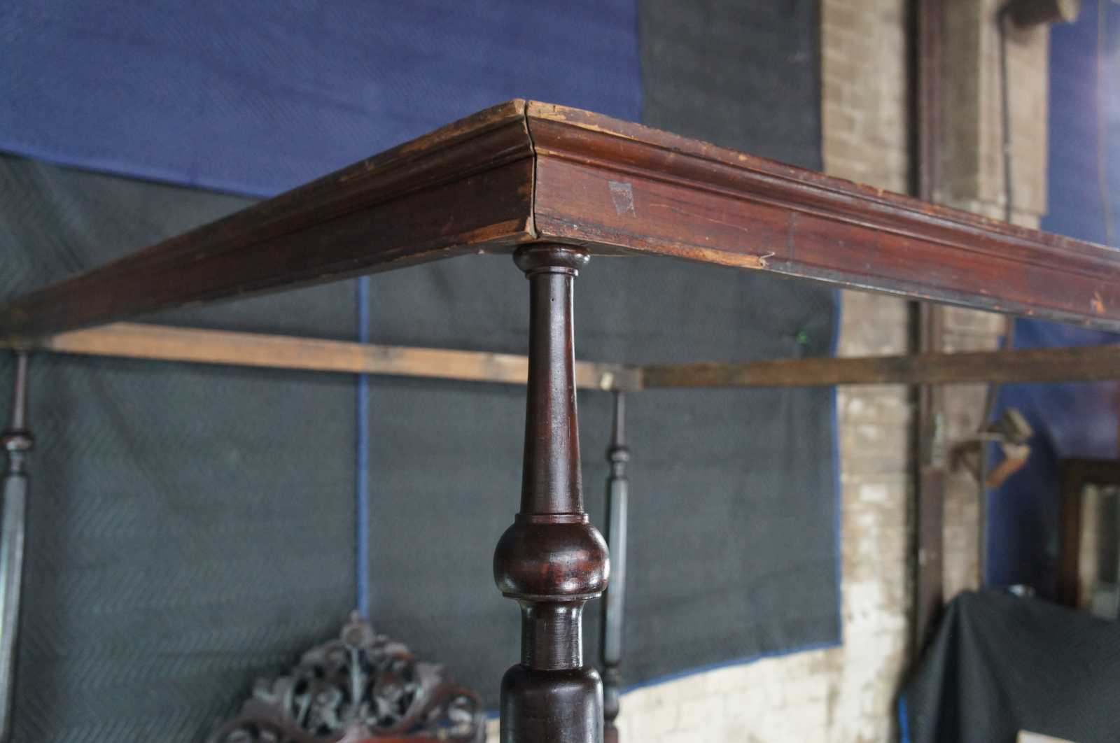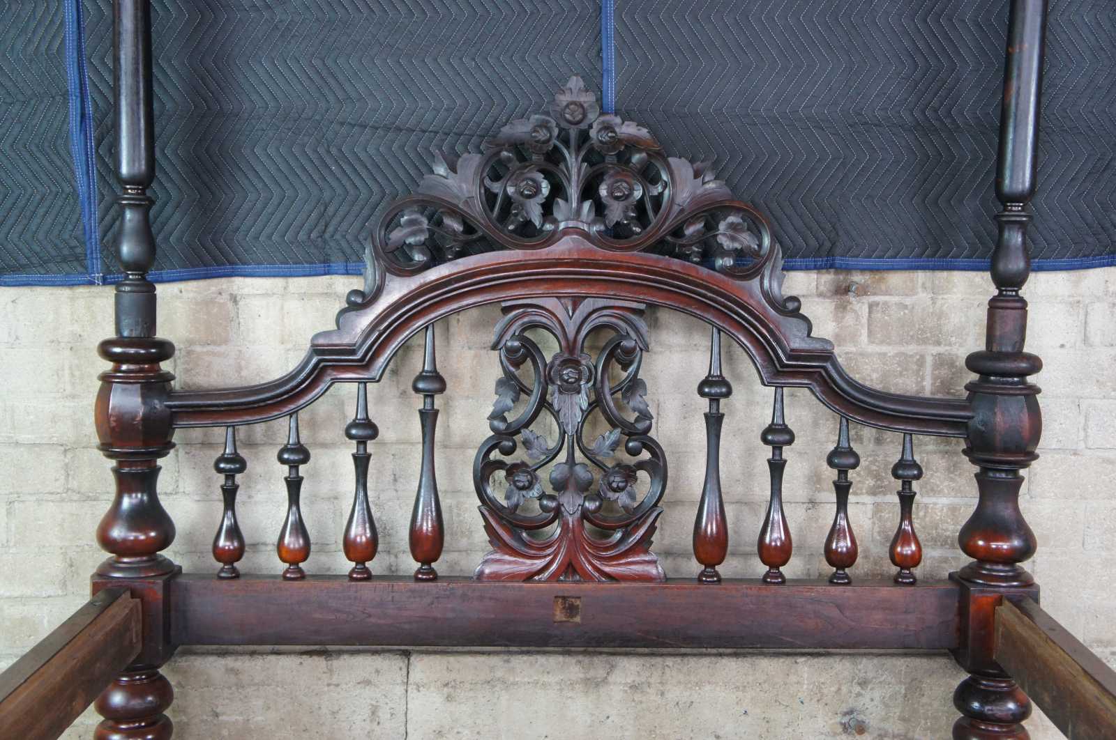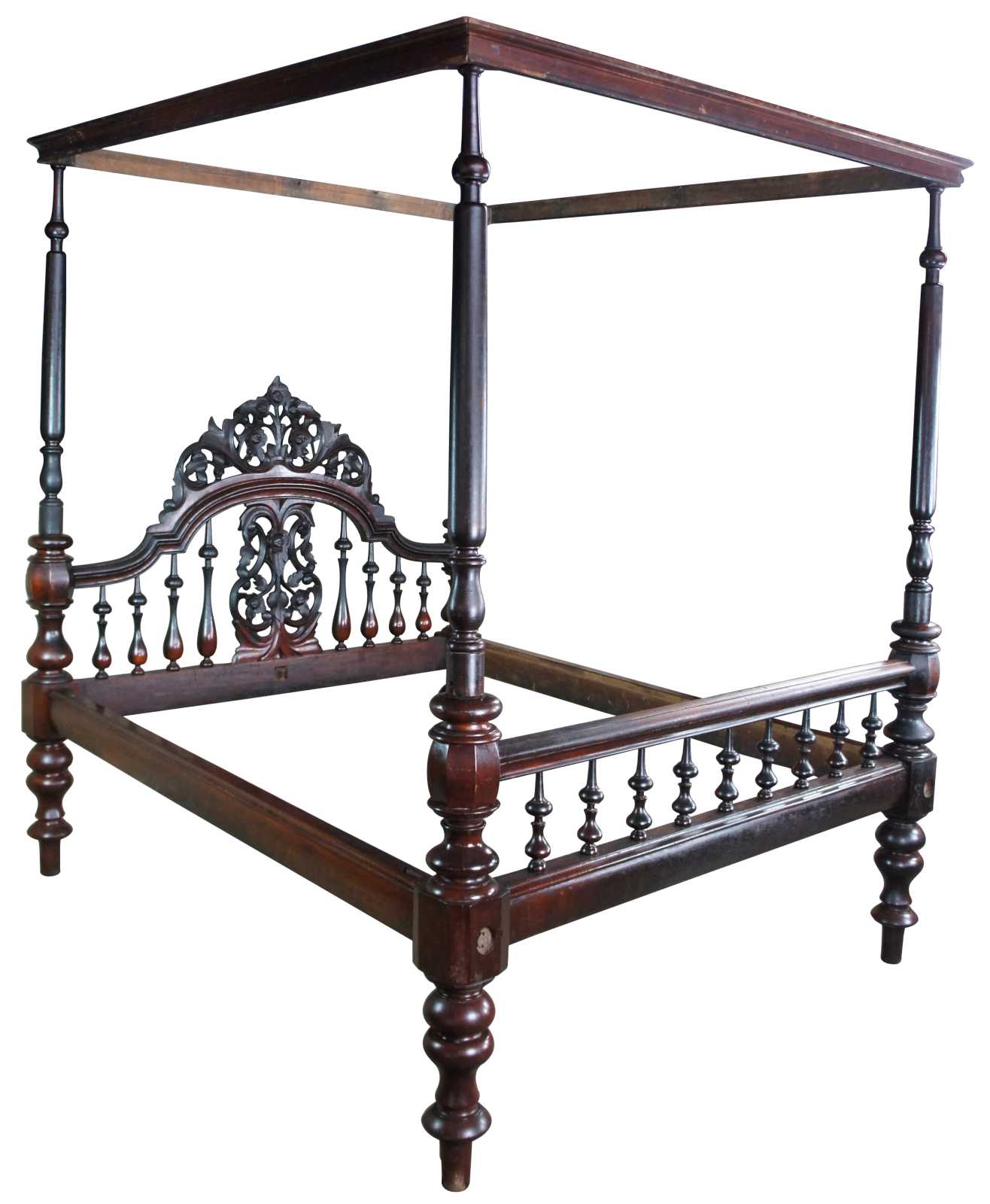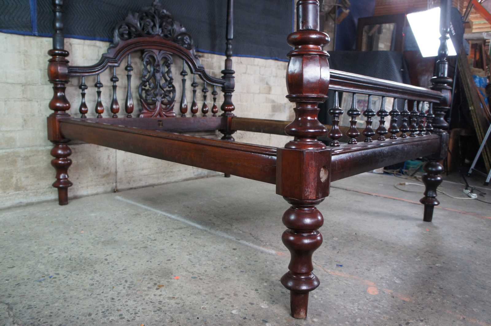 Monumental and Rare antique Anglo Indian Raj tester or canopy bed, circa first half 19th century. A genuine and Real McCoy Period example. Not to be confused with the many fakes and remakes. Made from solid mahogany with intricate carvings throughout. Features a camelback shaped headboard with interwoven and pierced floral designs. Canopy is supported by long hand turned posts that lead to impressive spindled galleries. Frame is supported by robust turned feet.