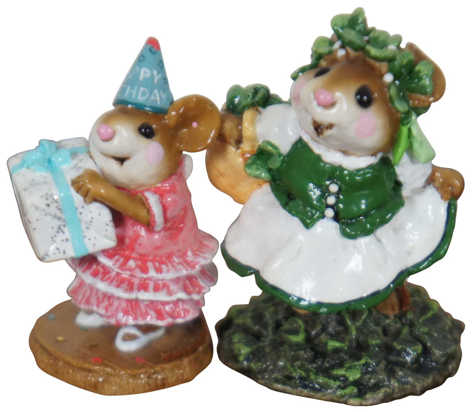Set of four assorted holiday themed Wee Forest folk Figurines, initialed by Donna and Annette Petersen. Set includes Colleen O’Green M-167 for St. Patrick’s Day, Clementine M-204 for St. Valentine’s Day, Party Girl M-224 for birthdays, and Little Dipper Swimmer M-278 from the On the Beach series for summer vacation.