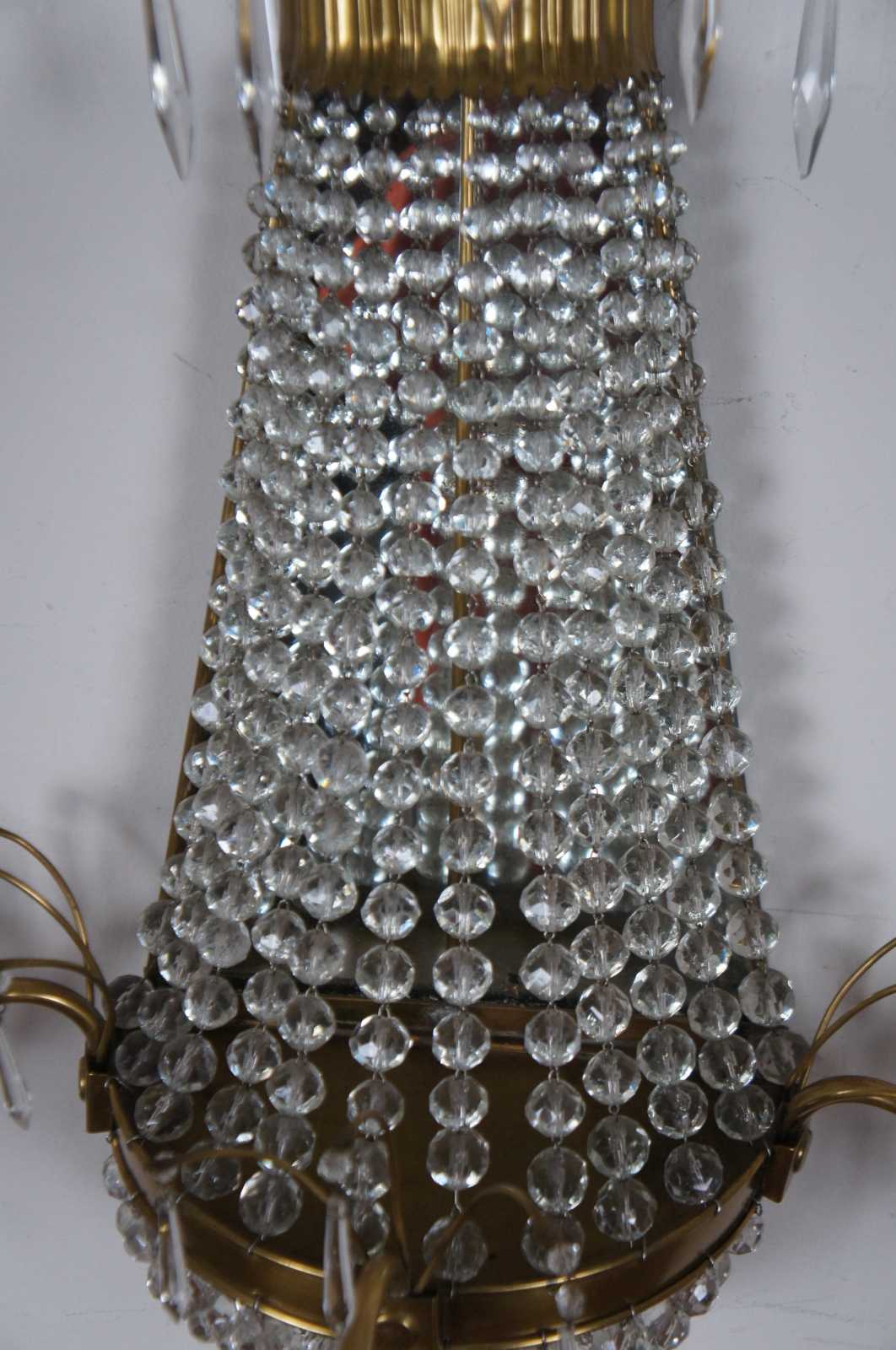 Pair of two mid century French Empire Garland three candle wall sconces made of brass with mirrored backs under sweeping strings of tapered crystal beads and drop crystal accents on the arms.