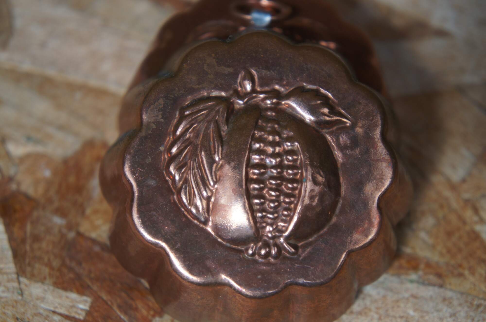 Thirteen vintage copper confectionery tins or molds with the impression of grapes, pears, plums, cherries and other fruits. They each feature a small ring and can be used as decoration or, with a tin lining, food preparation.