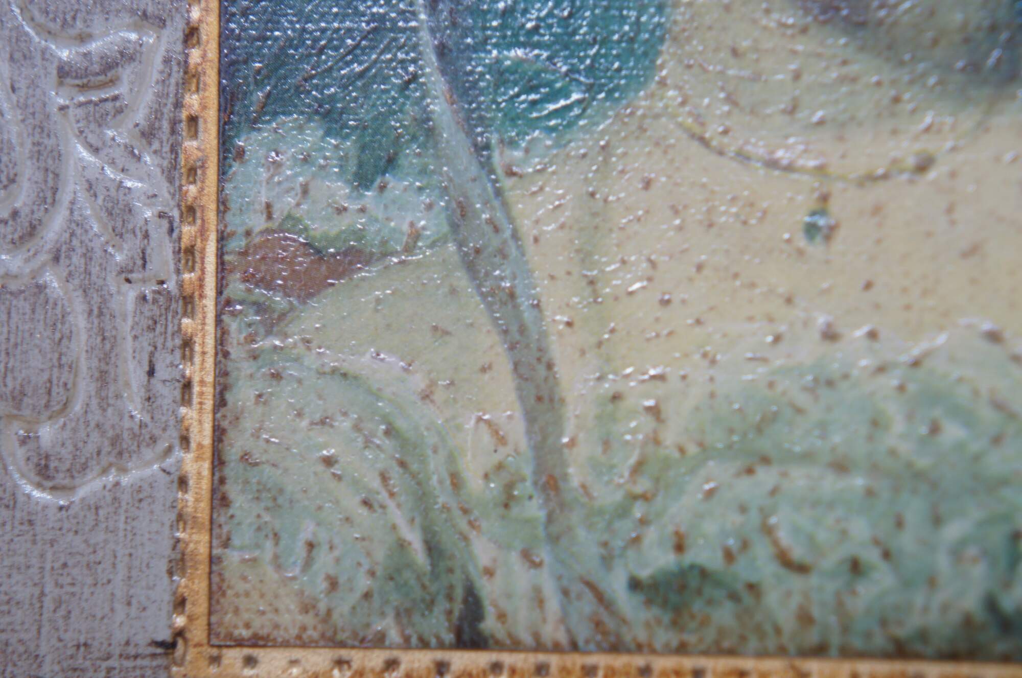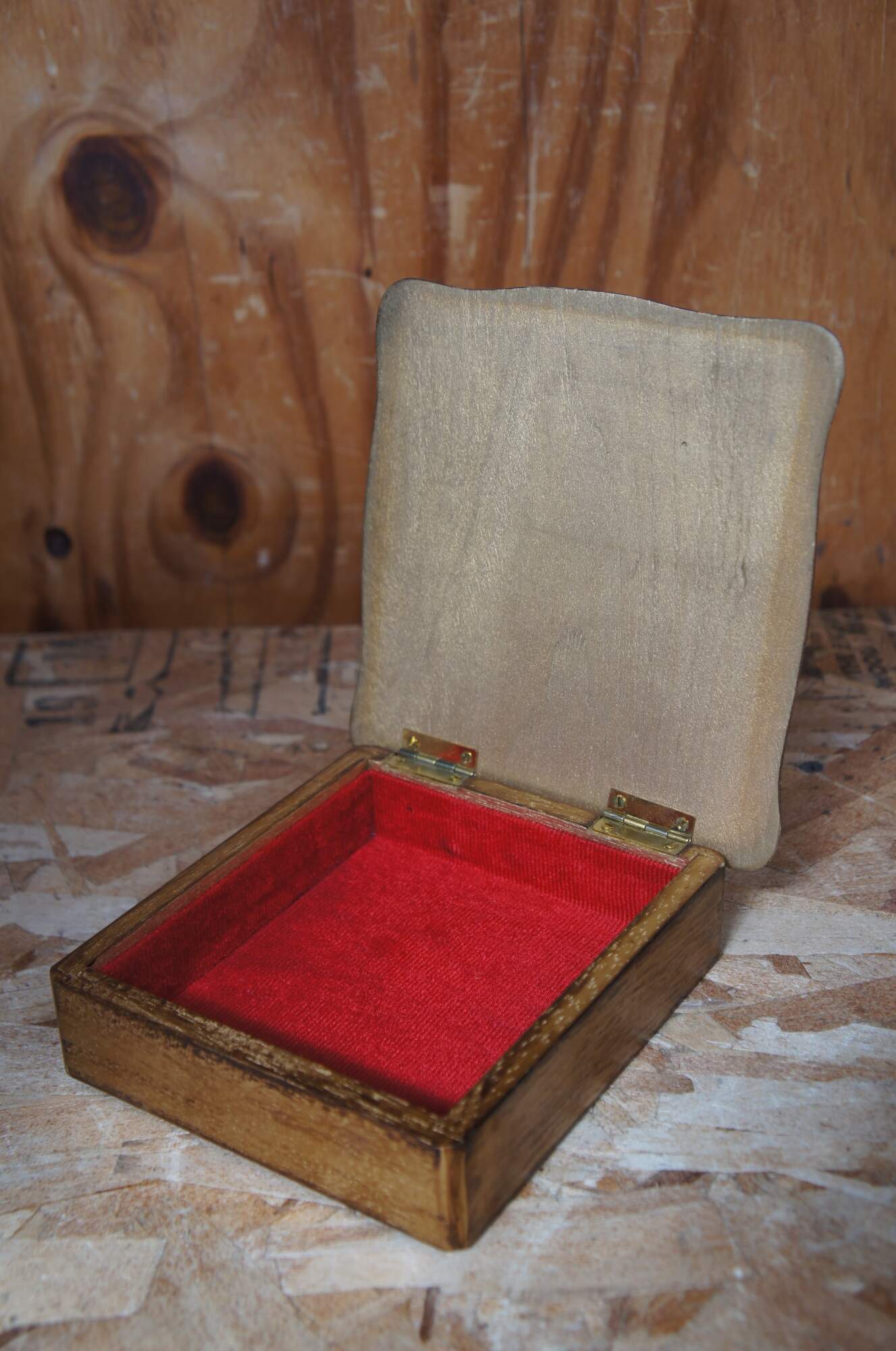 This wooden box features a hinged lid, red velvet lining and lithograph of a young girl in historical dress.