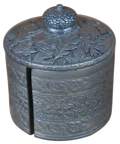 A vintage roll postage stamp dispenser in pewter with maple and oak leaves decorating it. Acorn on removable lid with stamp on bottom.