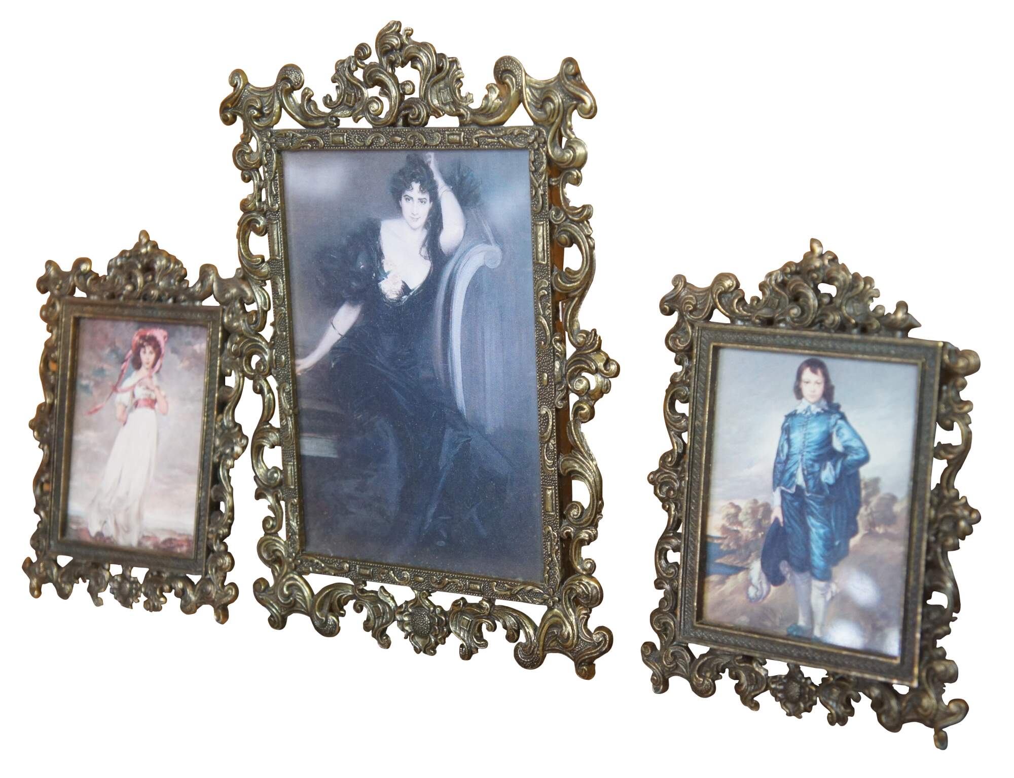 Set of three gold wall plaques/frames made in Italy featuring prints of "Lady Colin Campbell" by Giovanni Boldini, "Pinkie" by Thomas Lawrence, and "The Blue Boy" by Thomas Gainsborough.