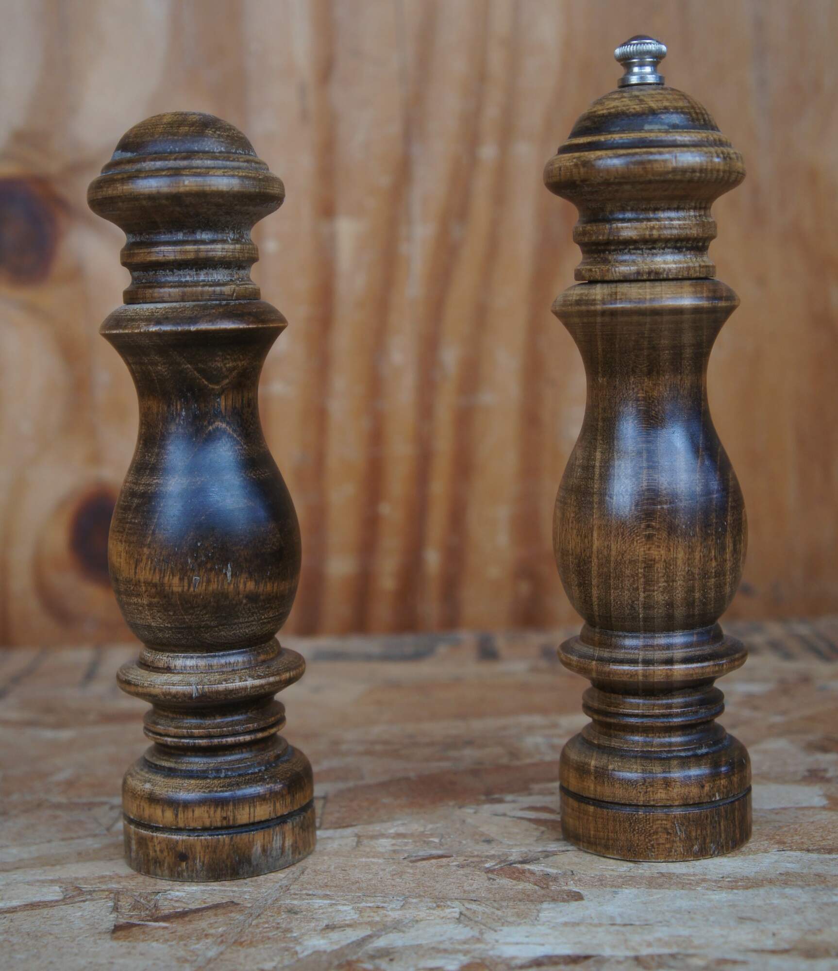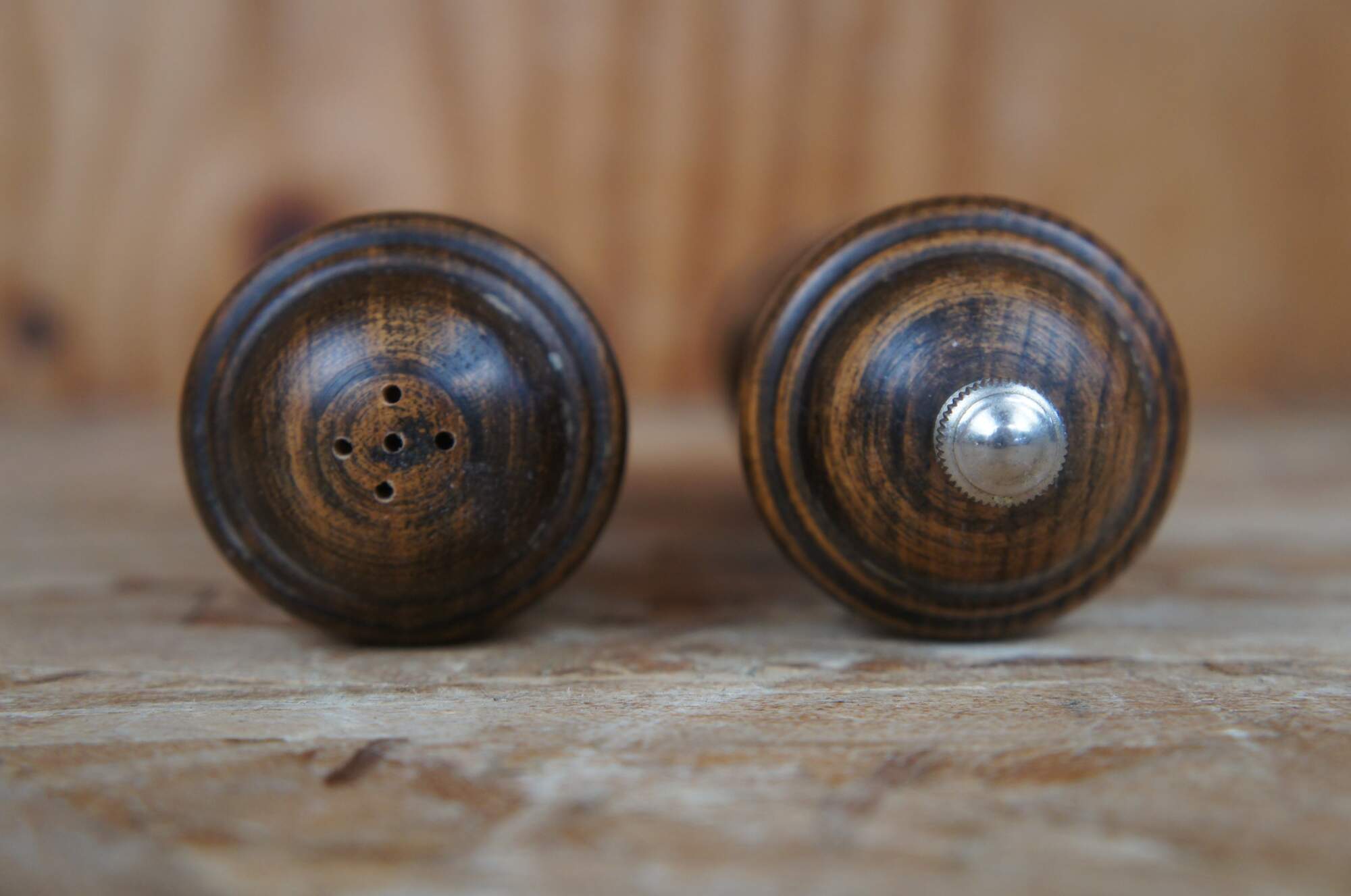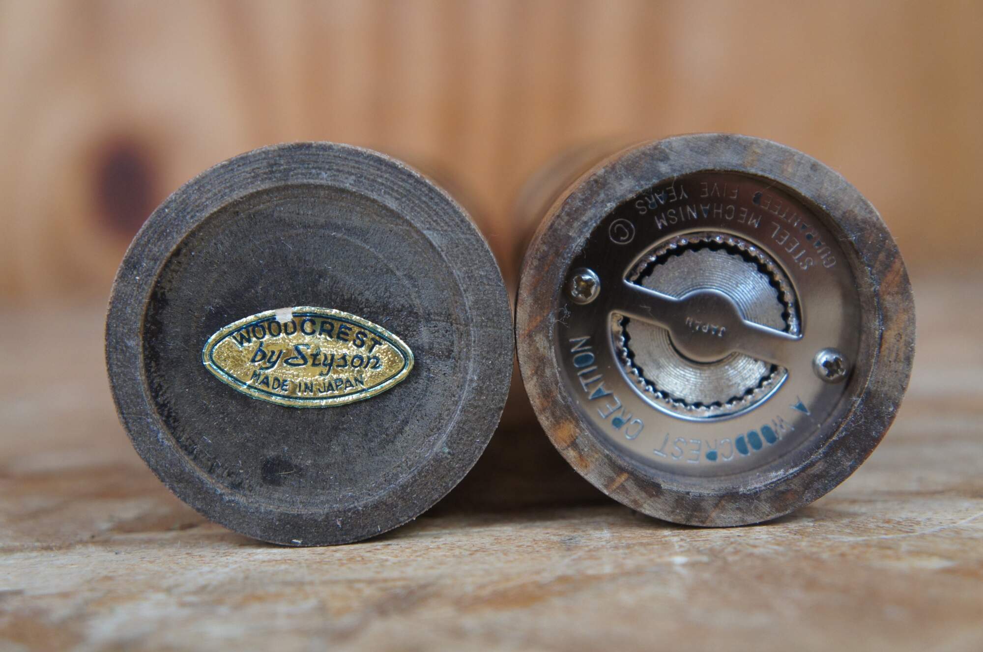 Salt shaker and pepper grinder feature wooden form, manufactured by Woodcrest by Styson of Japan.