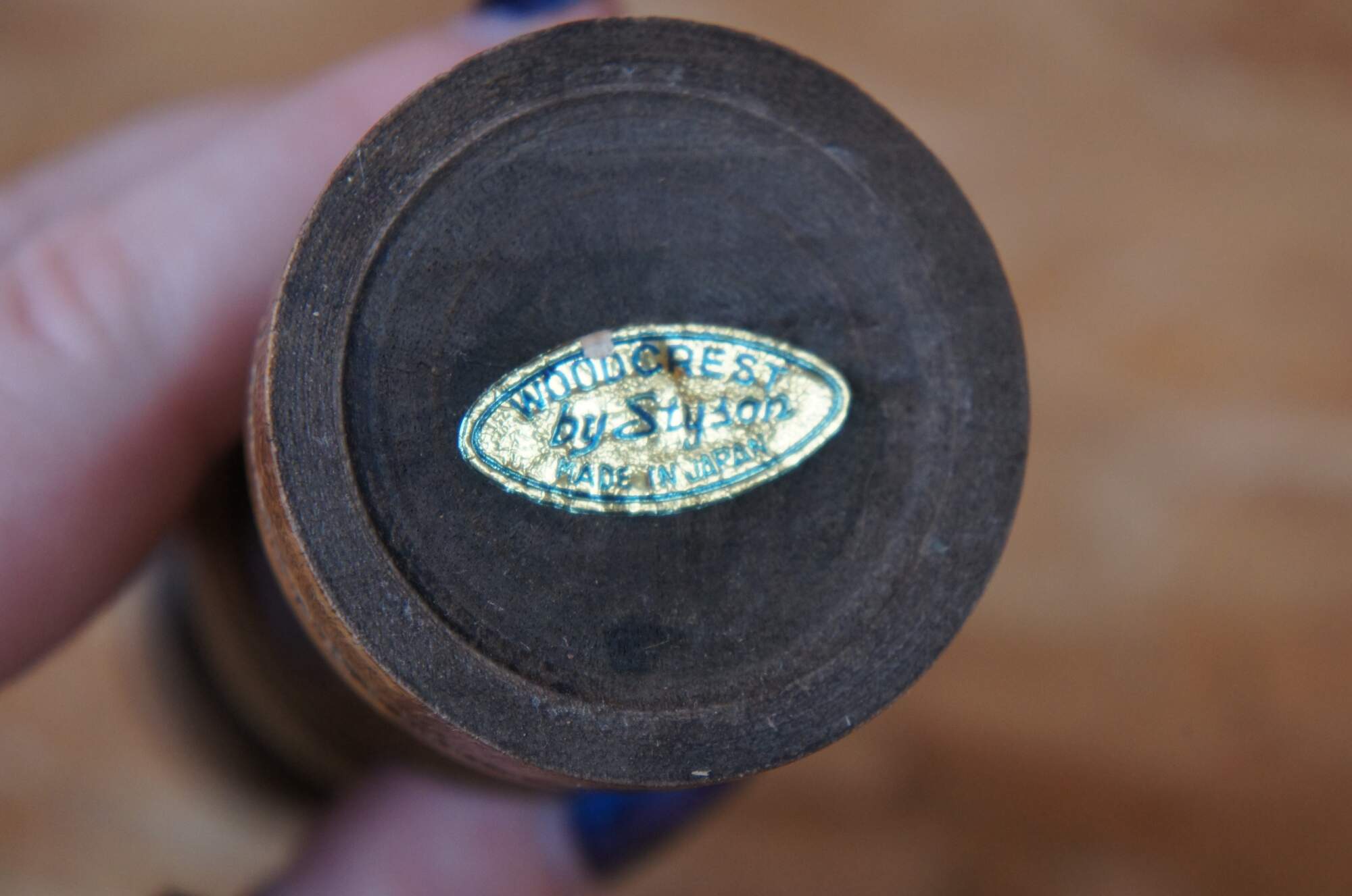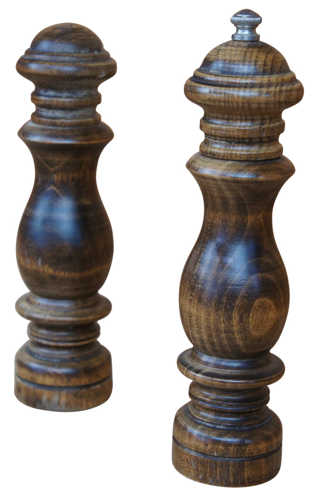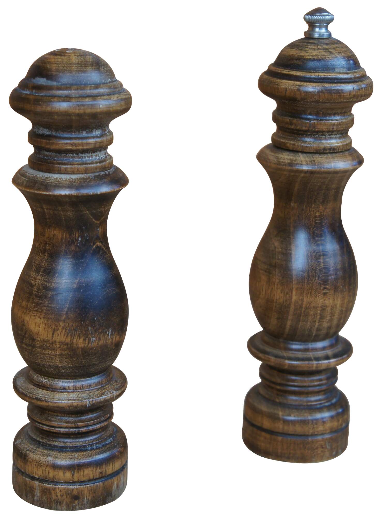 Salt shaker and pepper grinder feature wooden form, manufactured by Woodcrest by Styson of Japan.