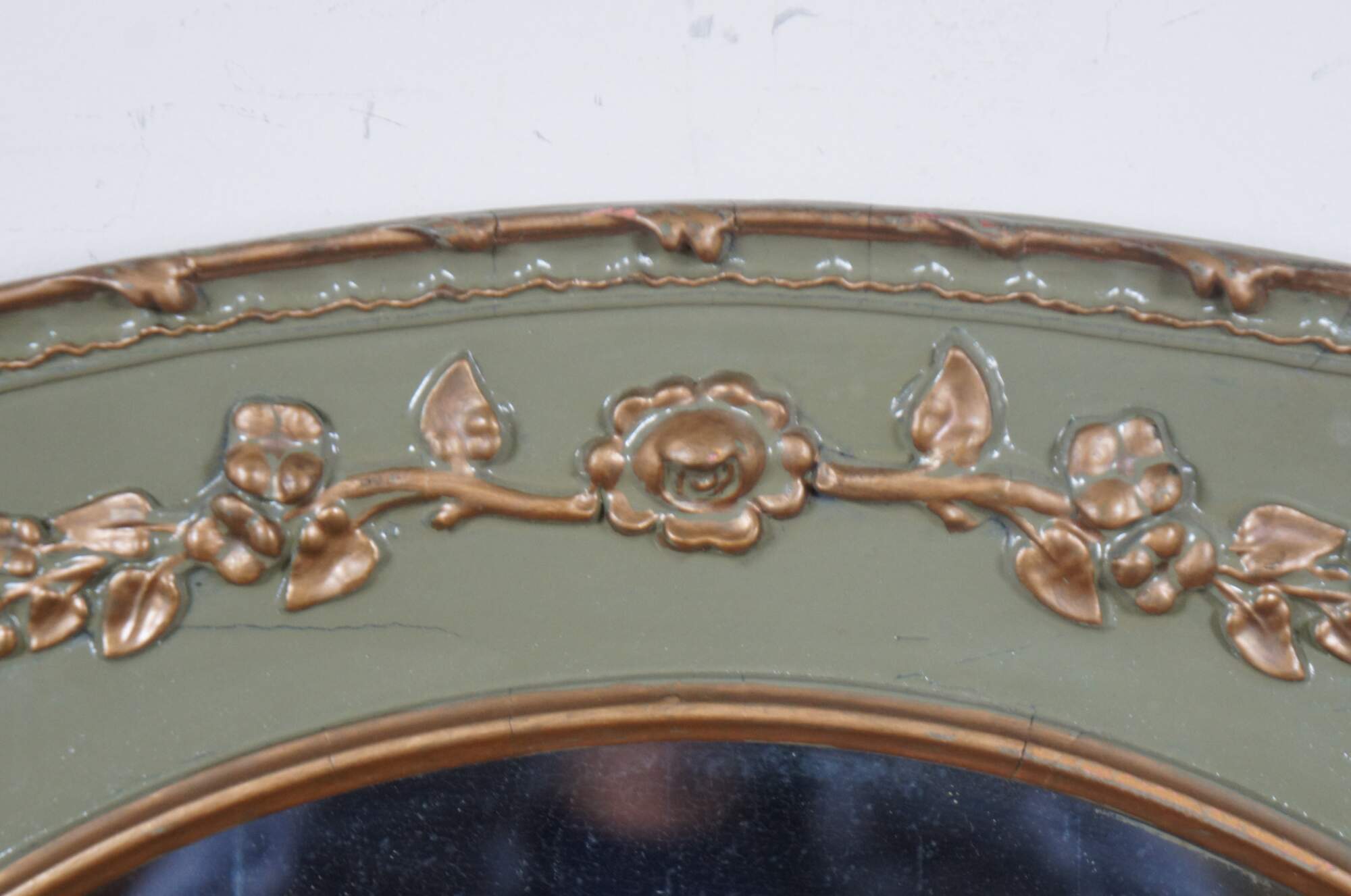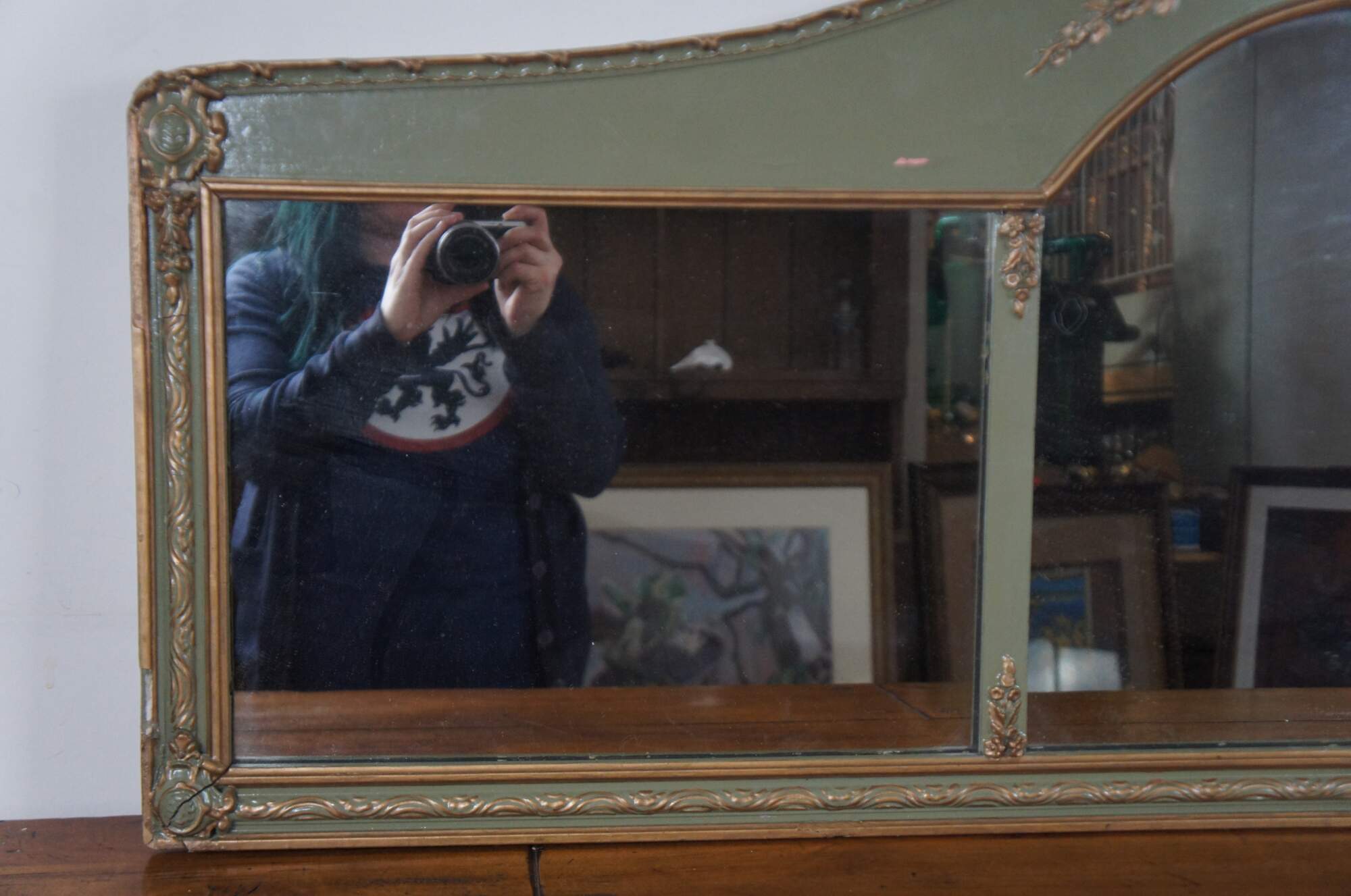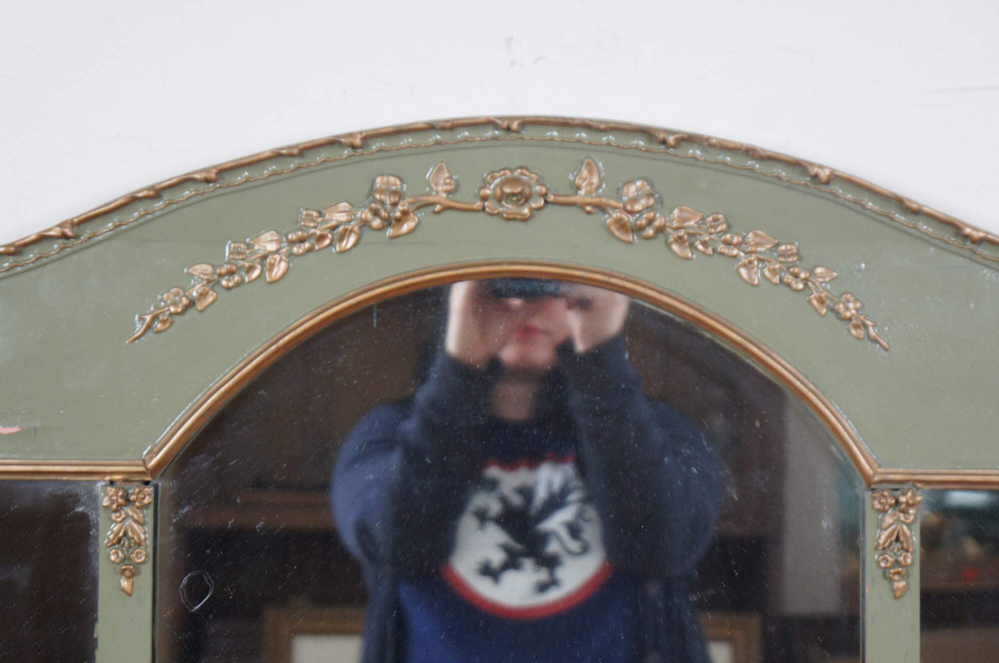 Antique overmantle mirror with three mirror segments framed in a soft olive green lacquer with gold trim and molded floral accents.