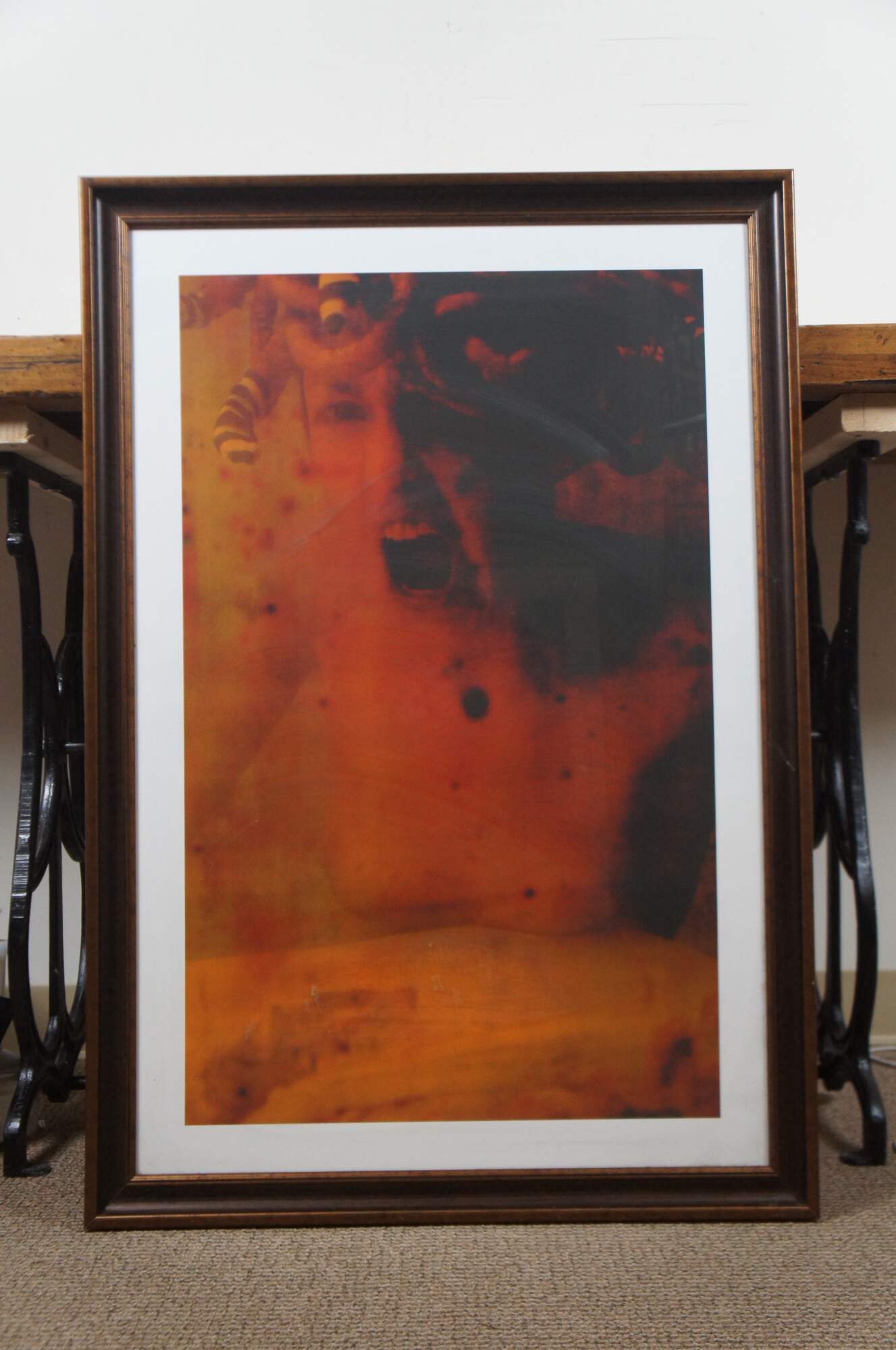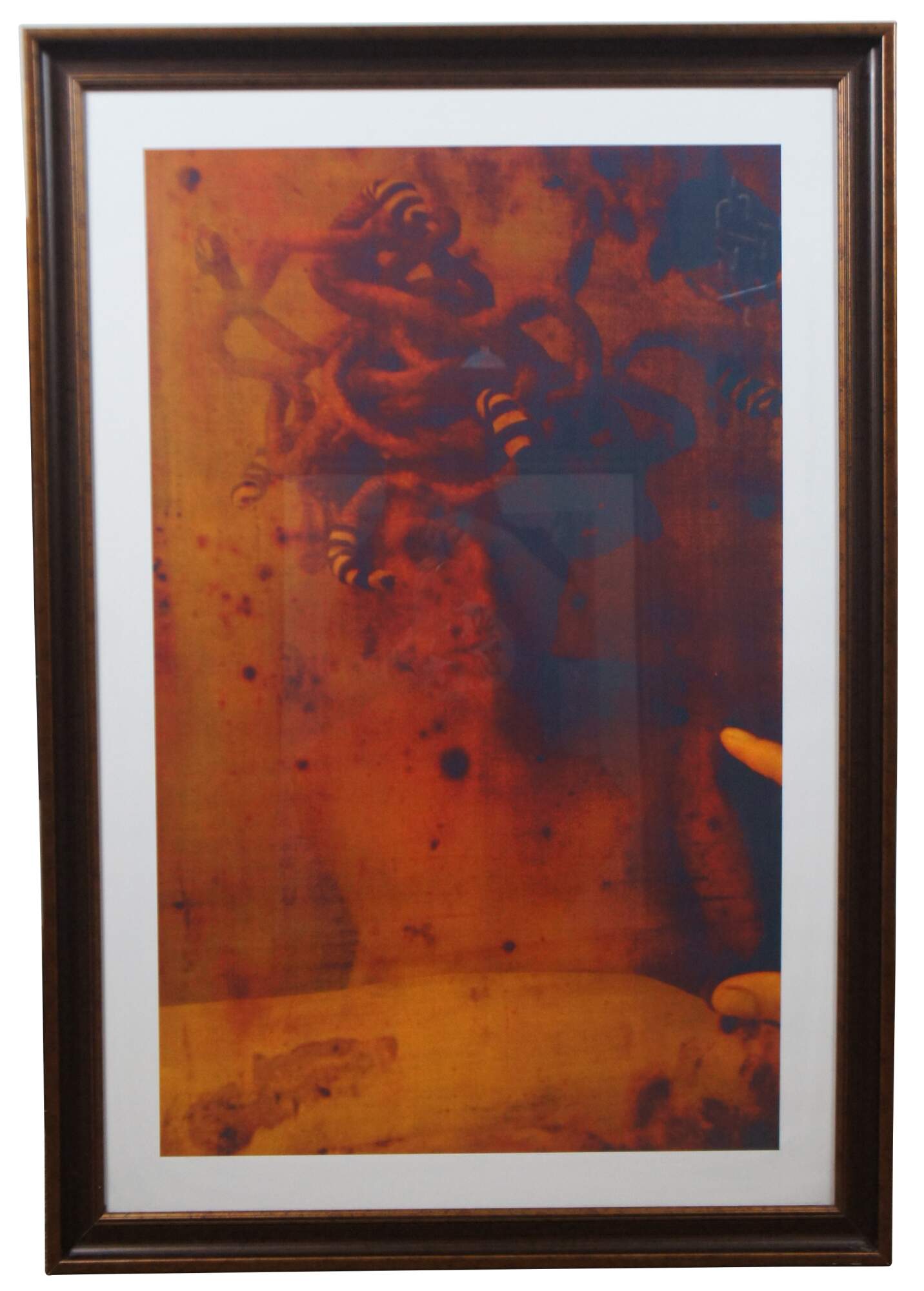 Set of three modern surrealist double exposure prints in shade of orange and red, showing a female figure with Medusa-like serpentine hair accented with peculiar ring-tailed segments.