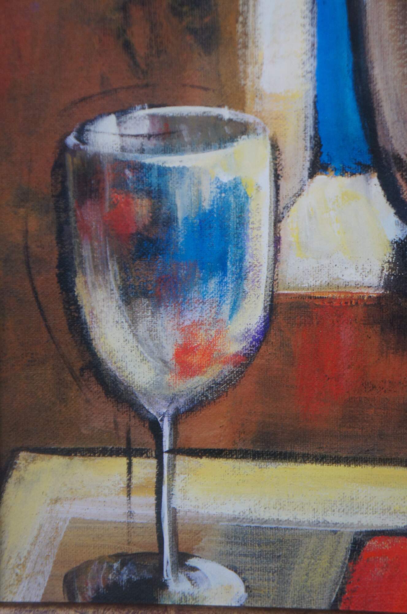 Elegantly framed still life print by Pate showing a plate of grapes and wine glass in front of a vase of yellow flowers in a window showing a coastal landscape.