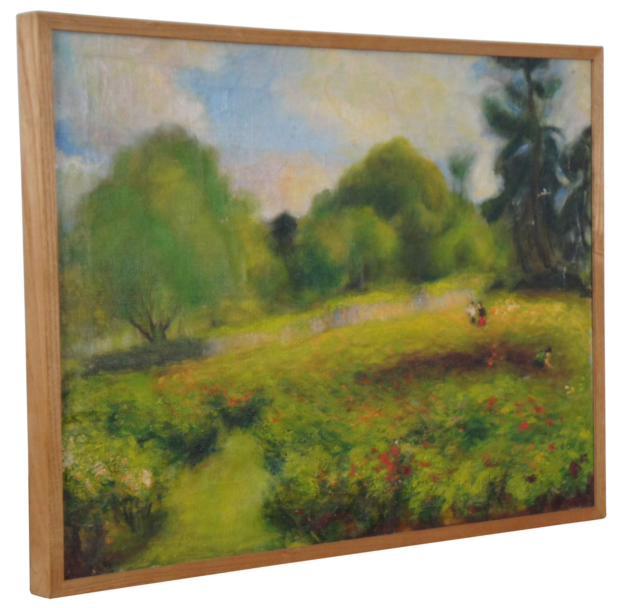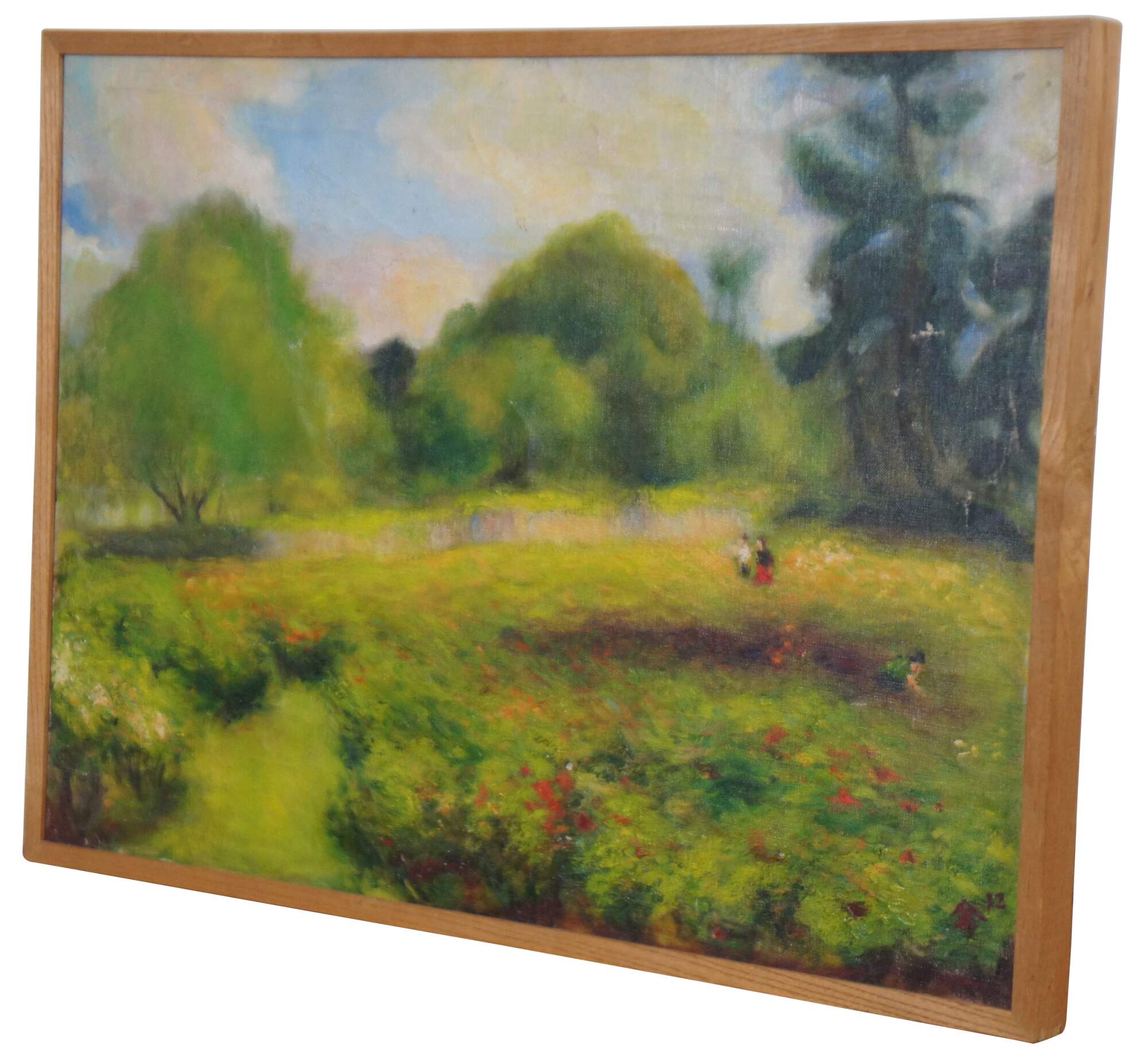 Rare and vintage 1982 Korean Chun Hwa Hwang impressionist oil painting on canvas featuring a lucious green landscape of trees and flowers with a pond and three figures.