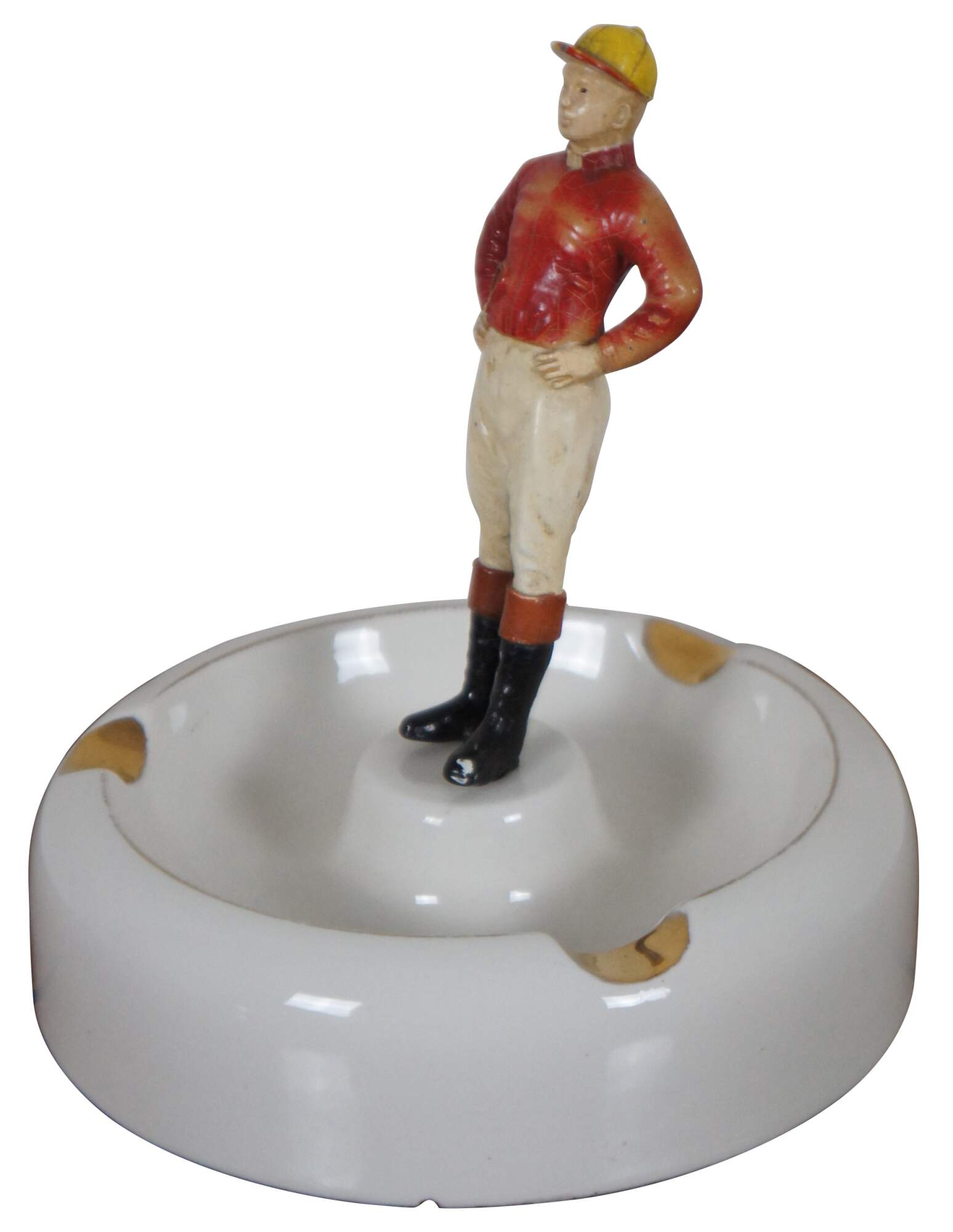 Antique cast iron horse jockey in red and yellow, mounted on a white porcelain ashtray with gilded accents.