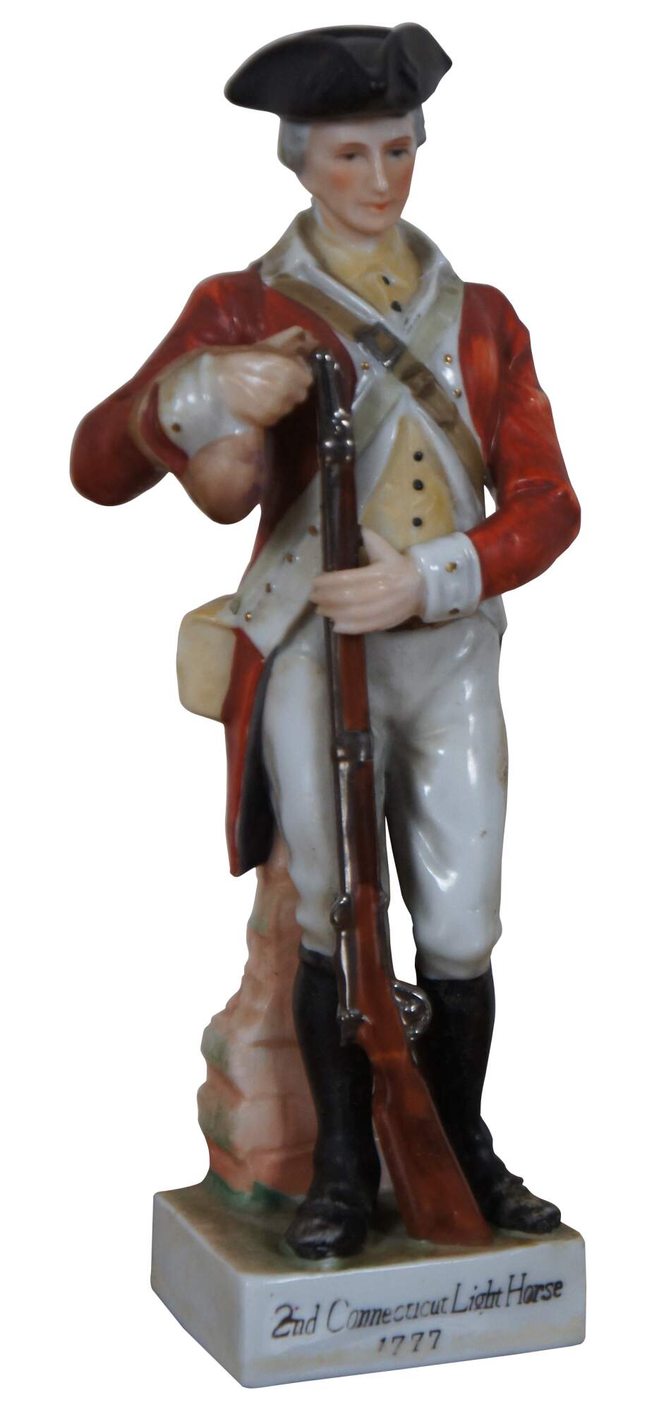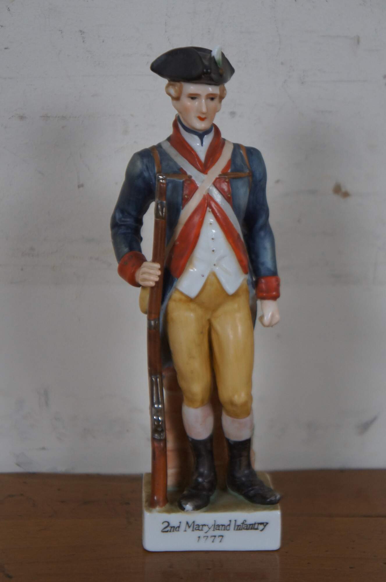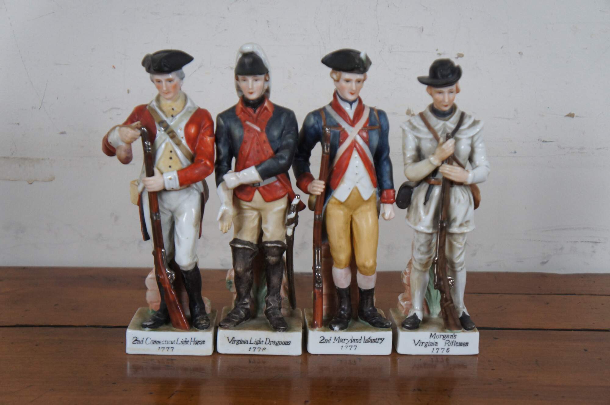 Set of four vintage Andrea by Sadek porcelain figurines portraying various Revolutionary War soldiers, product number 6965. Set includes 2nd Connecticut Light Horse 1777, Virginia Light Dragoons 1776, 2nd Maryland Infantry 1777, and Morgan’s Virginia Riflemen 1776.
