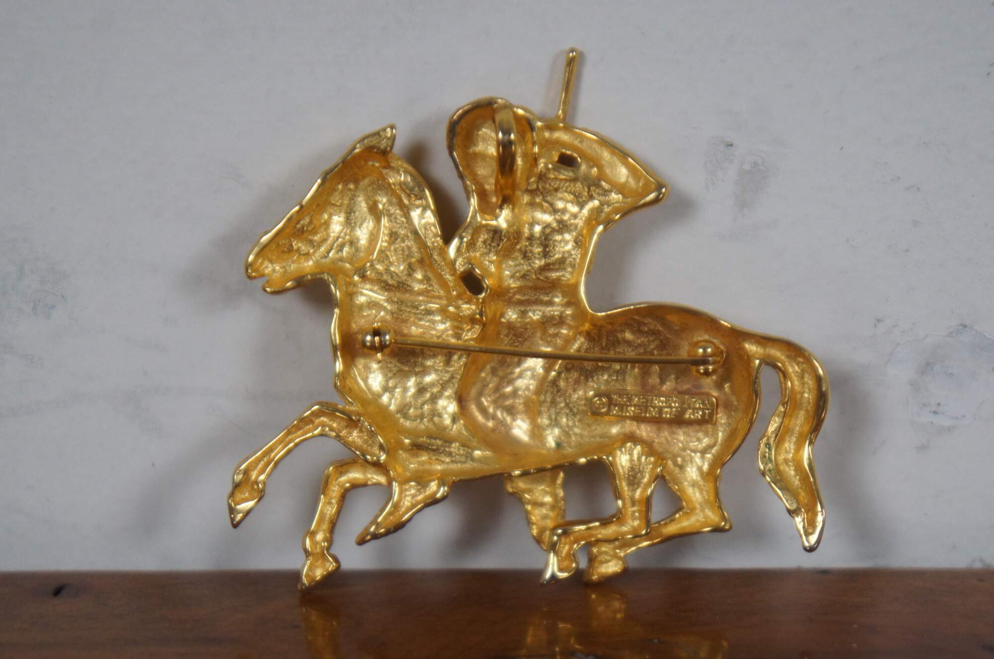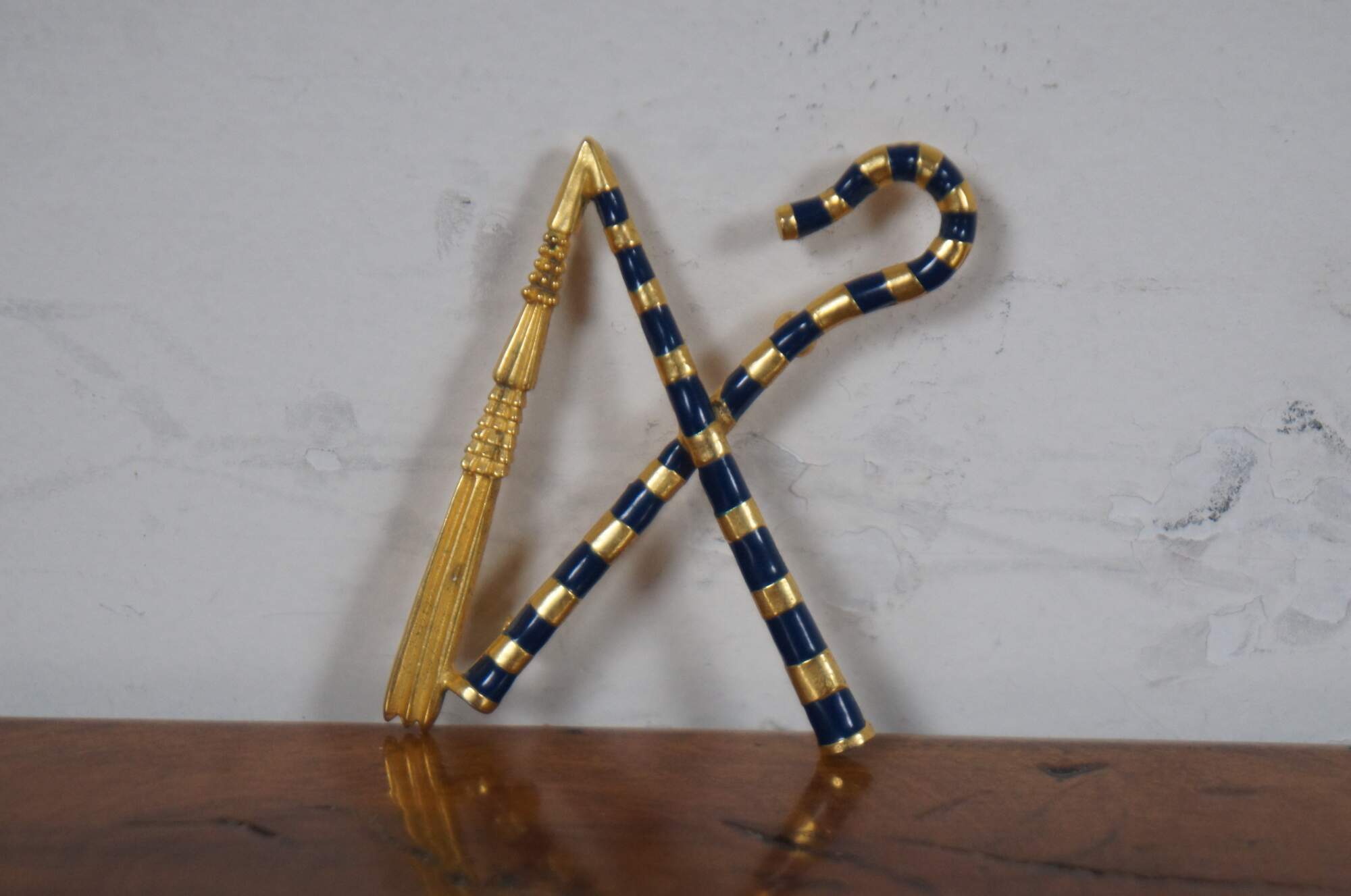 Set of four late 1970s gilt bronze souvenir items from the Metropolitan Museum of Art including Tutankhamun (“King Tut”) figurine, Scythian warrior/horseman brooch, blue enameled crook and flail brooch, and Tutankhamun funerary mask pendant.