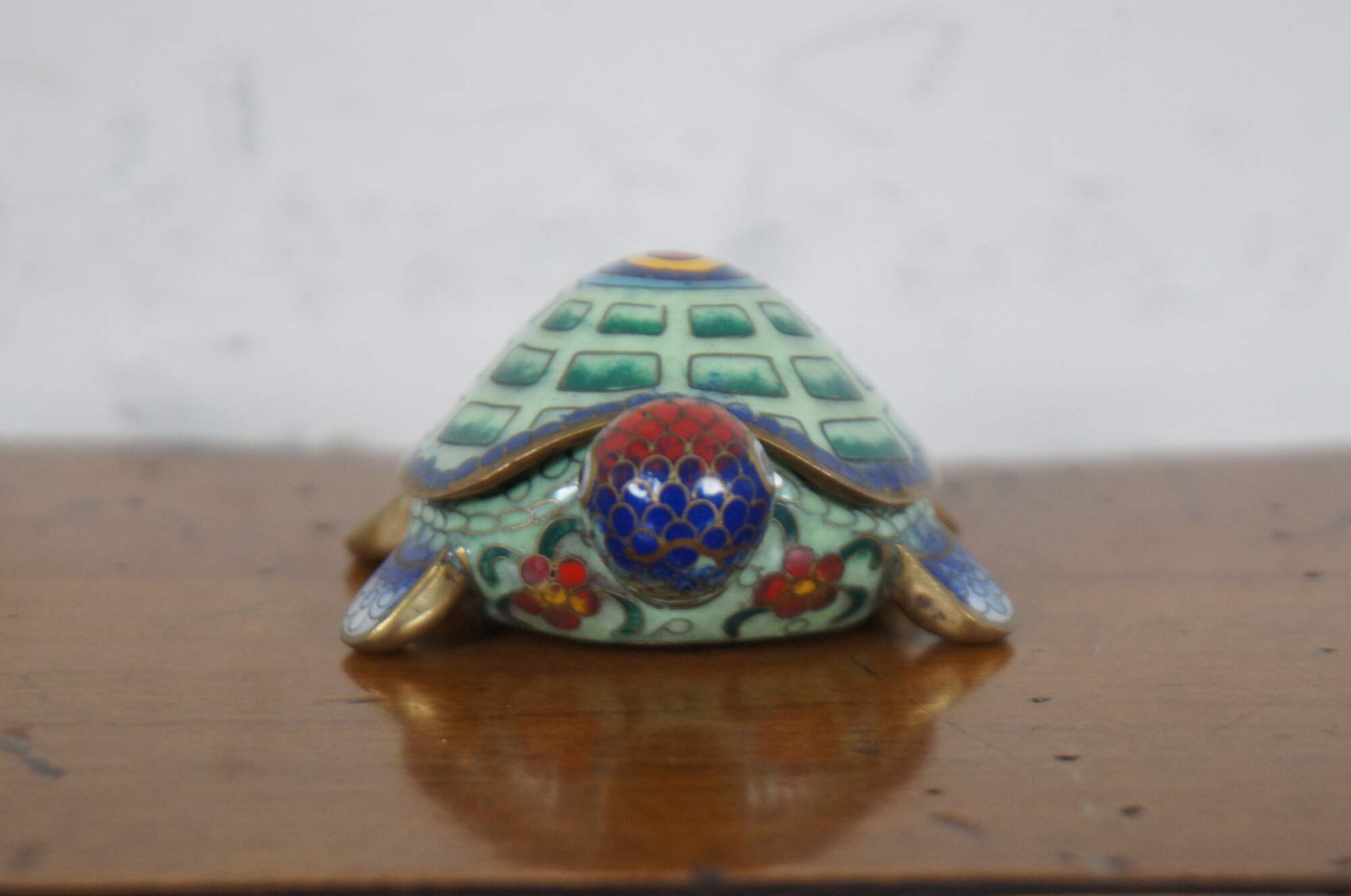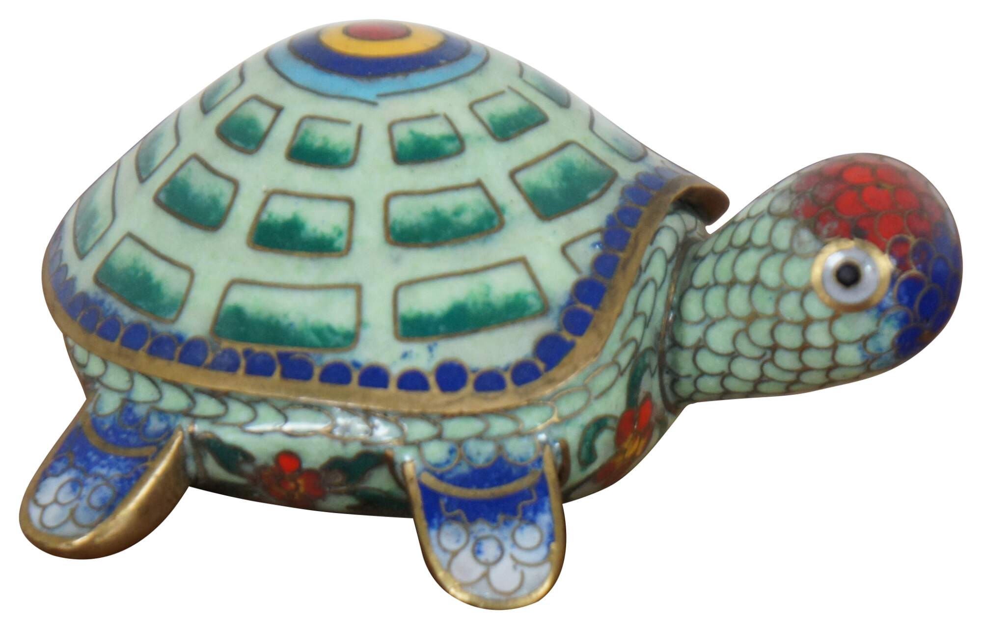 Vintage Chinese cloisonne enameled brass turtle or tortoise trinket box.