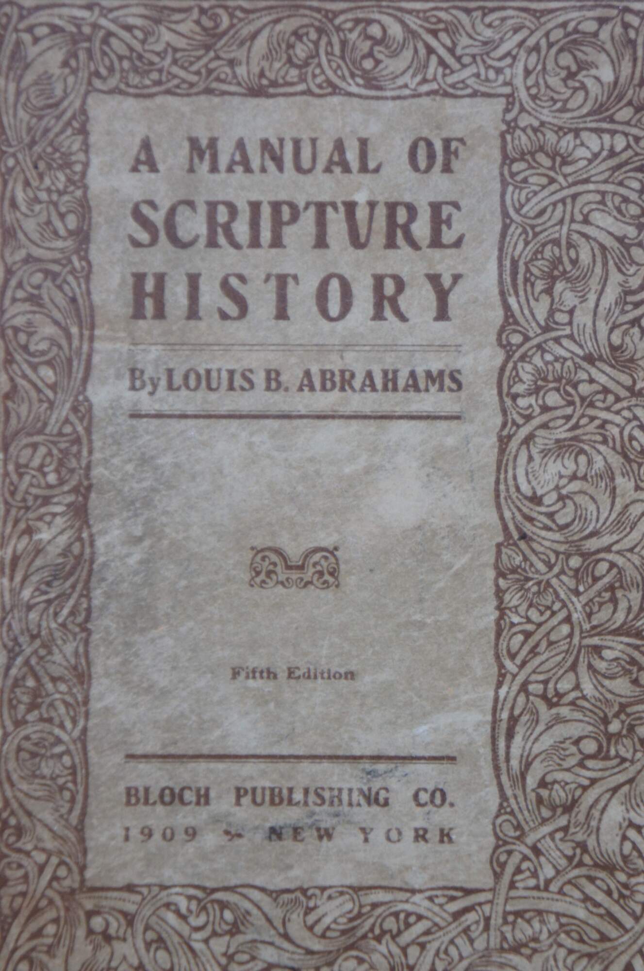 Antique hardback copy of “A Manual of Scripture History: for Use in Jewish Schools and Families” by Louis B. Abrahams, Fifth Edition, published by Bloch Publishing Company, 1909, copyright 1905.