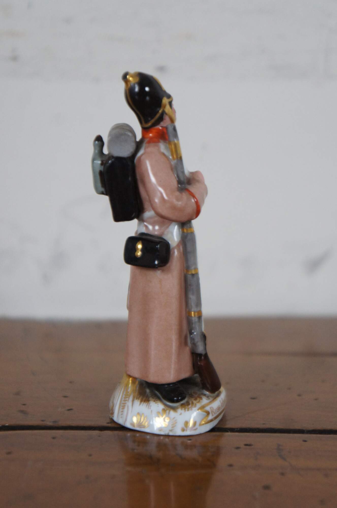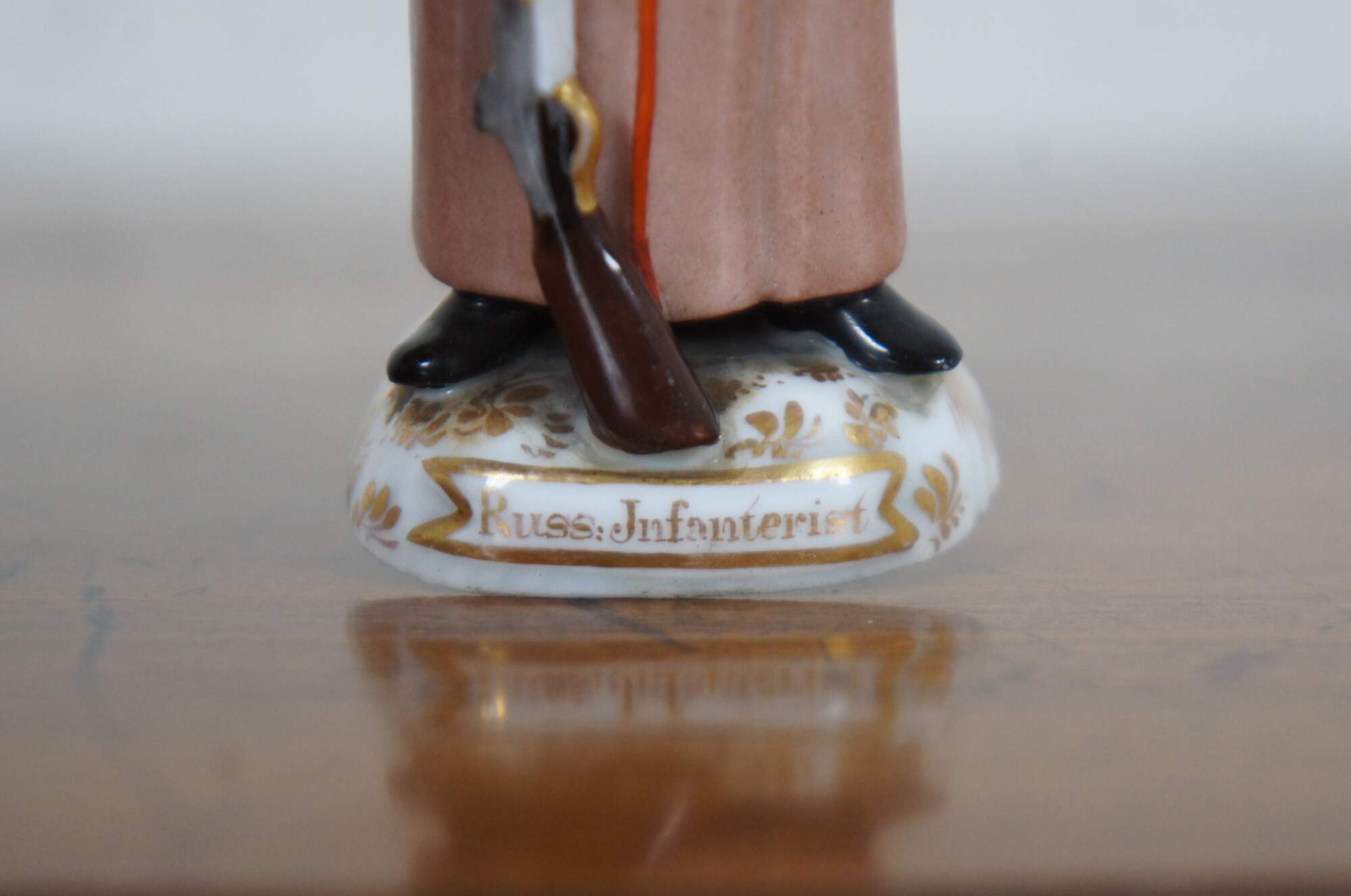 Realistically modelled, in long pale brown coat and black helmet, with rifle and back-pack, on shaped circular base captioned 'Russ: Infanterist.'