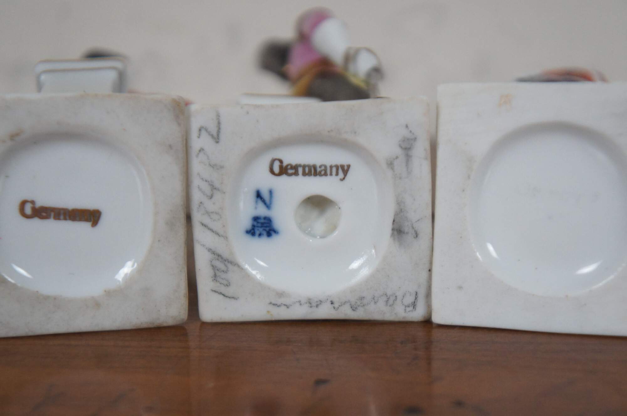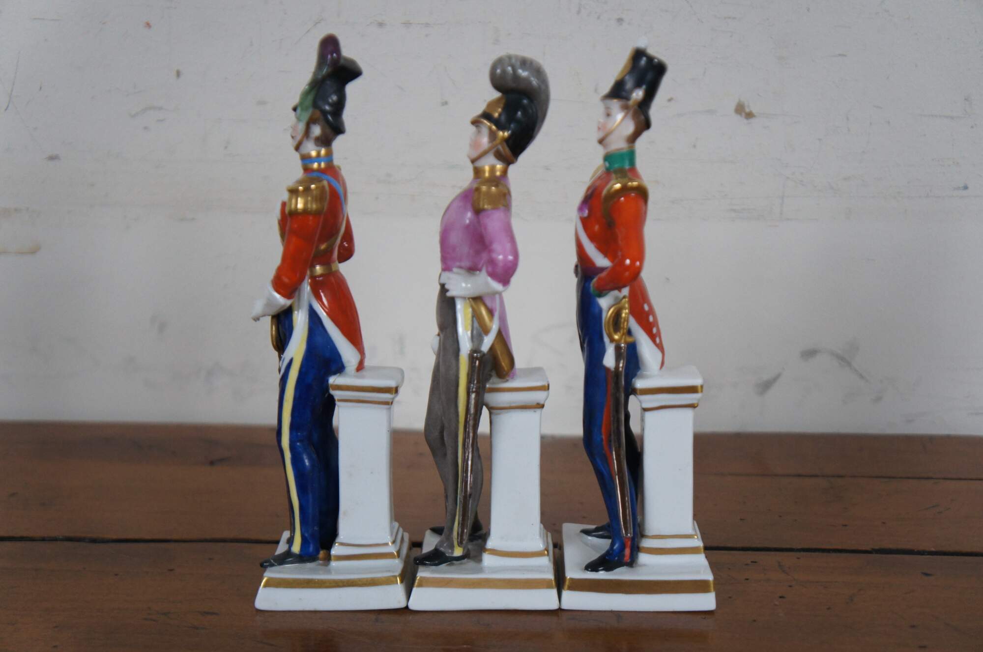 Set of three hand painted German porcelain soldier figurines standing against pillars, likely by A.J. Uffrecht & Company, marked with a gold anchor on the back and “Germany” with a five point crown over an N on the base.