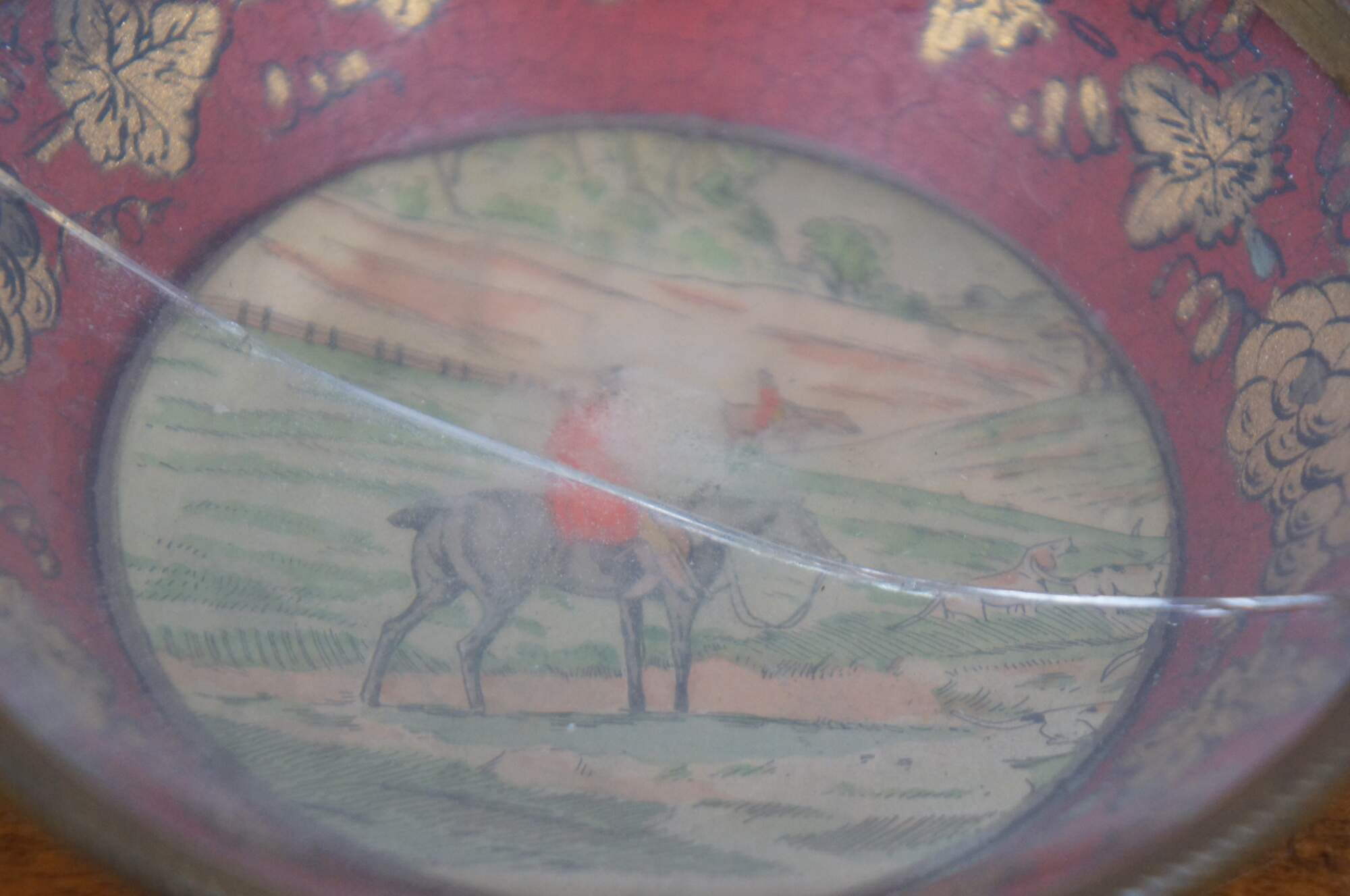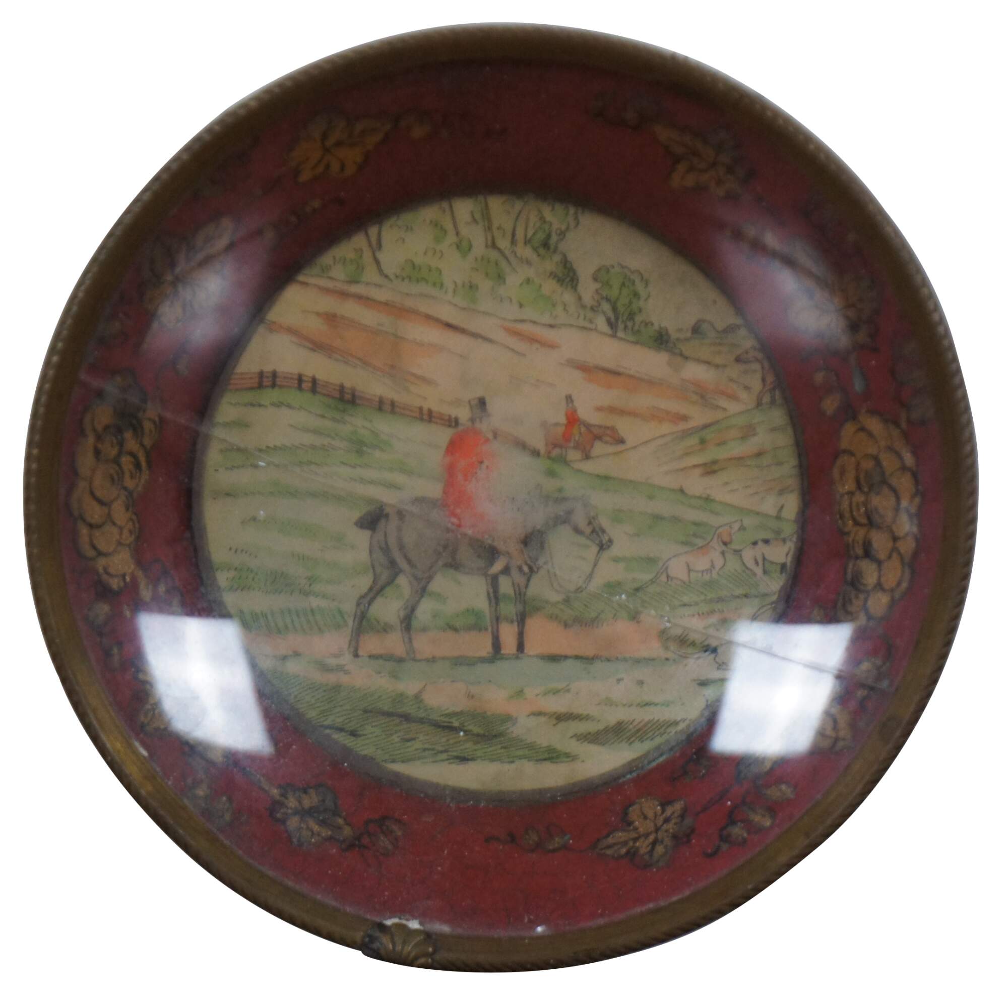 Antique Chinoiserie red and gold floral painted metal dish with a fox hunt scene in the center, with brass edge and glass cover.