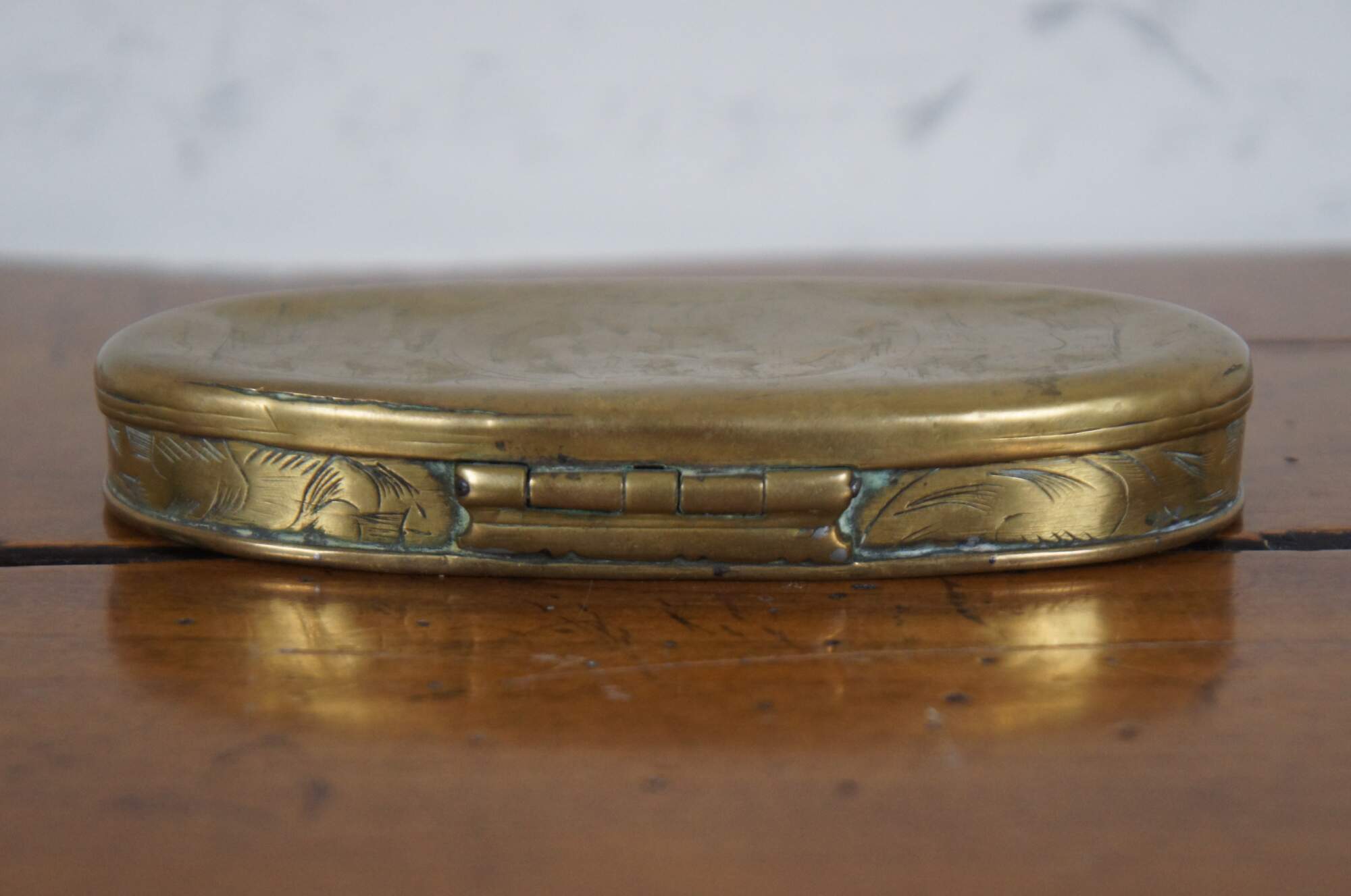 Antique Dutch 18th century oval shaped brass tobacco snuff box with hinged lid, engraved with a low relief pattern of two figures flanked by angels.