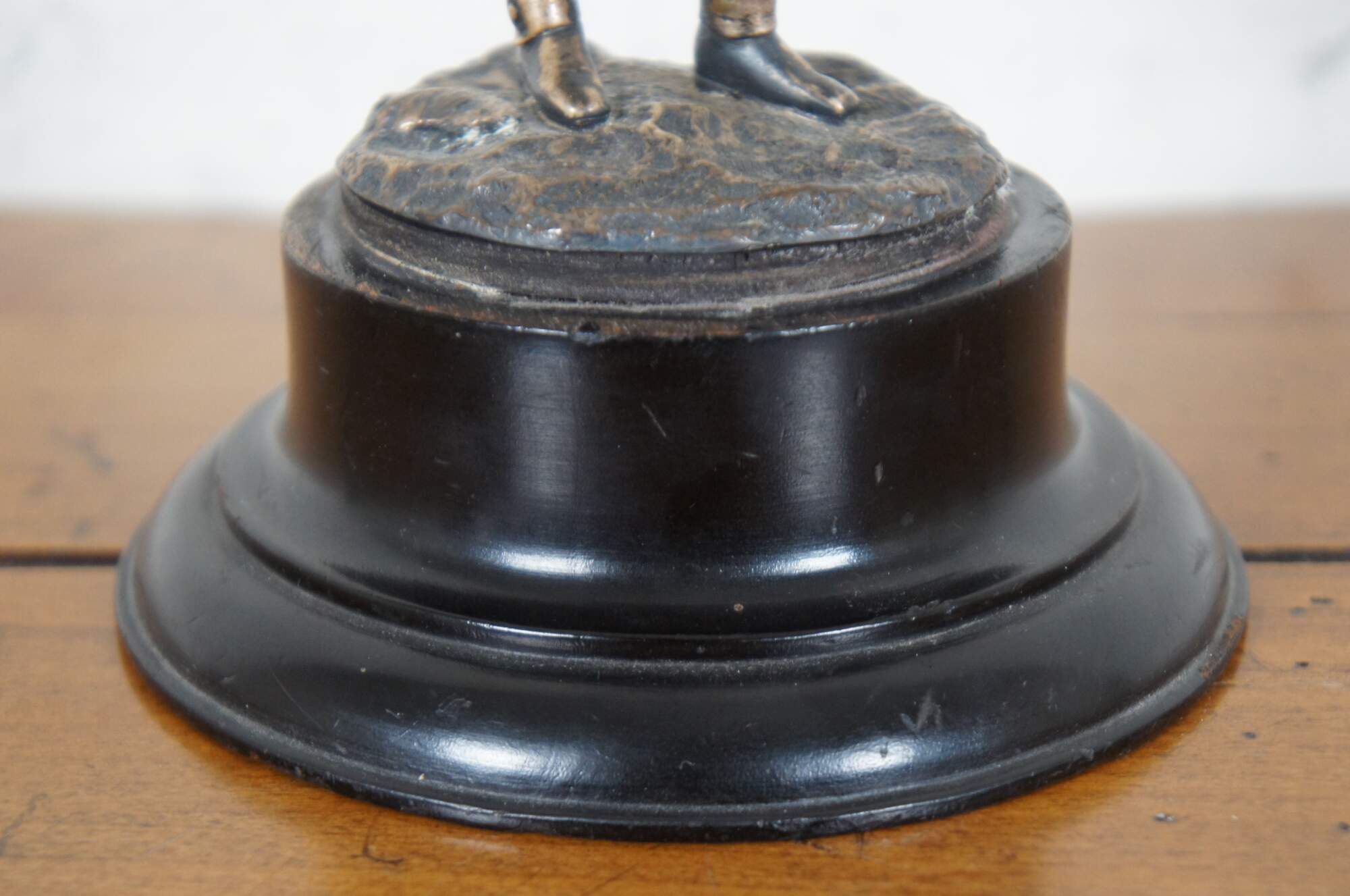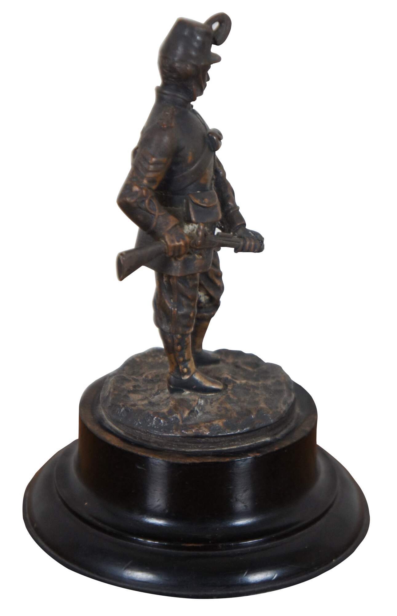 Antique bronze American Revolutionary War soldier figurine or statue featuring a Infantry Field Officer (Colonel) dressed in traditional military attire from the time with sword, holding a rifle / shotgun, mounted on a round wood base.