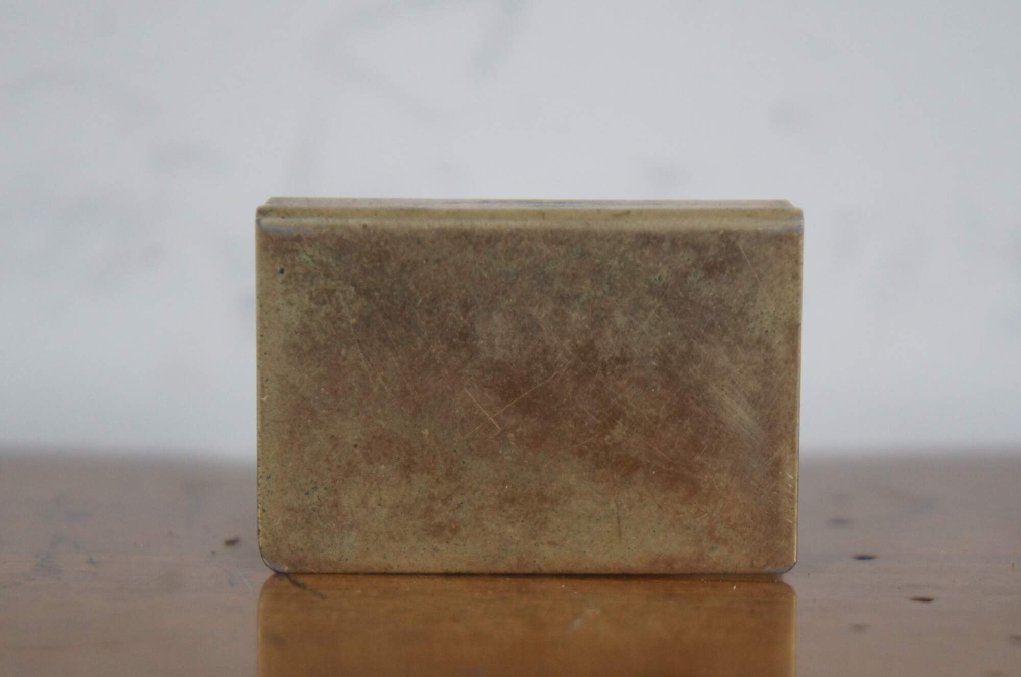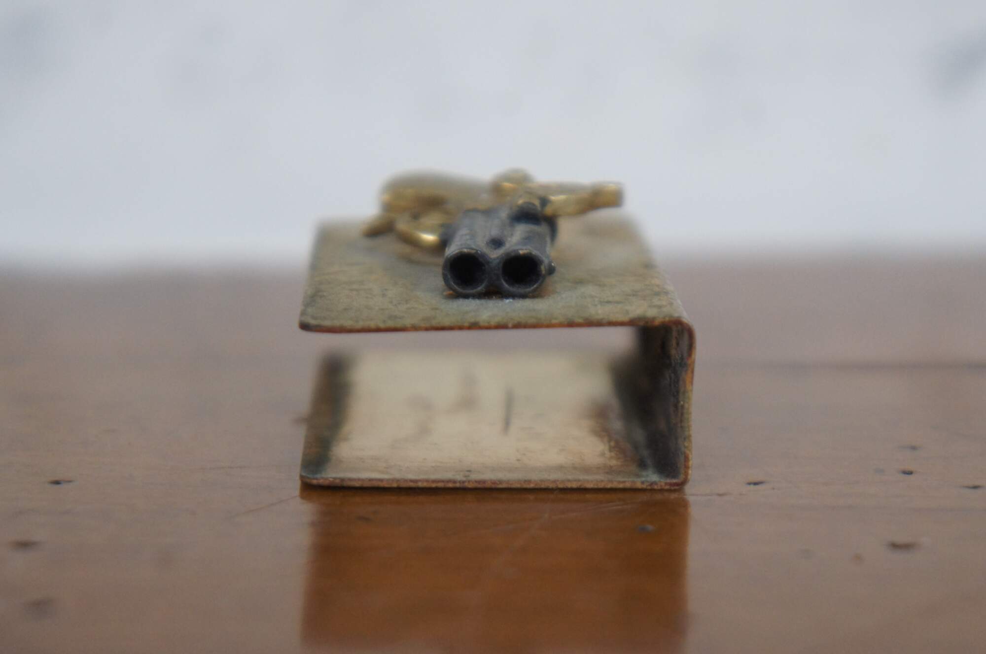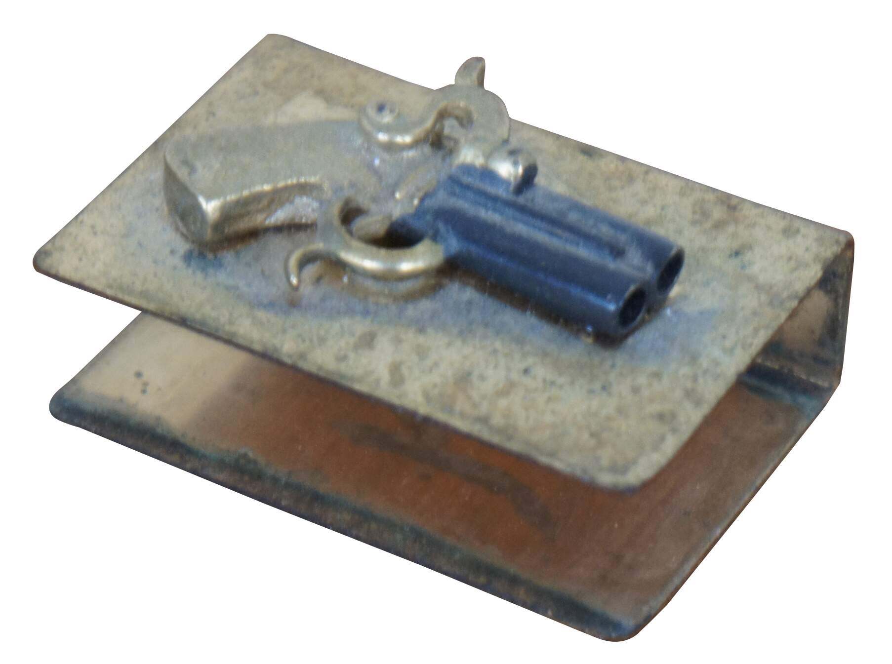 Antique brass pocket sized matchbox holder decorated with a three dimensional flintlock pistol.