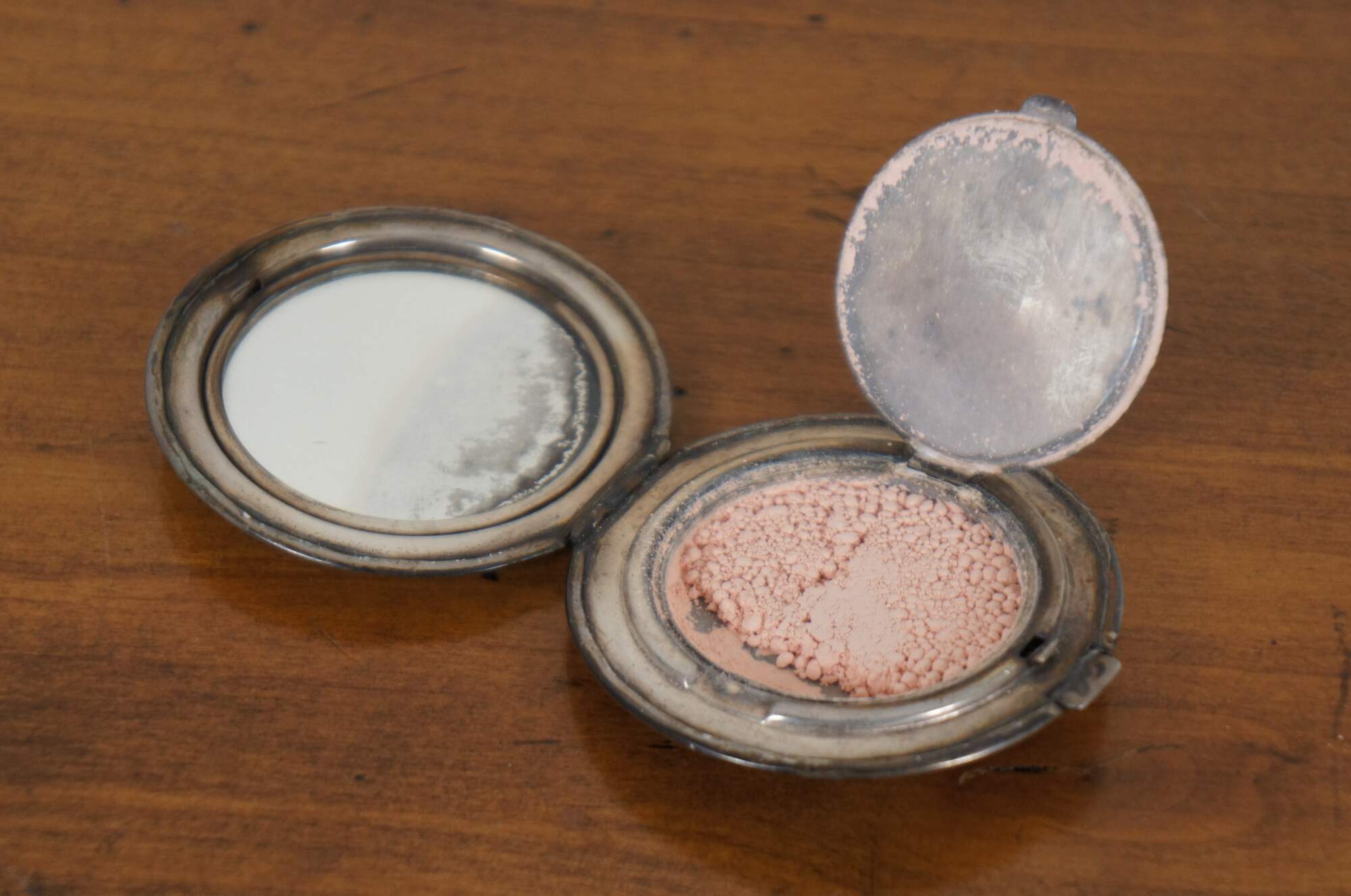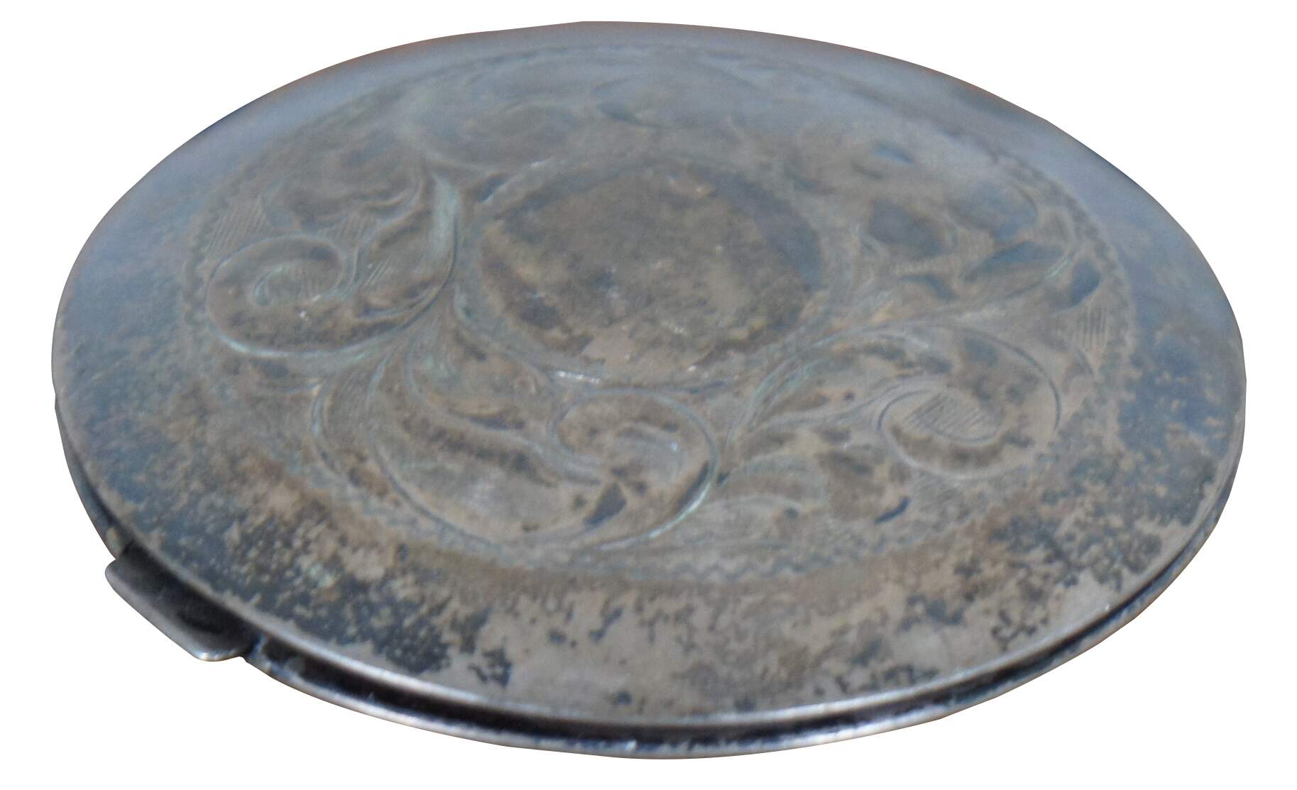 Antique floral engraved sterling silver compact mirror with flat puff and separate compartment for powder. Marked Sterling Ecco.