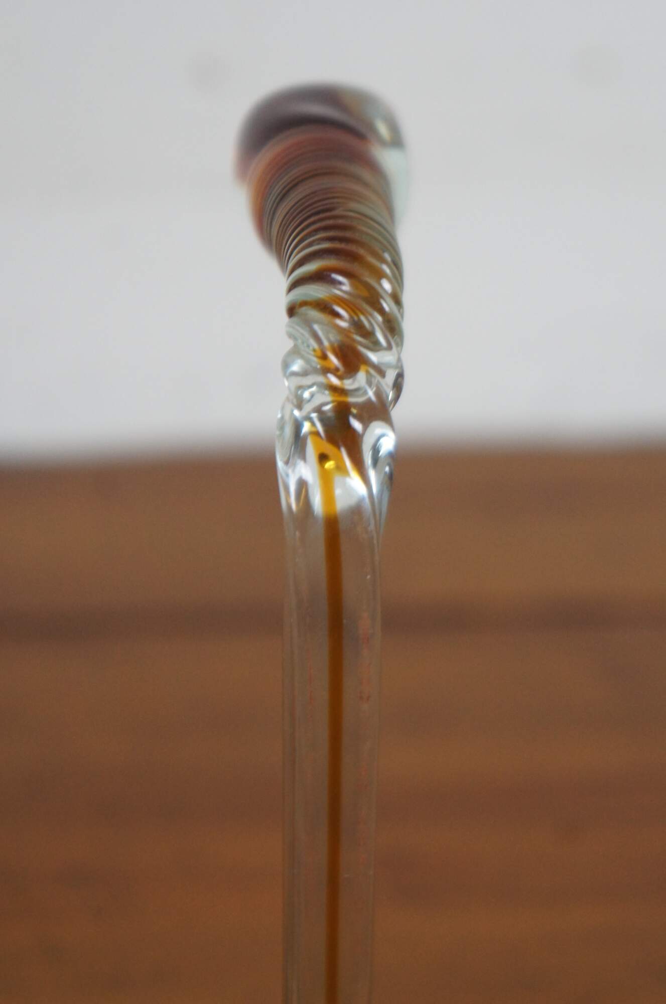 Victorian hand blown art glass End-of-Day walking stick or parade cane in clear glass with a brown or amber core, with a twisted shape at the handle and the base. Considering its length it is a very rare find in this style.