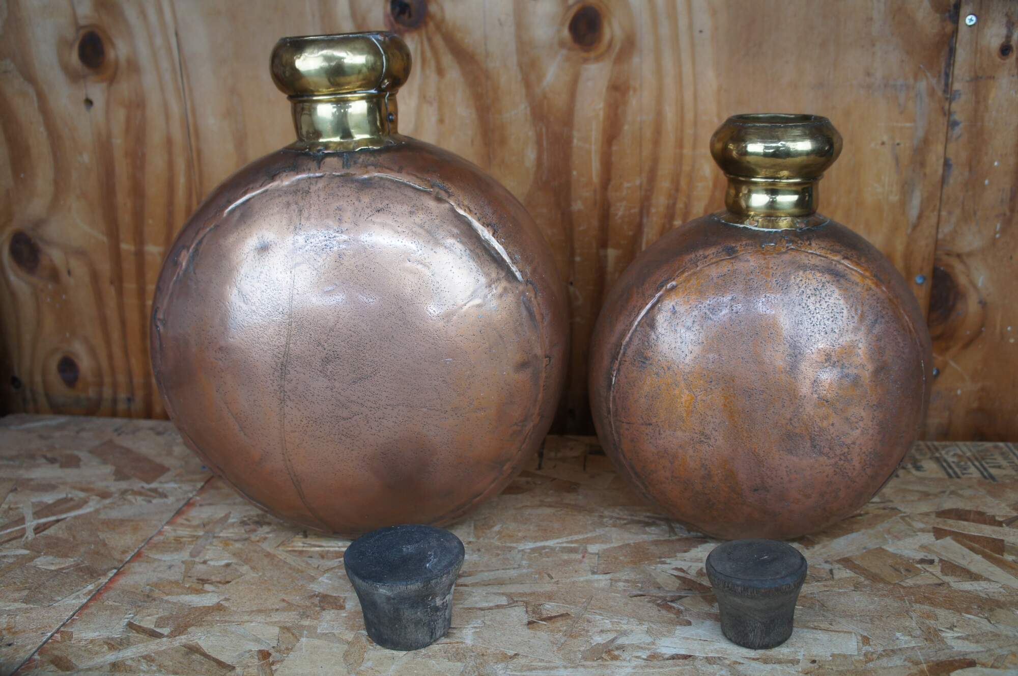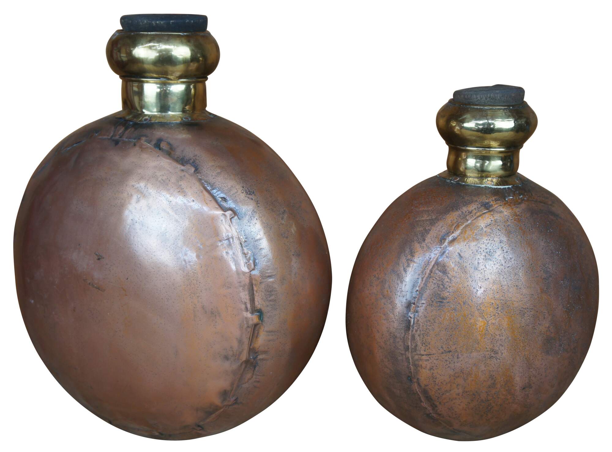 Two large vintage copper canister jugs, bottles or vases featuring cork stopper and dovetailed accents. From India.