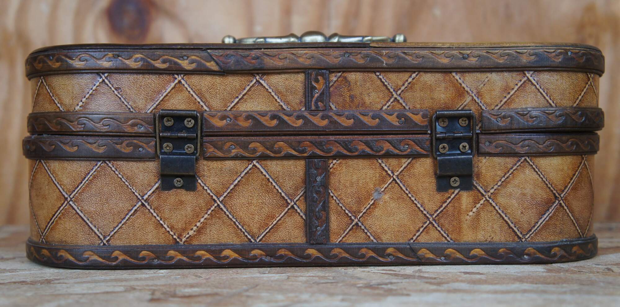 Vintage oval lidded box or case featuring brass folding handle and clasp.