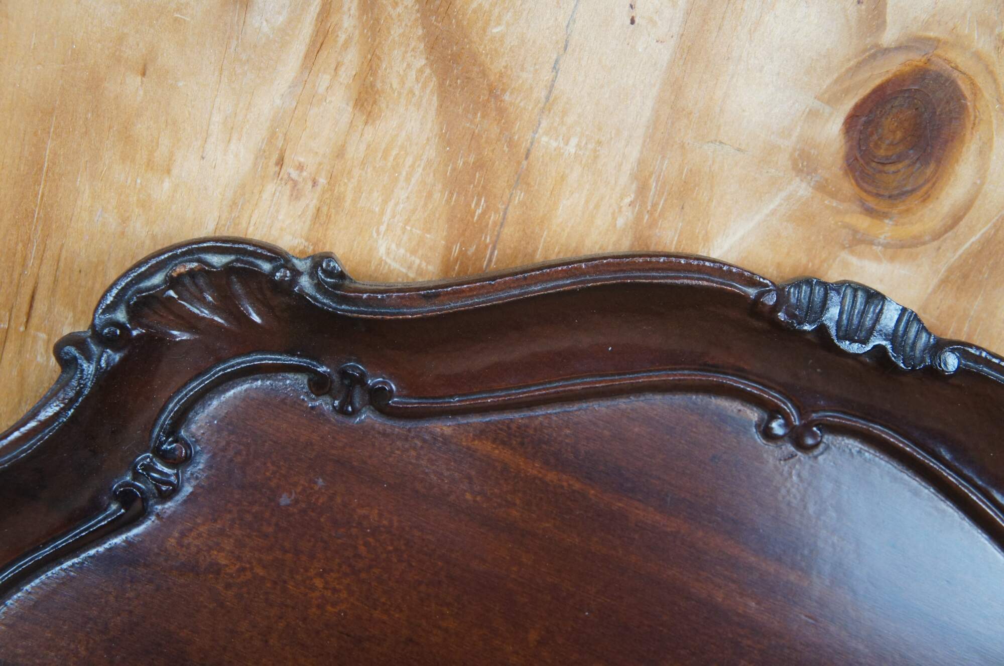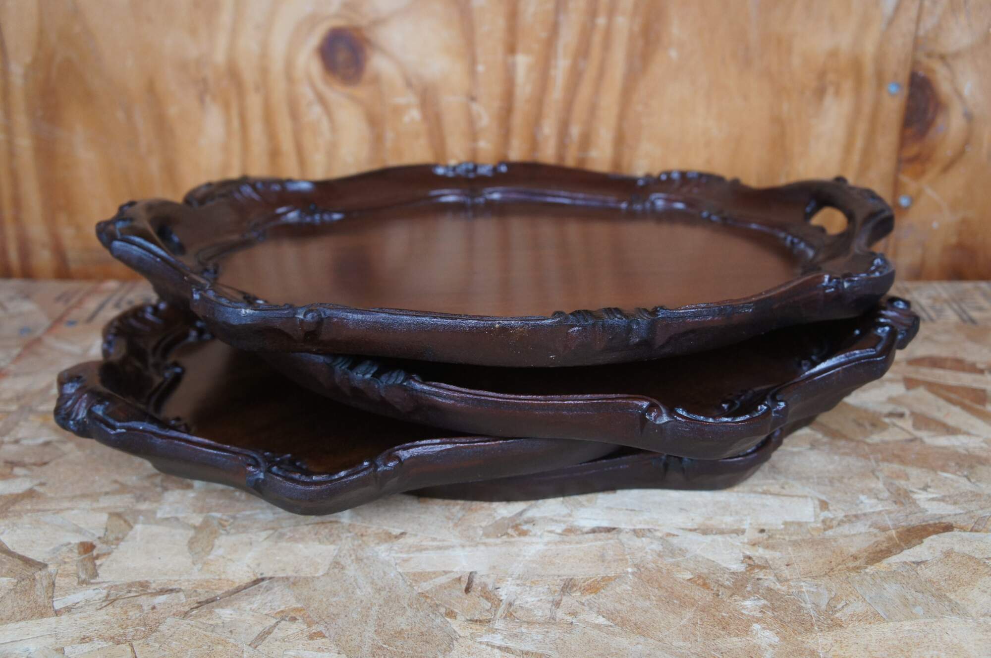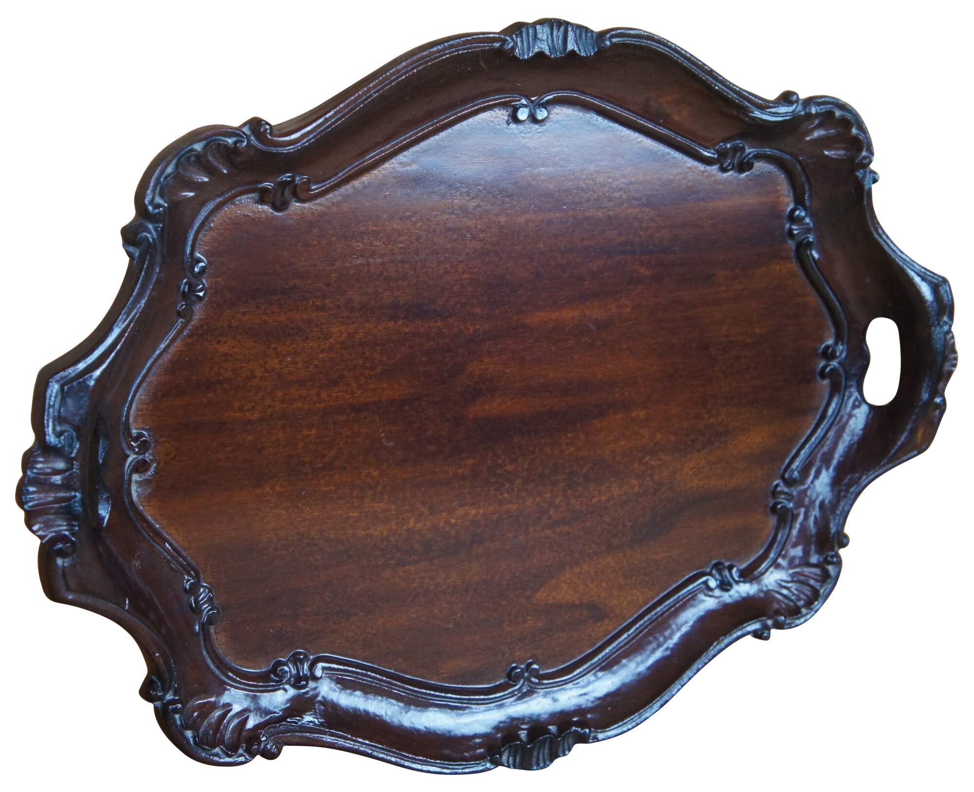 Four vintage Neiman Marcus Rococo or Baroque style mahogany bar, coffee or tea trays featuring ornate scalloped form with handles. Made in Italy.