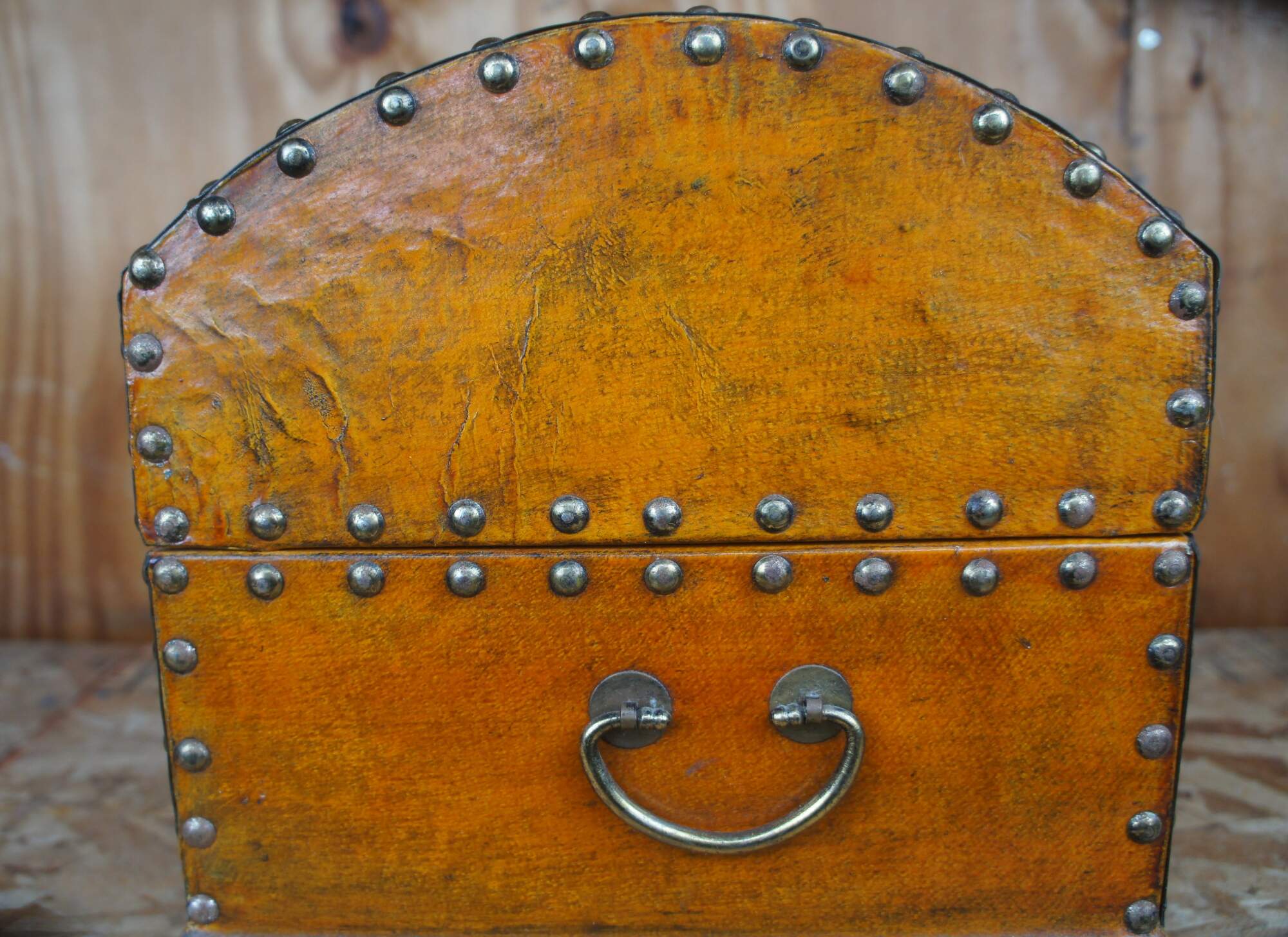 Vintage dome top leather chest, letter, keepsake, jewelry, storage lock box featuring footed base with nailhead accents, brass banding, Chinese lock, and black lacquered interior.