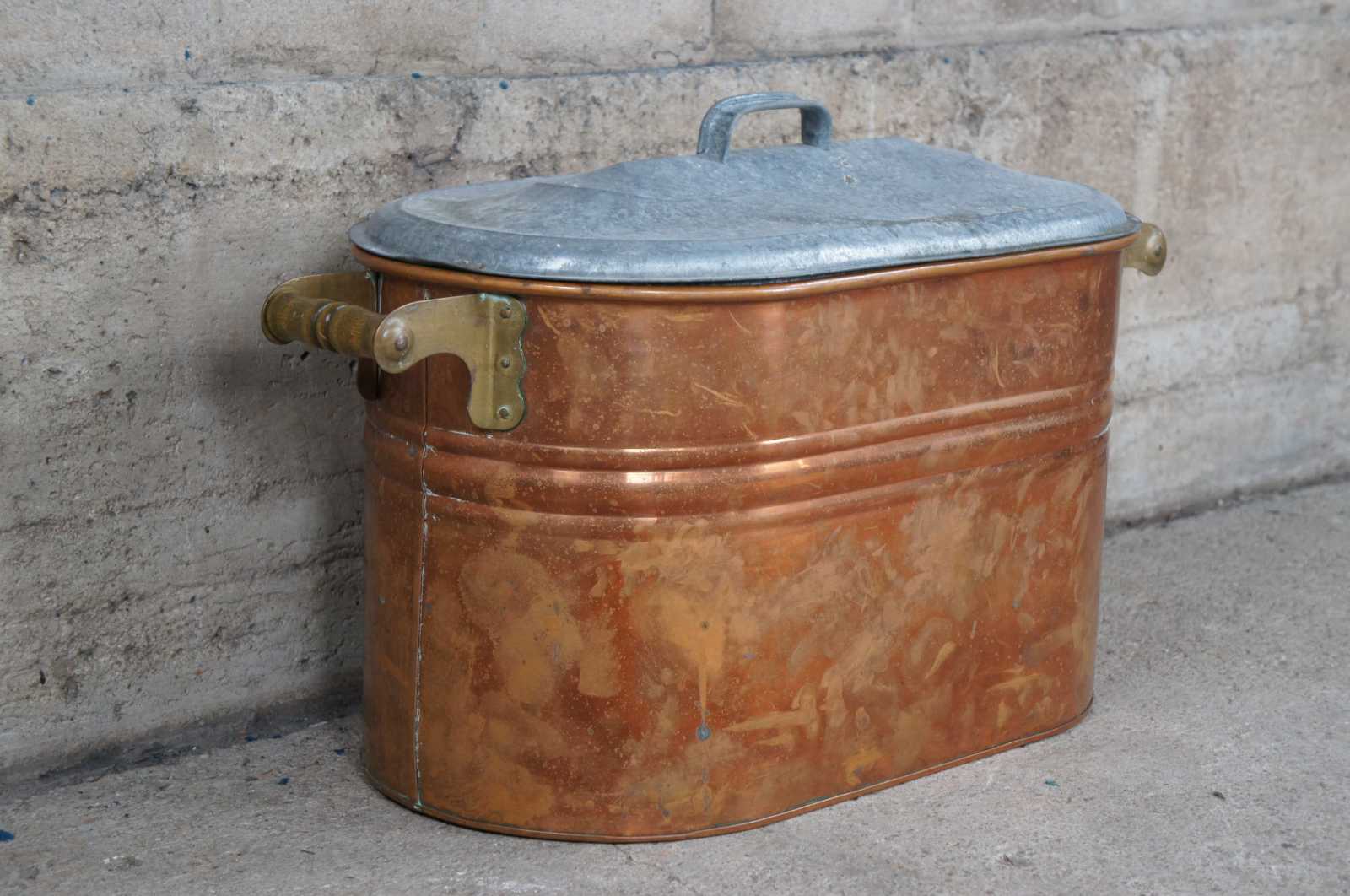 Antique copper boiler, firewood bin or wash tub with lid and wood handles.