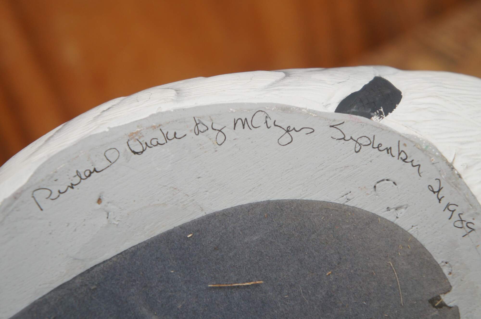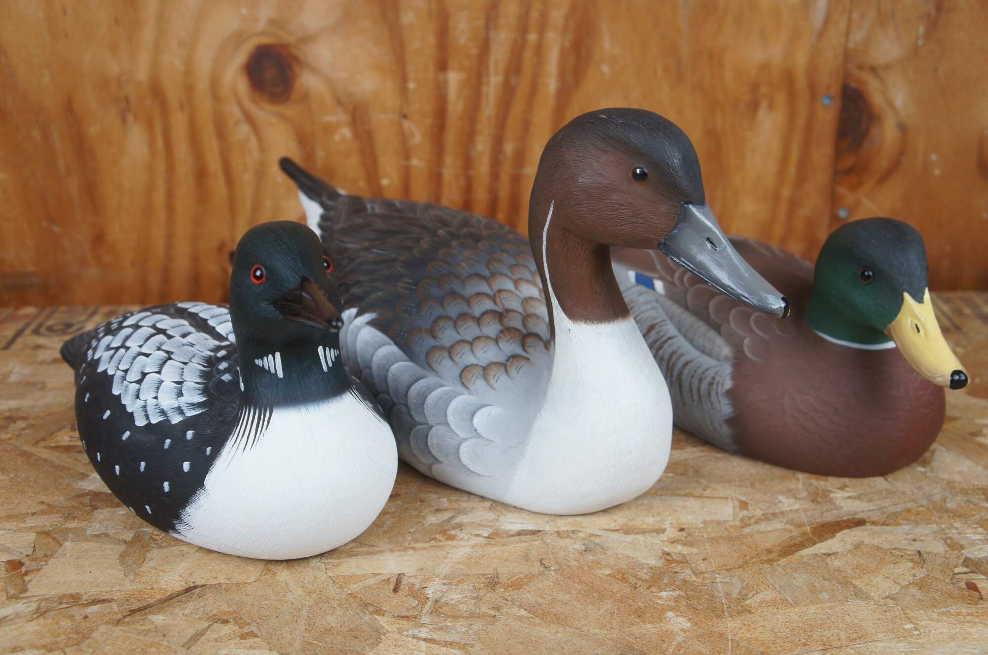 Three vintage signed duck decoys including: mallard drake signed W Downs (for Rosella) 1989, loon signed L Lightfoot 1990, and pintail drake signed September 1989. One of the ducks was made by Craft Tex Inc in High Point NC for the American Wildlife Collection, circa 1985. Another has a 1983 mark.