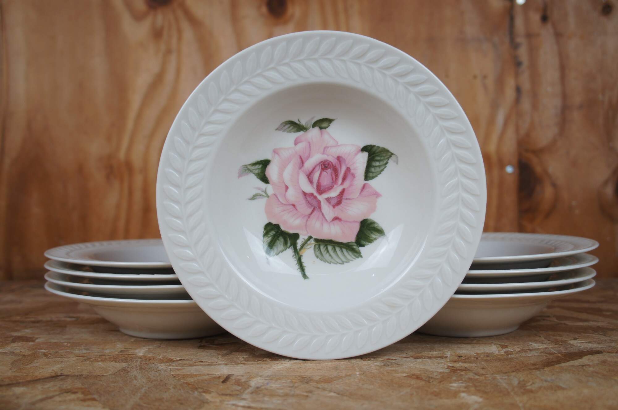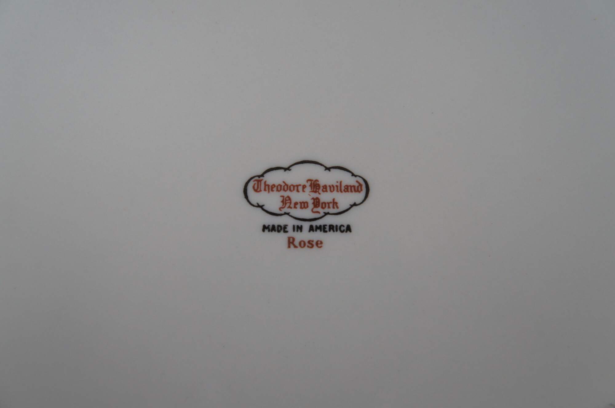 Vintage 70 piece Theodore Haviland New York china set in the Regents Park Rose pattern depicting a single large pink rose and raised wreath rim.