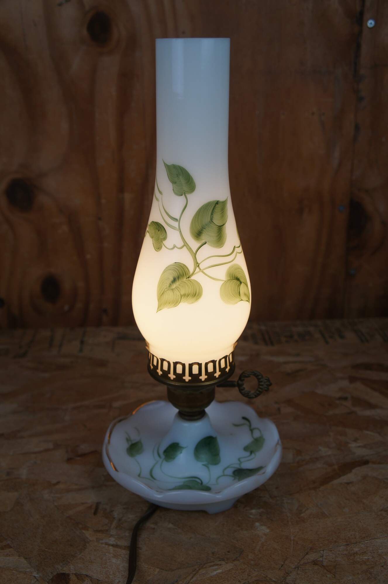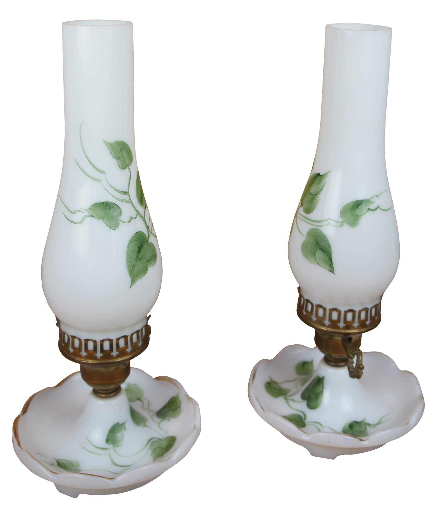 Two vintage mid century hand painted brass and white milk glass desk / library / vanity lamps featuring chamber candlestick style base and hurricane shades with green ivy and vines.