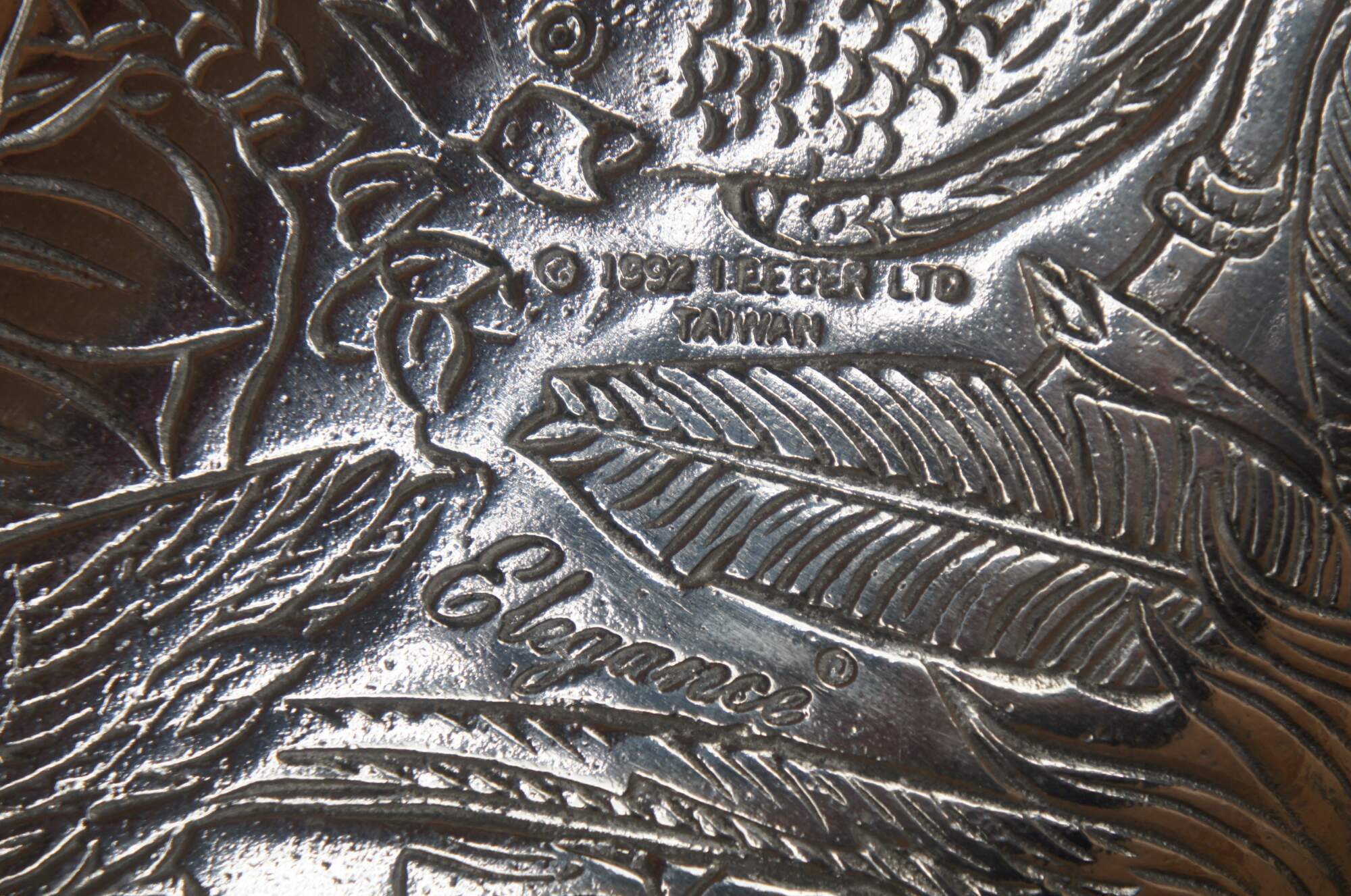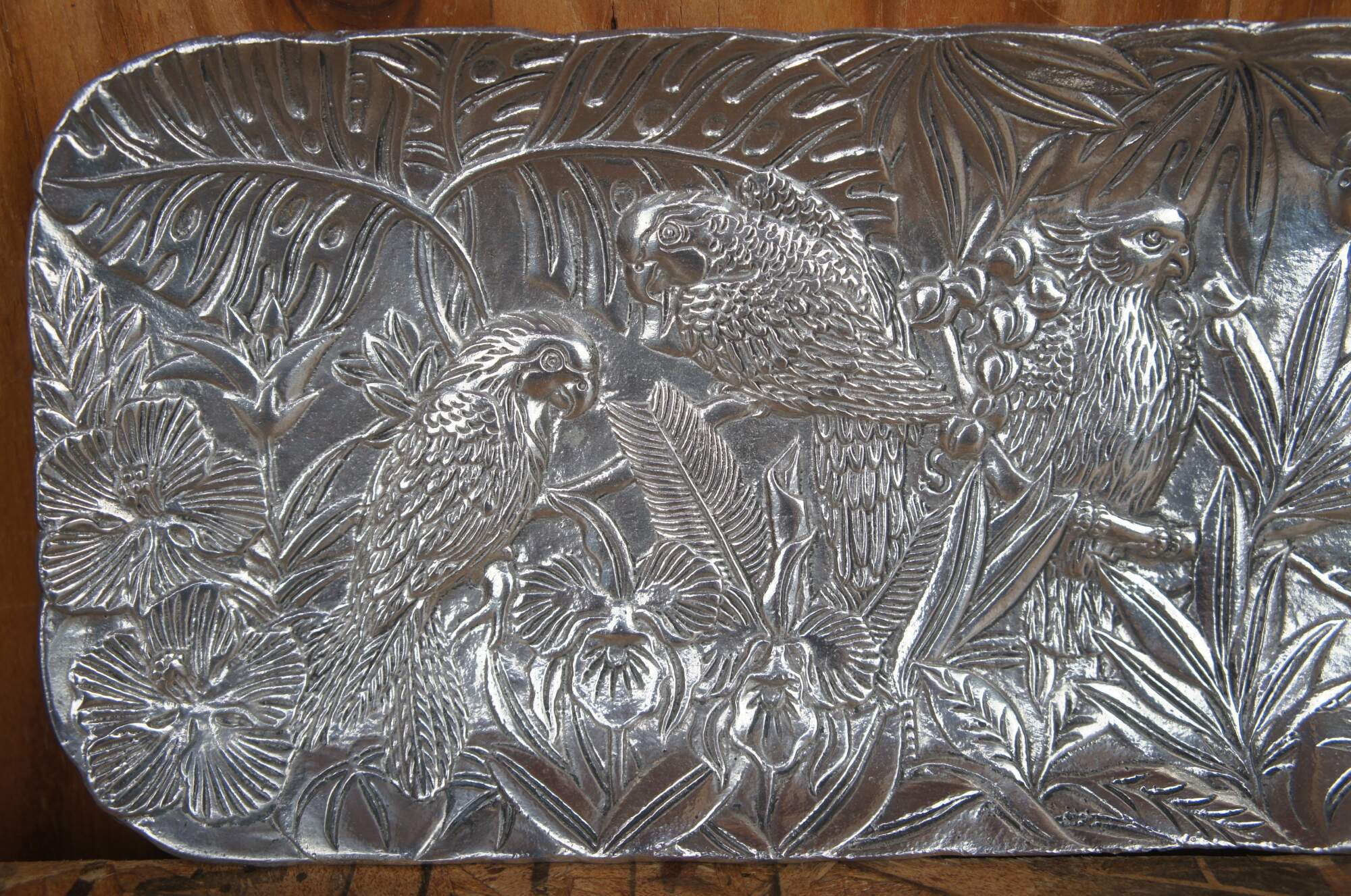 Vintage rectangular metal centerpiece tray or platter by Leeber Elegance of Taiwan, featuring a low relief landscape of Parrots / Macaws / birds in the jungle.