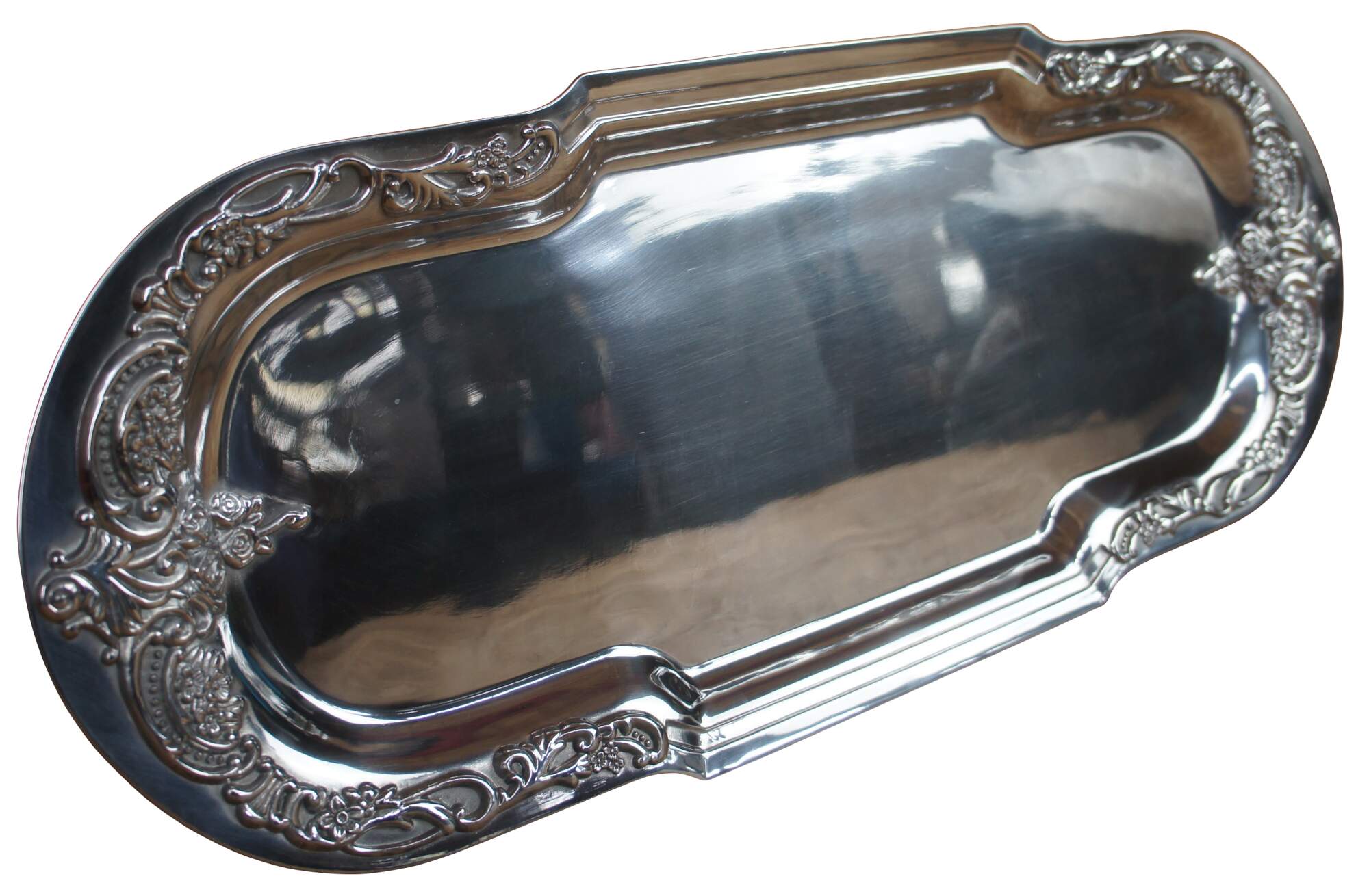 Vintage long oval silverplate tray or platter by Wallace featuring the Grande Baroque pattern. Includes original box.