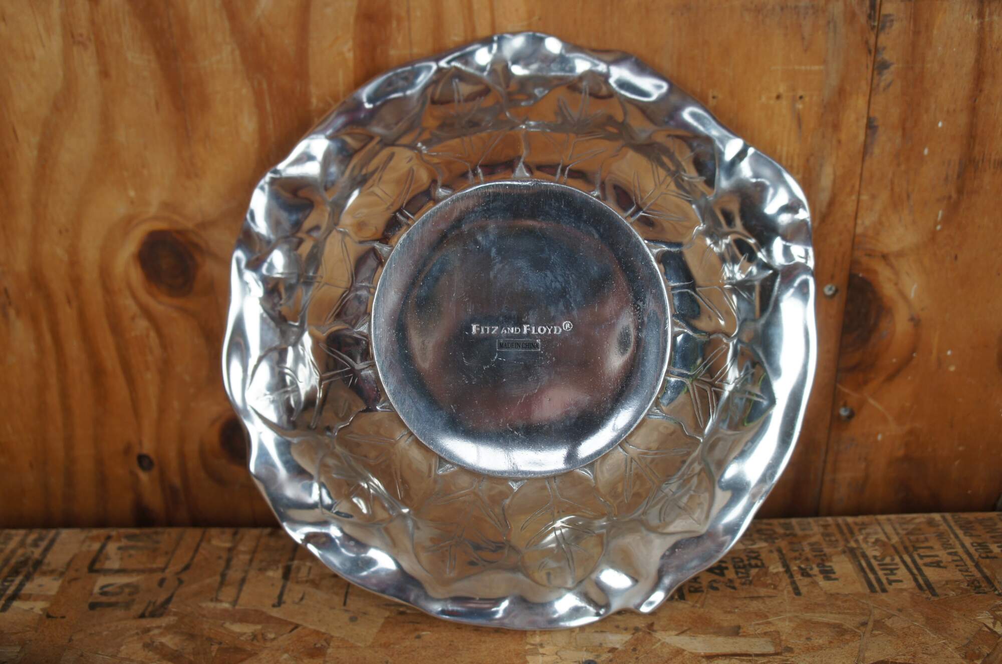 Fitz and Floyd metal aluminum bowl or dish with repousse floral and leaf design.