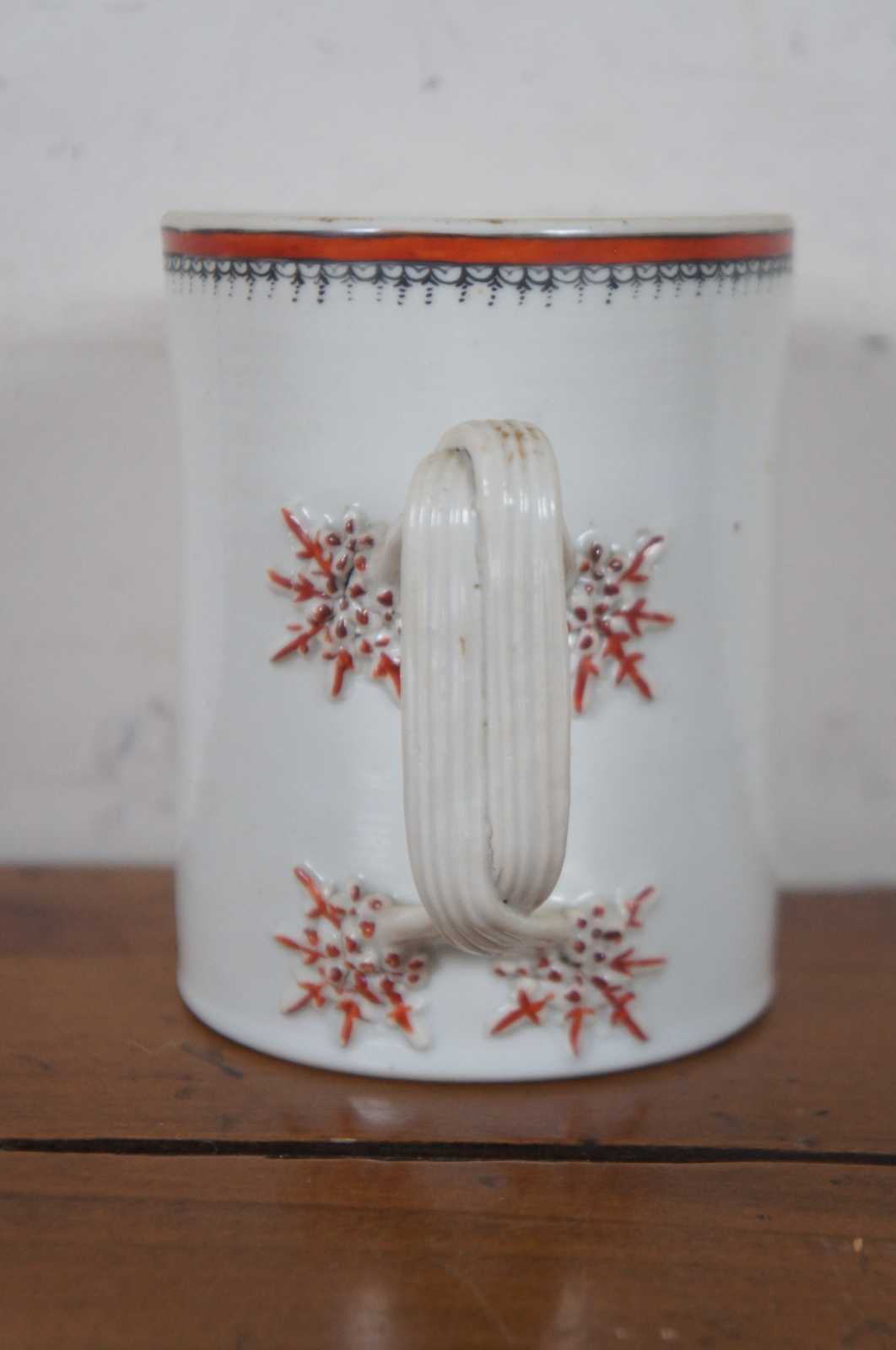 Antique late 18th century (Qianlong Period, circa 1780) Chinese Export porcelain tankard with floral and armorial coat of arms / crest with bird / hawk / eagle.