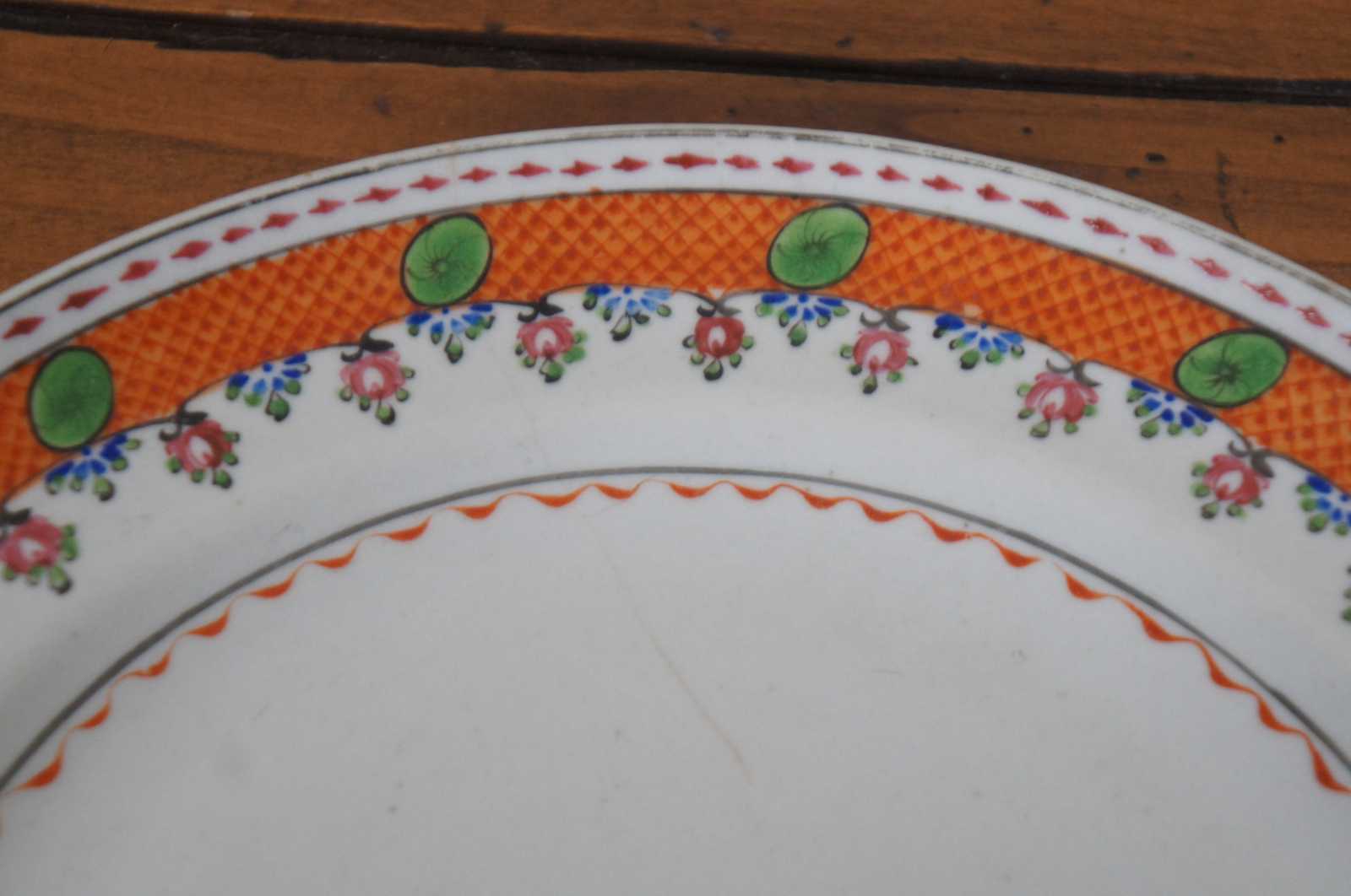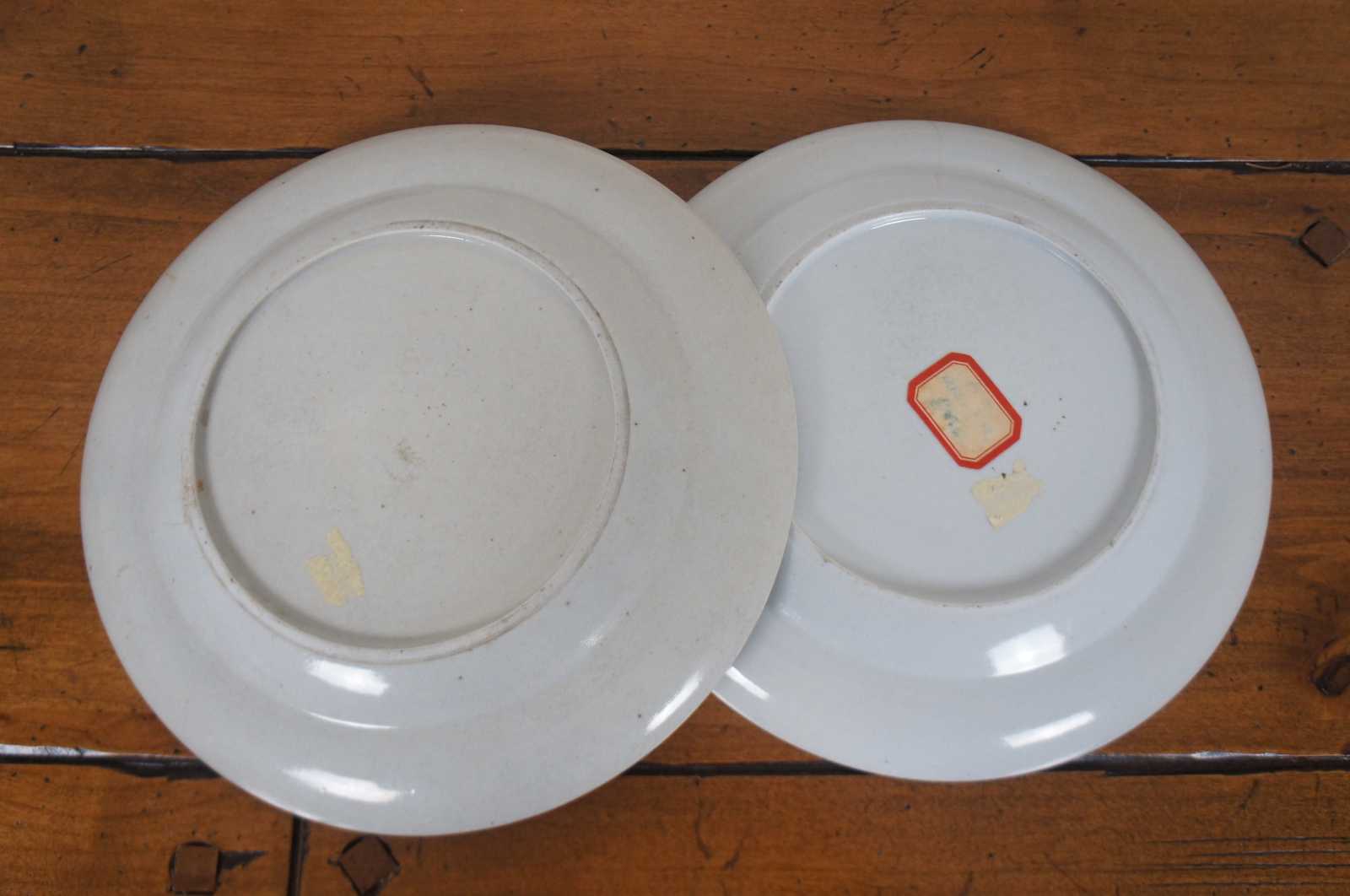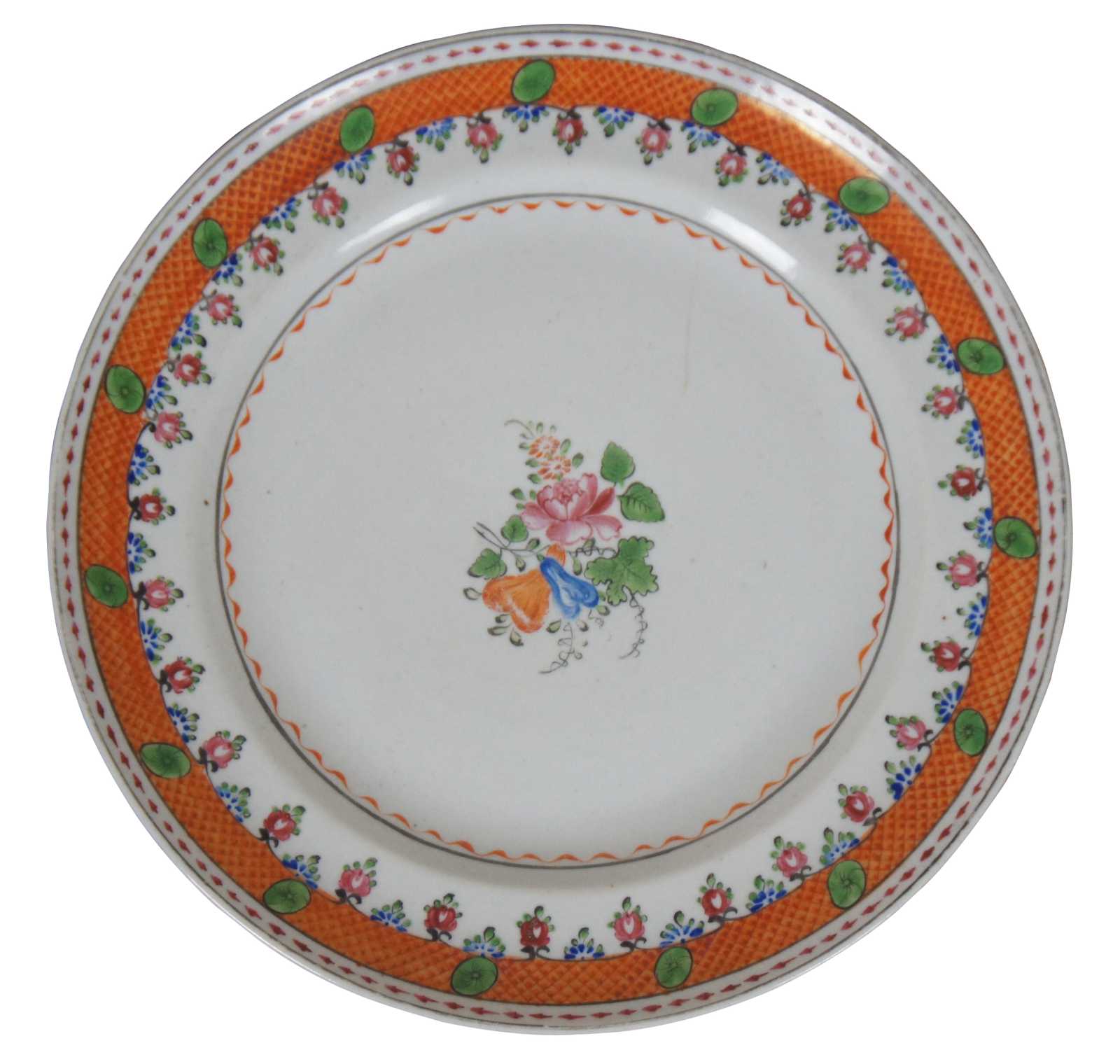 Pair of antique late 18th century to early 19th century Chinese export Qing (Qianlong Period, circa 1780) porcelain dinner plates with hand painted famille and lattice motifs.