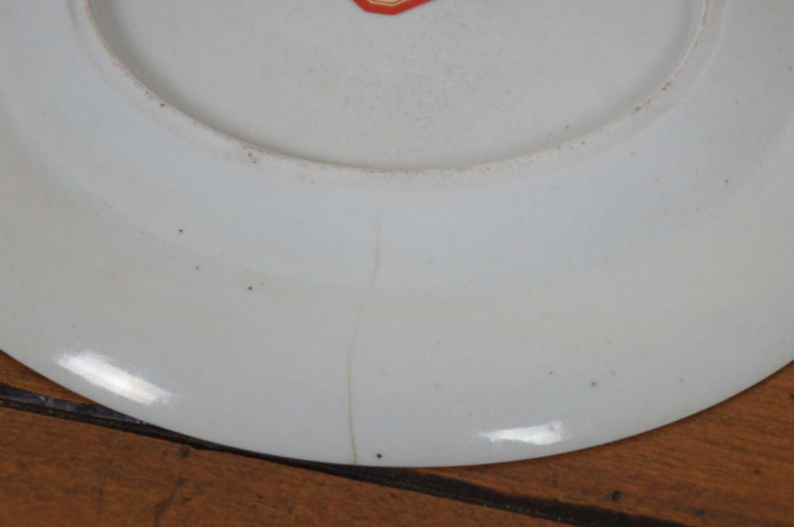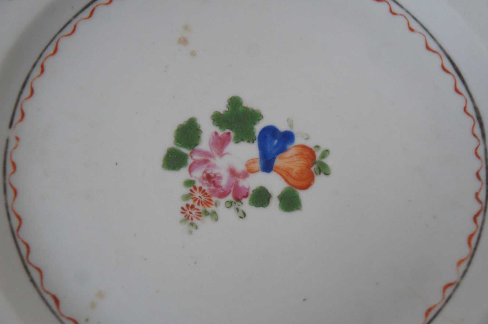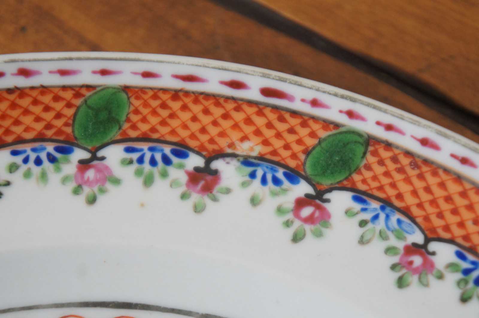 Pair of antique late 18th century to early 19th century Chinese export Qing (Qianlong Period, circa 1780) porcelain dinner plates with hand painted famille and lattice motifs.