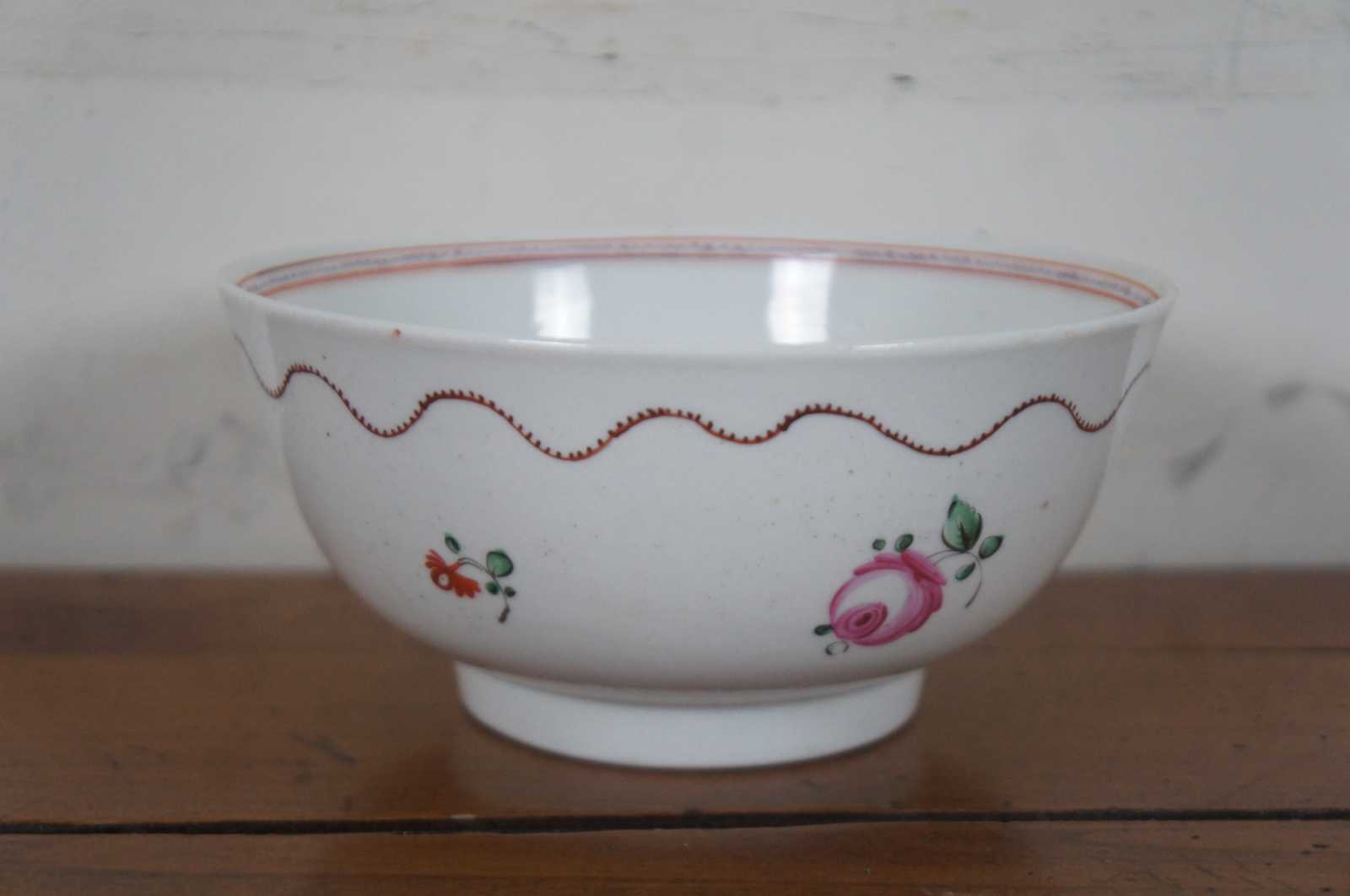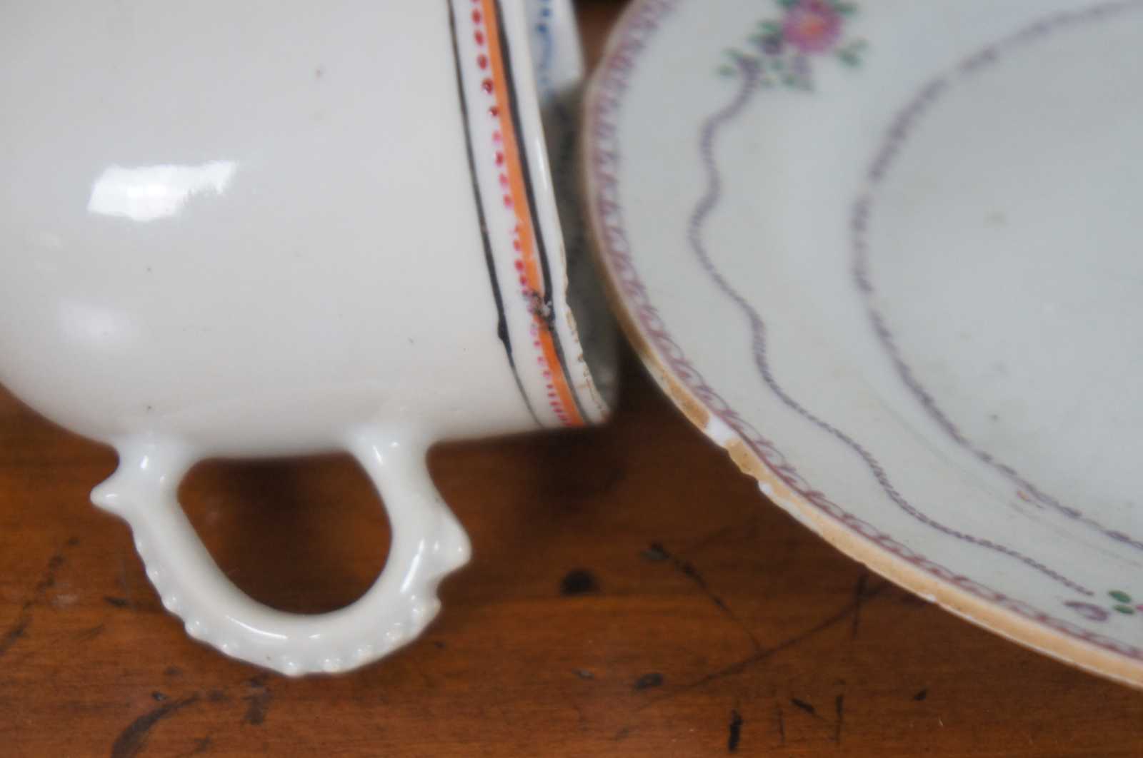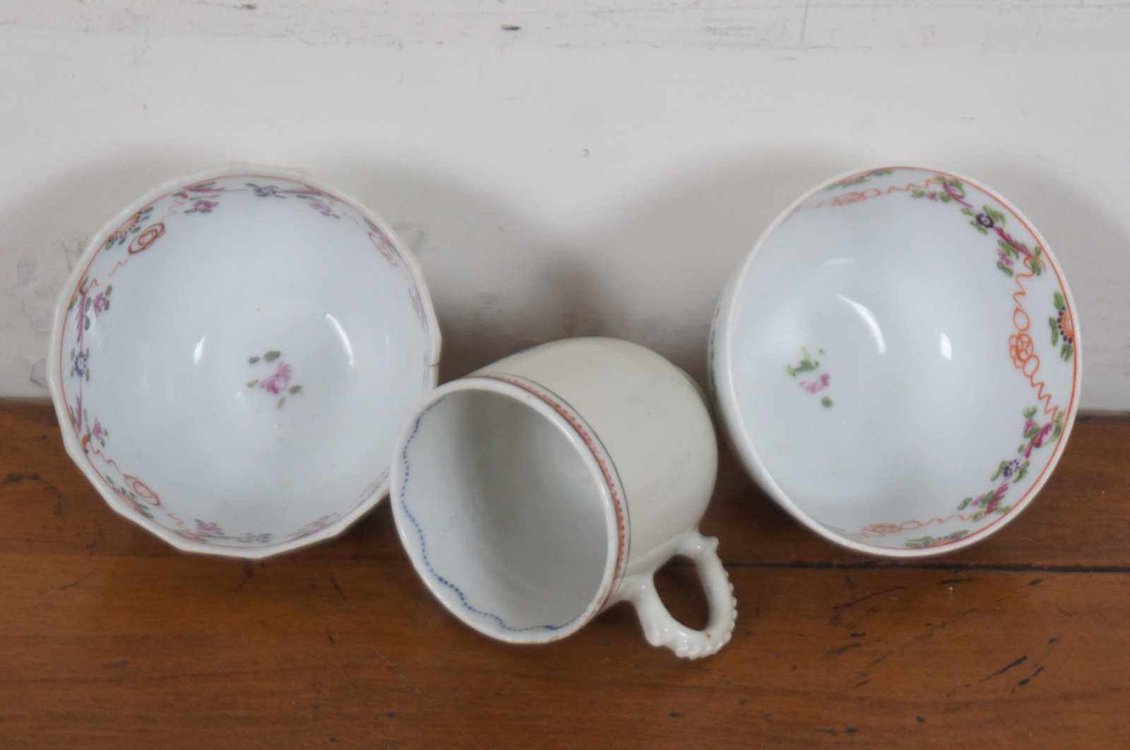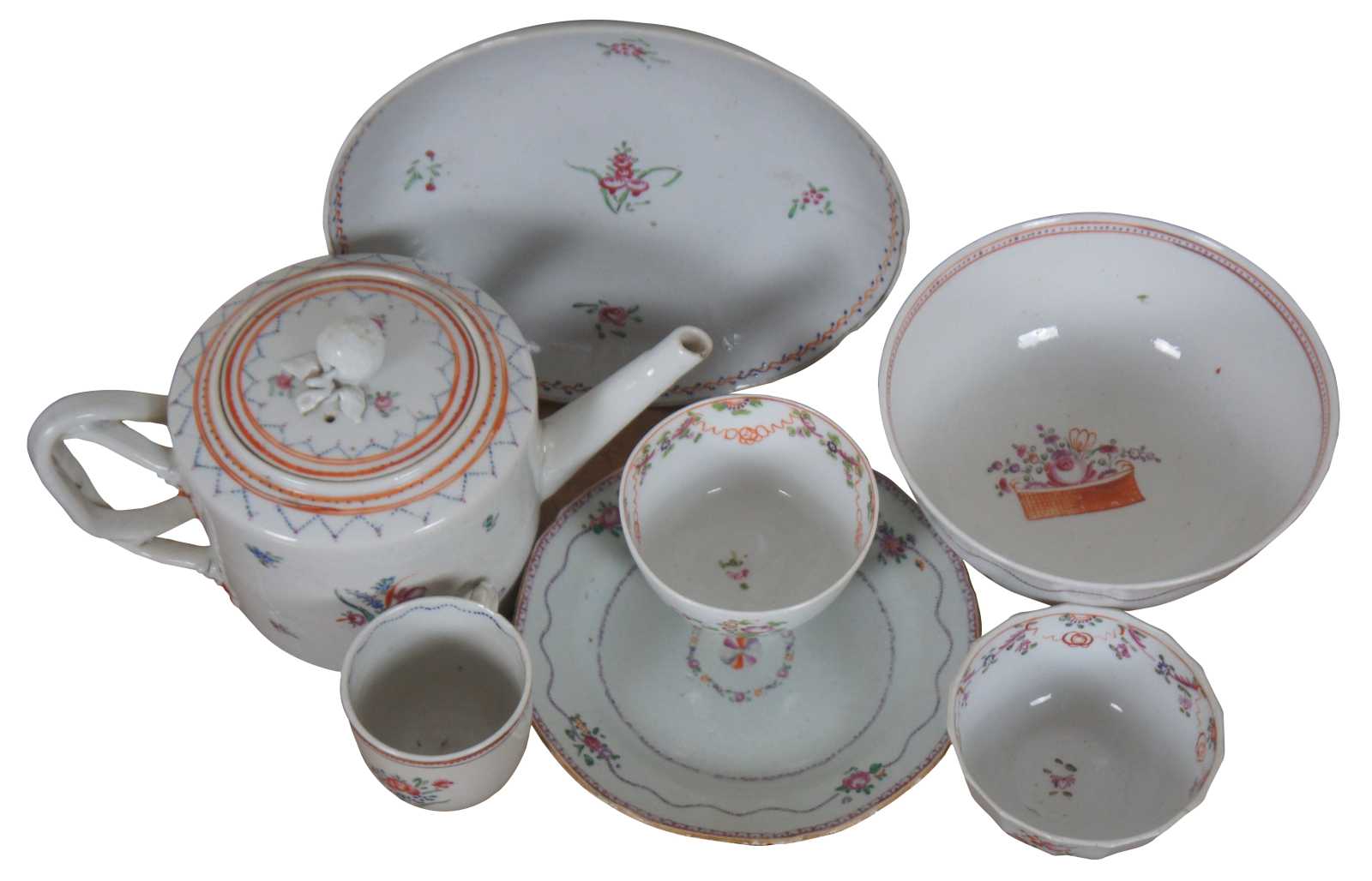 Lot of eight late 18th to early 19th century Chinese Export (Qianlong Period, circa 1780) porcelain serving pieces with hand painted floral and swags. Features teapot, tea / coffee cups, plate, soup bowl and shallow bowl.