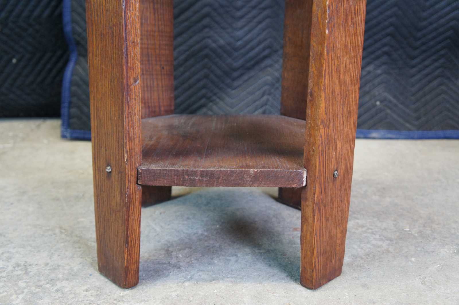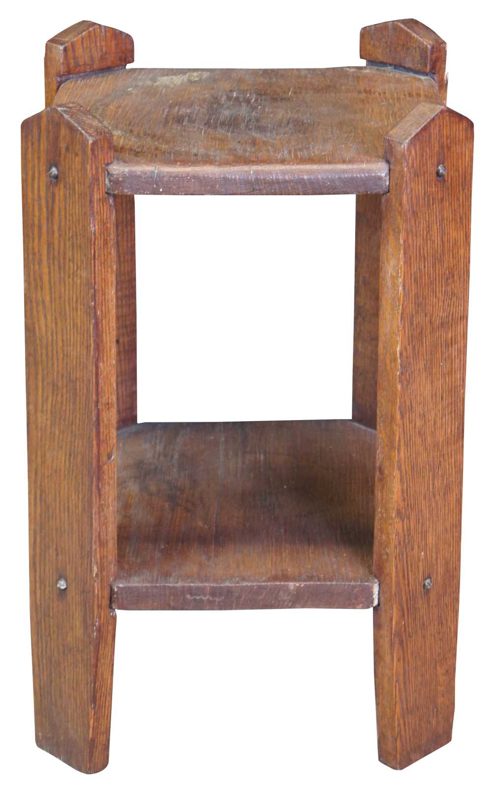 Early 20th century mission plant stand. Made from oak with an open two tier design. Supported by spear or fence shaped supports.
