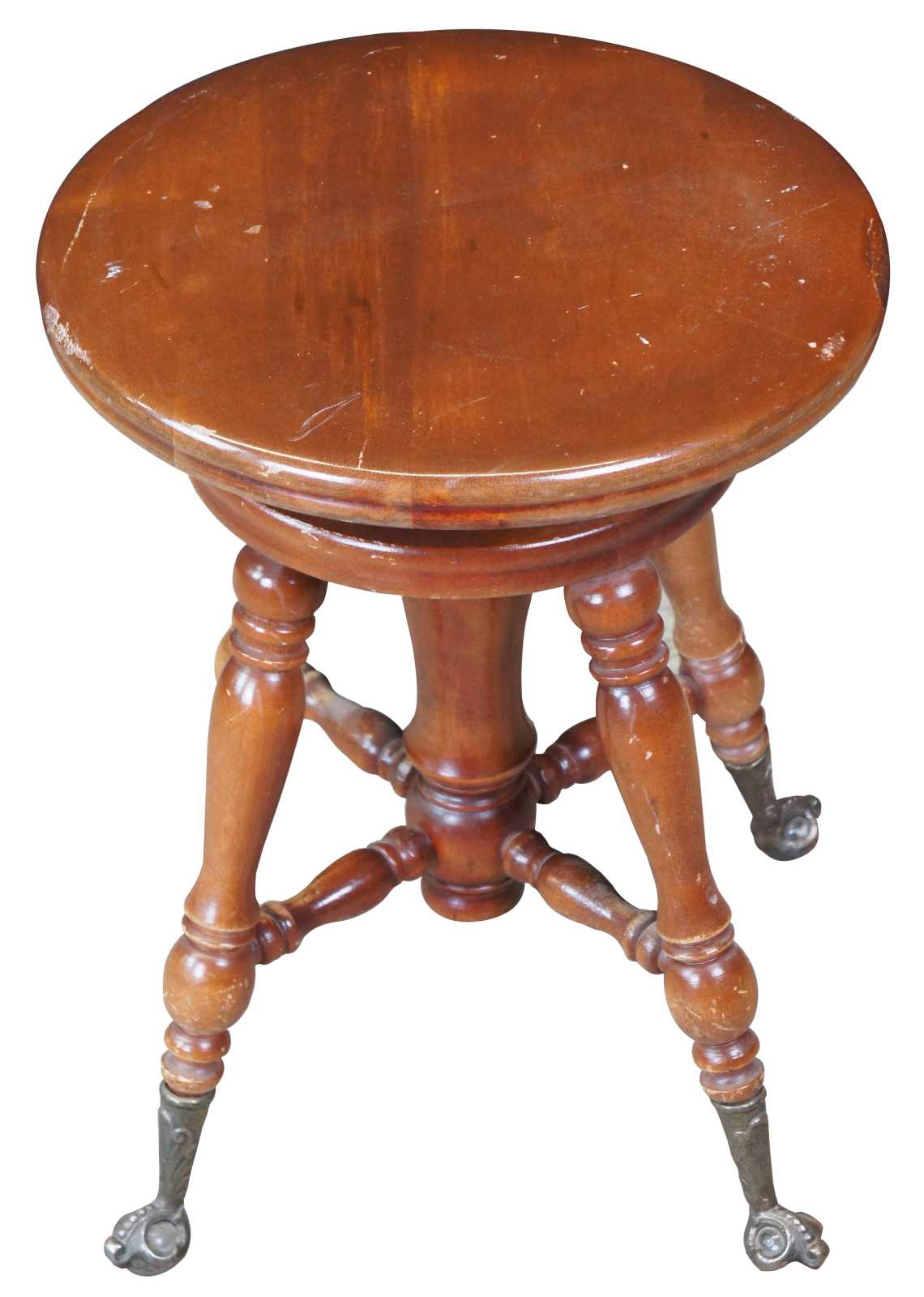 Racine Mfg. Co piano stool. Circa 1909-1925. A classic Victorian design supported by metal talon feet hold glass balls